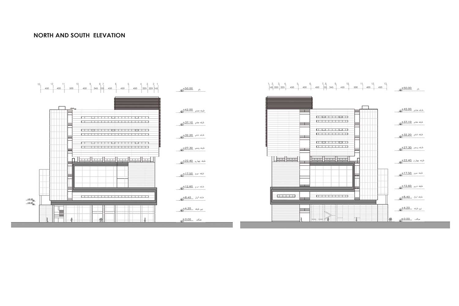 Due to the location and environmental conditions of the building, its view from north to the river of Kan’s valley and Darakeh, from west to the Goftegoo Park, from east to the green landscape of the center and from south to the landscape and garden of dormitory of Tehran University were considered as the main characteristics of this building which was ignored by employers due to its applicability. The reason is that the condition was considered as a closed box. But with insisting on highlighting them, we turned it to a feature of the project. All the created gaps as terraces or extensions of corridors and the balance of windows were adjusted with a strong potential. Terraces in this project as gaps, are inflection and linking points of different boxes which are subordinate to those spaces. On the other hand, they are there is a link between the building and its surrounding land and also the city which are glaring as grooves in the whole view of the building. To provide those people who are inside the buildings with the sight of the landscape of surroundings, two parallel strips were considered as windows. On the western side, louver windows with low width were considered that control the amount of light and maintain the proper sight for users. In order to create a space in accordance with human needs along with business needs, a terrace was created on the eastern side of the building, which has an overlook to the lush landscaping of the center, and specific floors were associated with them by longitudinal terraces. Moreover, some external stairs from the walls of the courtyard can have access to this courtyard and there are 4 bridges with 1-meter width which are extracted toward the area and is a place for employees to rest and relax. Harmonic Trend [L] evaluated different topics of the project with two approaches of Zoom in (Issues of applicability and building’s condition and their evolution with the presence of human) and Zoom out (Urban issues and surroundings and their evolution due to human’s presence) due to its work procedure.