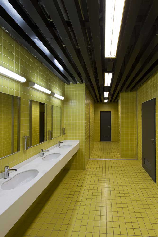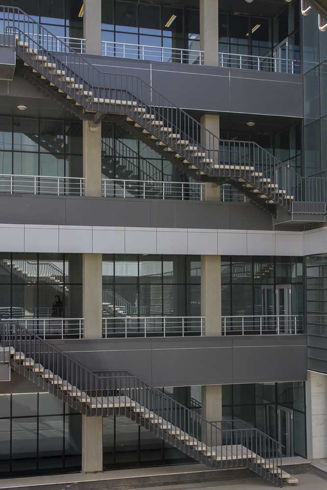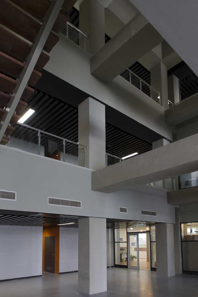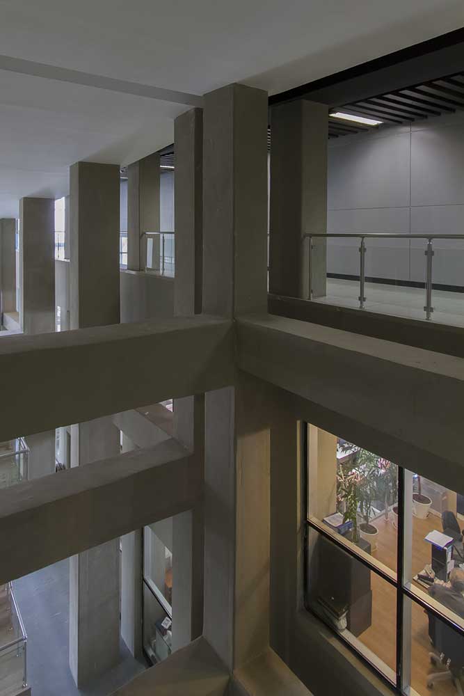 Due to the high density of beams and pillars of the concrete structure of project, it was decided not to cover them; subsequently it was figured that it is possible to polish them in order to make them visible. Moreover, this decision (except for covering beams and pillars), lead to this opportunity to save money and it was when the internal voids of the building were determined. In places where it seems surfaces are more than the actual need of employer, surfaces were considered as voids but in accordance with the application of floors. On the other hand, by creating internal gaps, the project turned into a box with a flow as if all people in different floors were in touch with each other.