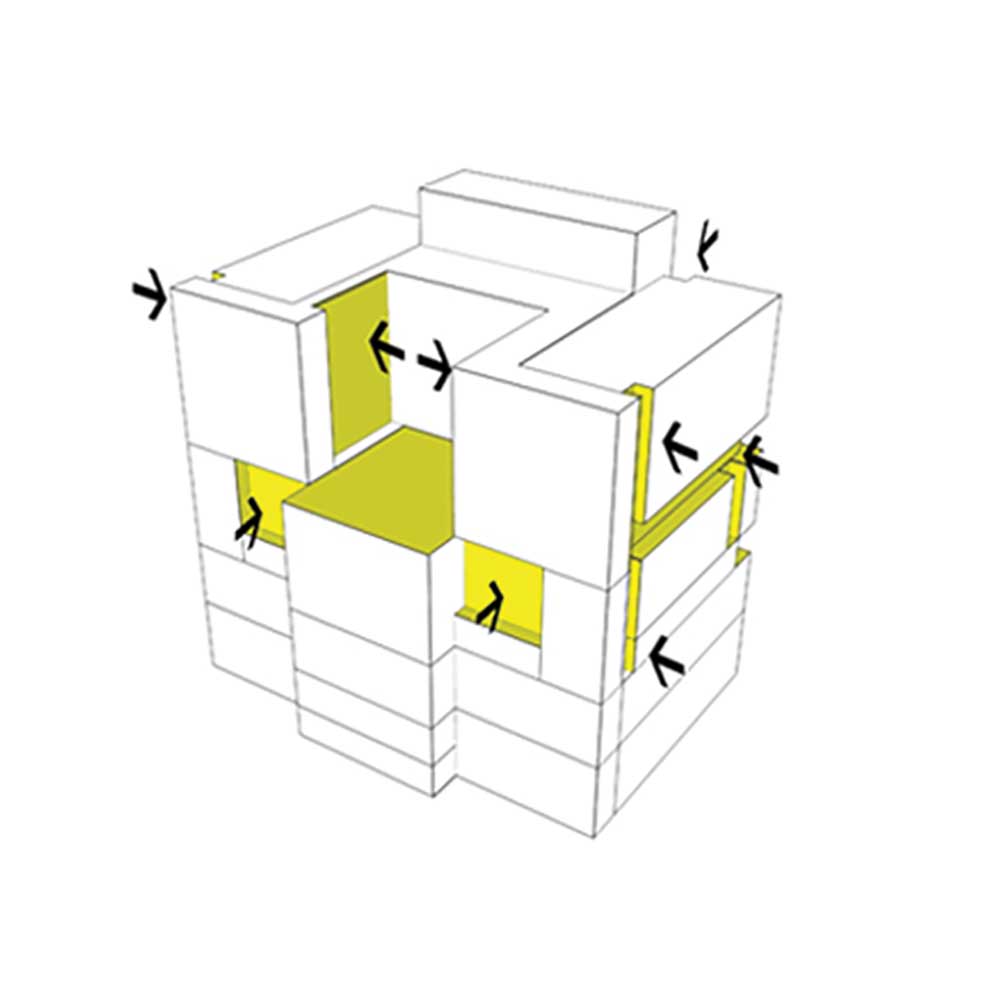 با ایجاد حفرههای درونی، پروژه به باکسی با جریان فضایی پویا بدل شد؛ گویی تمام افراد در طبقات مختلف در ارتباط با یکدیگرند. افزون بر این، استفاده از دو نوار پنجره باعث کاهش مصرف شیشه شد؛ اگر نمایی یکپارچه از شیشه استفاده میشد، هزینهها بهشدت افزایش مییافت. این رویکرد هم منظره را حفظ کرد و هم موجب کاهش مصرف انرژی شد.