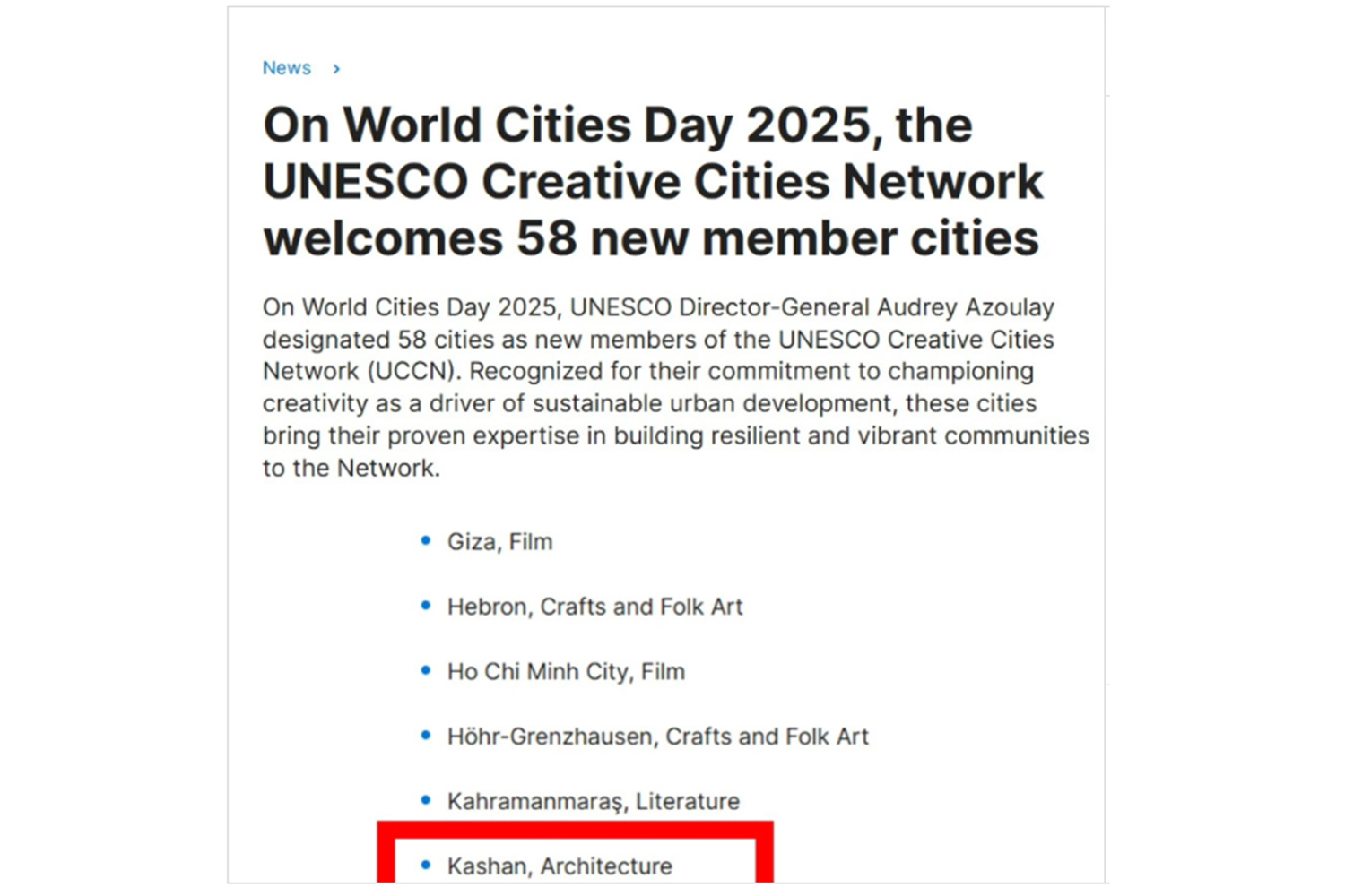 On World Cities Day 2025, UNESCO officially recognized Kashan as a Creative City in the field of Architecture, welcoming it into the UNESCO Creative Cities Network.