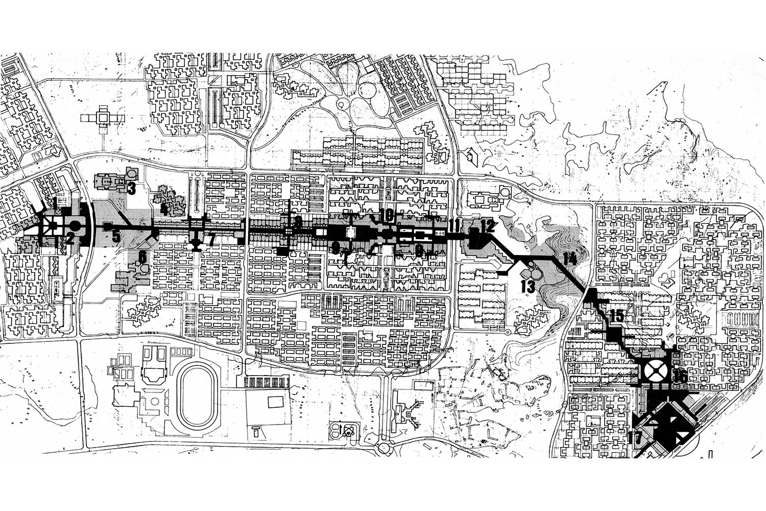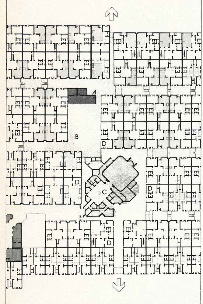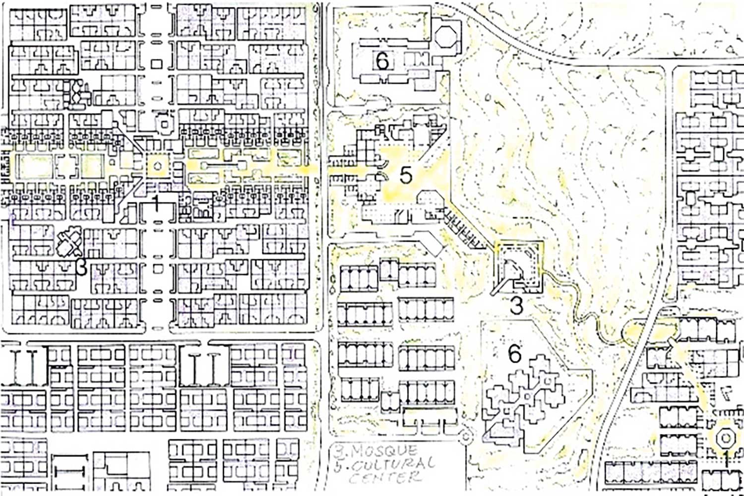 «بعد از فکر زیاد، طرحِ یک تاکتیک جنگی را برای تهیهی یک طرح جامع پنهان ریختم. سه پایگاه با فاصلهی دور از هم در نظر گرفتم تا بتوانم فاصلهی میان آنها را هم در وسعت یک طرح جامع برنامهریزی کنم. اولین پایگاه، طرح سالن سرپوشیدهی ورزشی بود که بعداً گسترش یافت. طرح دوم مربوط به سالن ناهارخوری دانشگاه بود که در آن نمازخانهای در نظر گرفتم و بعداً آن را جدا کردم و به عنوان مسجد دانشگاه در فضای باز مقابل ناهارخوری جای دادم. همهی ساختمانهای این مجموعه درواقع یک وسیلهی راهسازی برای عابر پیادهاند.