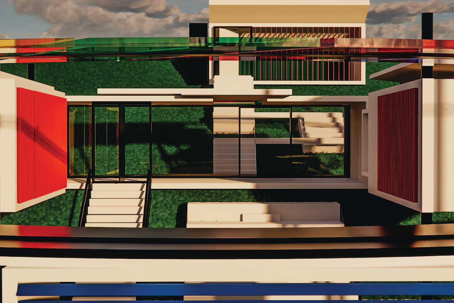 همچنین، سایهبانهای موجود در مسیر مرکزی اطراف مدرسه، برگرفته از المانها و الگوهای لوزیشکل چفیه مردان کرد بوده و بهصورت پارامتریک در سازه قرار گرفتهاند. این بخش بهعنوان نمادی از سایه پدر در خانواده طراحی شده است. از جمله امکانات مدرسه میتوان به چشماندازهای مطلوب، توجه به هویت اجتماعی فضا و همچنین ایجاد یک وید بزرگ در مرکز فضای مدرسه اشاره کرد تا تعاملات اجتماعی و محیطی را ارتقا بخشد.