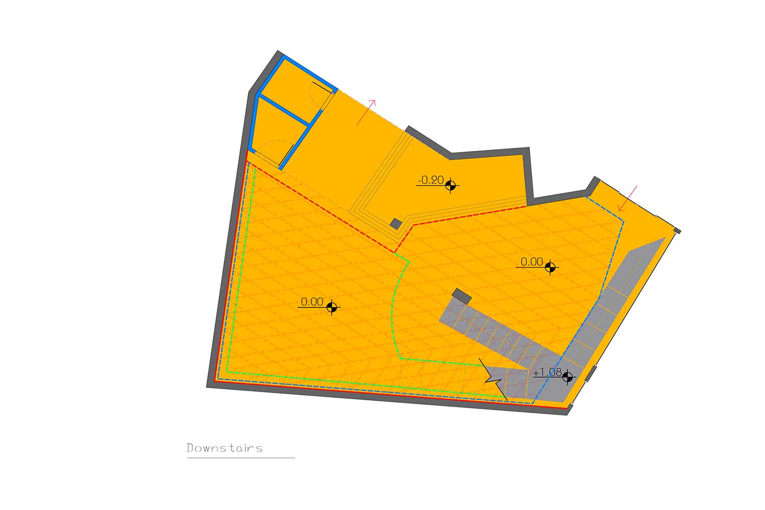 در طبقهی همکف فروشگاه یک جعبه الحاقی به اتاق پرو و سرویس در فضای مابین پوسته الحاقی و دیوار اصلی بنا اختصاص یافته است. اتاق پرو دیگری در بالاترین سطح این پله عظیمالجثه و در پاگرد بزرگ بالائی آن بعنوان یک جعبه الحاقی با قاعده مثلثی قرار گرفته است.