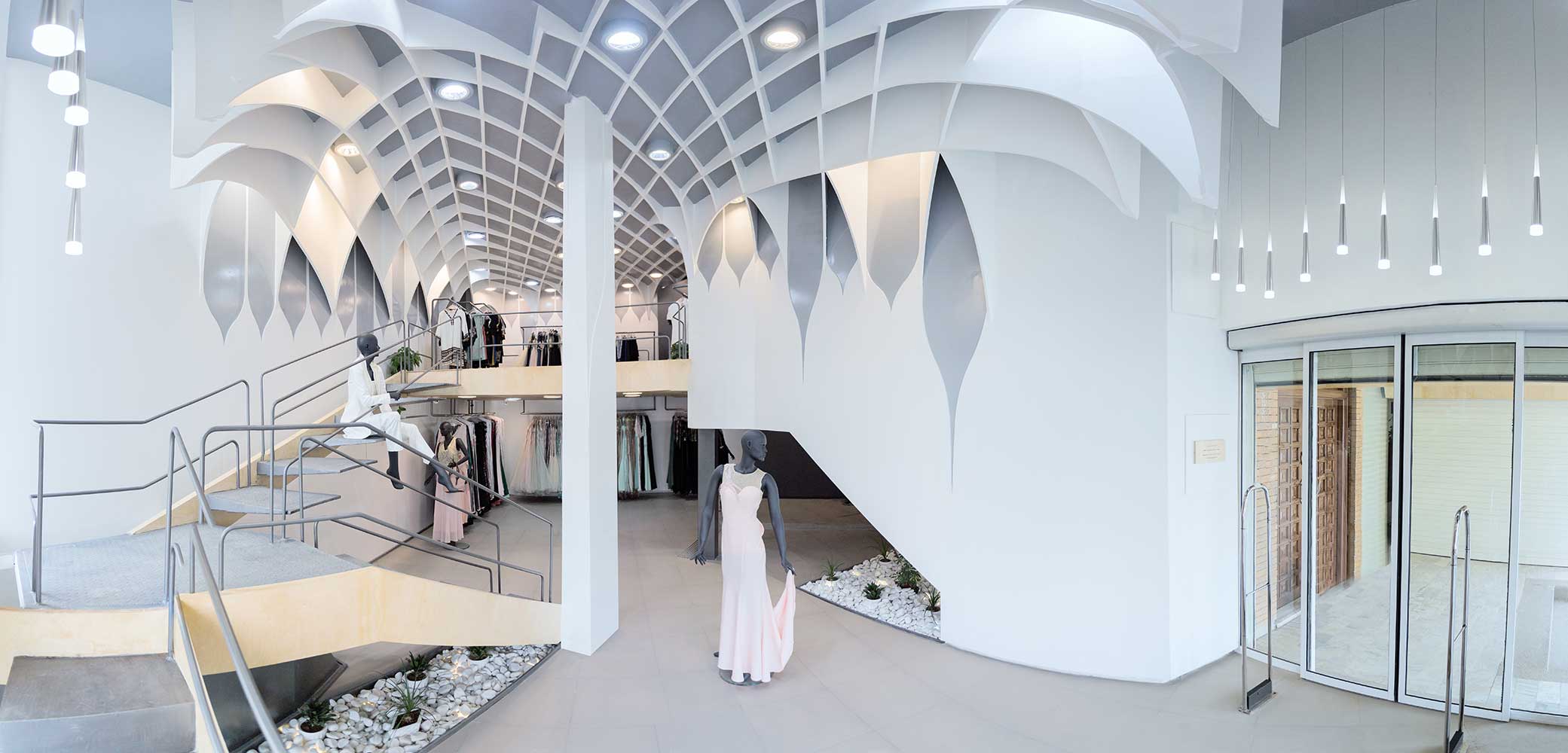 در فضای اصلی ساختمان قدیمی که ارتفاع 5/5 متر داشت، یک پوسته (لایه ) مستقل که خود را با فرم دیوارهای آن ساختمان هماهنگ میکند، ایجاد کردیم . بدلیل تعدد شکستگی های ناموزون دیوارهای اصلی محدوده این فروشگاه ، این لایه ، از دیوارهای ساختمان اصلی آفست شده و در نتیجه این آفست ، شکستگی های متعدد و ناموزون دیوار اصلی لطیف تر شده اند و فضایی یکپارچه ایجاد کرده است . پوسته ای یکپارچه که سقف و دیوارهها و کف را در برگرفته و با فرم و بافت خالی های خودش فضائی خاطره انگیز بهوجود آورده است . فضای مابین پوسته و دیوار اصلی به عملکردهای فضای اتاق پرو ، سرویس بهداشتی ، فضای استراحت افراد و فضای سبز اختصاص یافته است . این پوسته مستقل ، یکپارچه و هماهنگ با دیوارهای اصلی بنا ، در سقف ، متخلخل و در ادامه در مجاورت دیوارها خالی های کمتری و در ادامه اش به سمت کف کاملا بسته می شود.