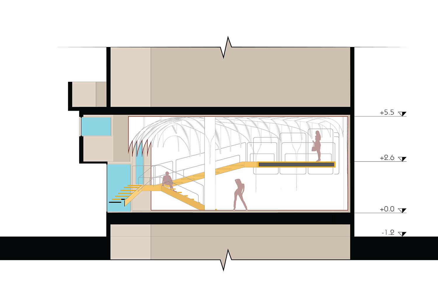 Staircase’s handrails and landings end up to regales and dress hanging location, which make an independent, continuous and integrated structure, while each as an separate object has its own structure and configuration. Either at the top or on the ground floor, all of them are integrated and continuous pipes, which are running at 50 cm distance from the staircase and main membrane.