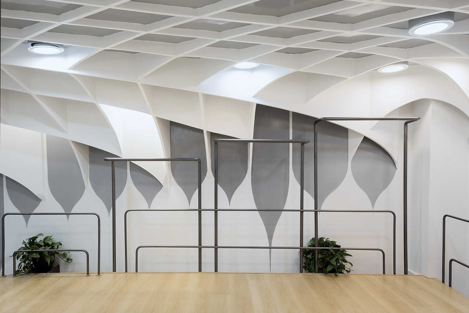 هندریلهای پلهها و پاگردها و بالکن ( که پاگرد بزرگ پله عظیم الجثه می باشد ) در امتدادشان به رگالها و مکان آویزان کردن لباسها تبدیل میشوند که در مجموع یک ساختار مستقل ، پیوسته ، ممتد و یکپارچه را در کل فضا بهوجود آوردهاند . به طوریکه آنها هم به عنوان عناصر مجزا، ساختار و سازماندهی خاص خود را دارند . چه در بالاترین قسمت و چه در همکف همه آنها (لولههایی) ممتد و یکپارچه و به هم پیوسته میباشند که از خالی 50 سانتی متری مابین حجم پله عظیم الجثه و جداره اصلی عبور می کنند تا رگالهای طبقه بالکن و رگالهای طبقه همکف یکپارچگی و به هم پیوستگی شان حفظ شود .