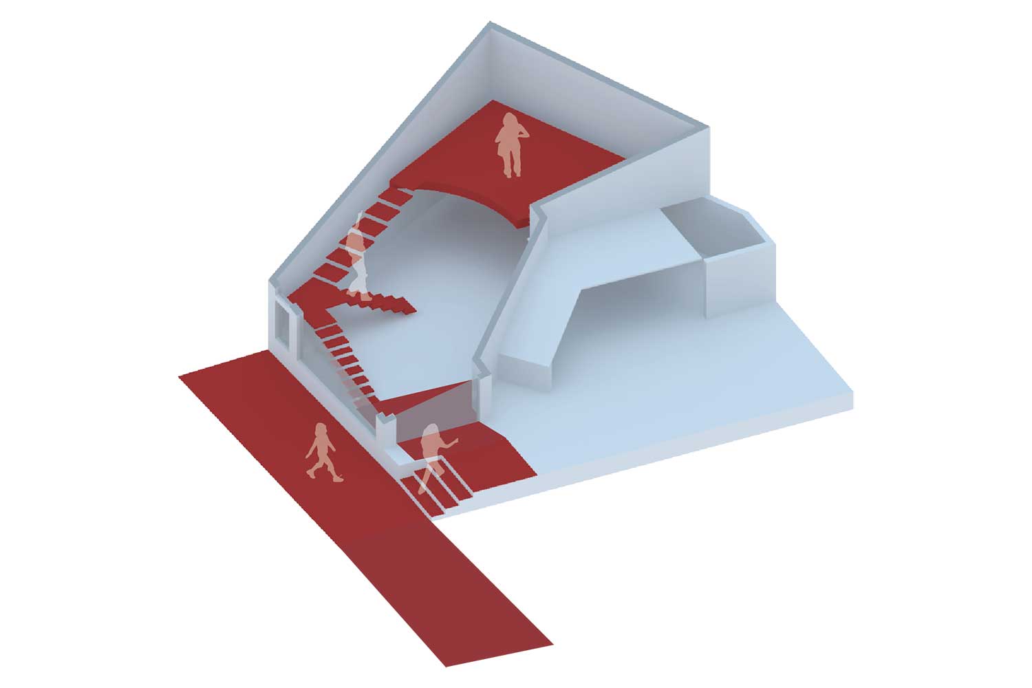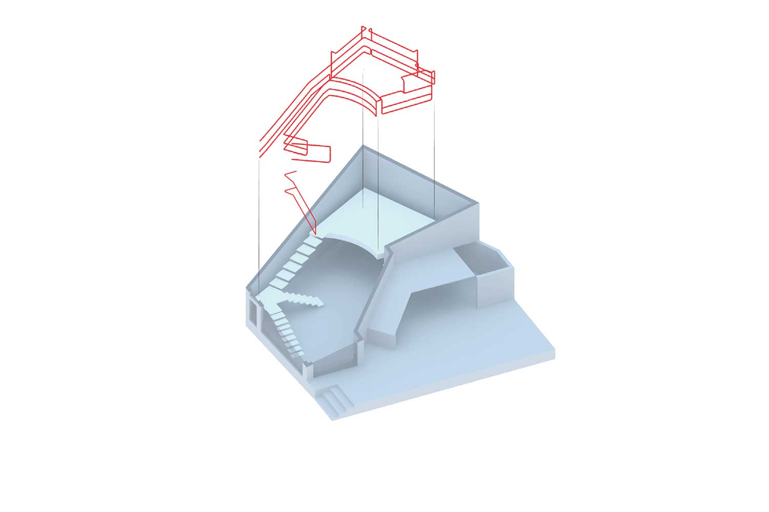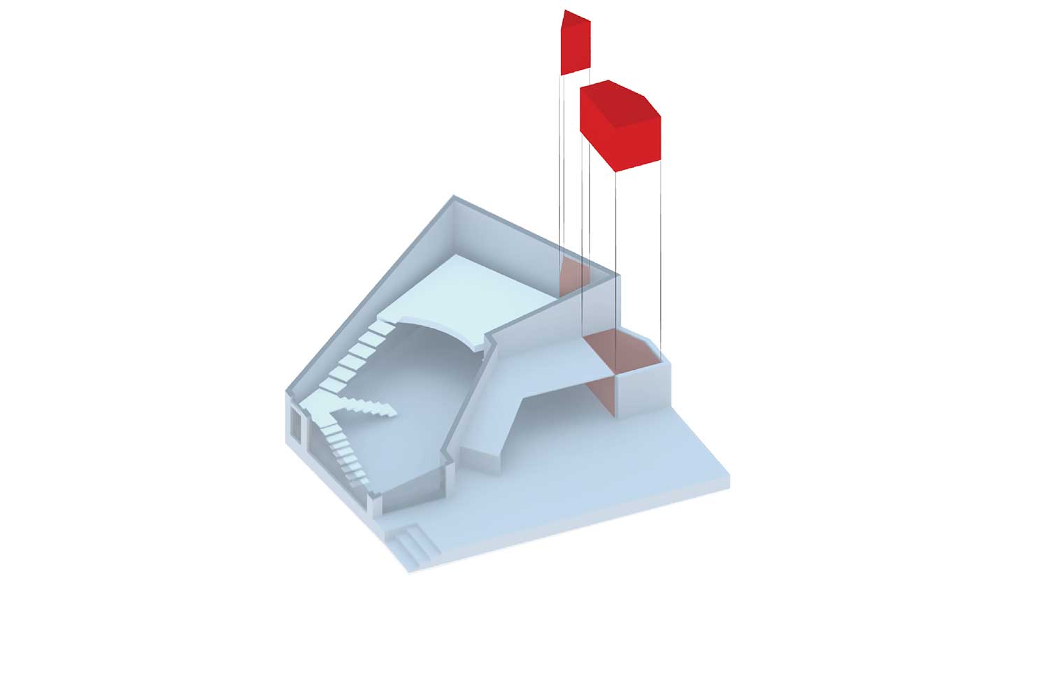 در این ساختمان و در سالیان قبل یک بالکن غیر استاندارد سازه ای در داخل فضا وجود داشت که در حین بازسازی به دلیل مشکلات سازهای، آن را تخریب کردیم. آنگاه به یک فضای یکپارچه با ارتفاع 5/5 متر تبدیل شد. در این فضای مرتفع و در امتداد شهر یک دستگاه پله که خود حجمی مستقل و ایستا ، قرار دادیم . بطوریکه این حجم مستقل و الحاقی به حجم ساختمان اصلی متصل نیست (که بار اضافی به بخشهای نا مطمئن سازه ای ساختمان وارد نمی کند ) و از جناح های مختلفش با دیوارهای بنای اصلی 50 سانتیمتر و در جناح دیگرش از شیشه نما 25 سانتی متر فاصله دارد.