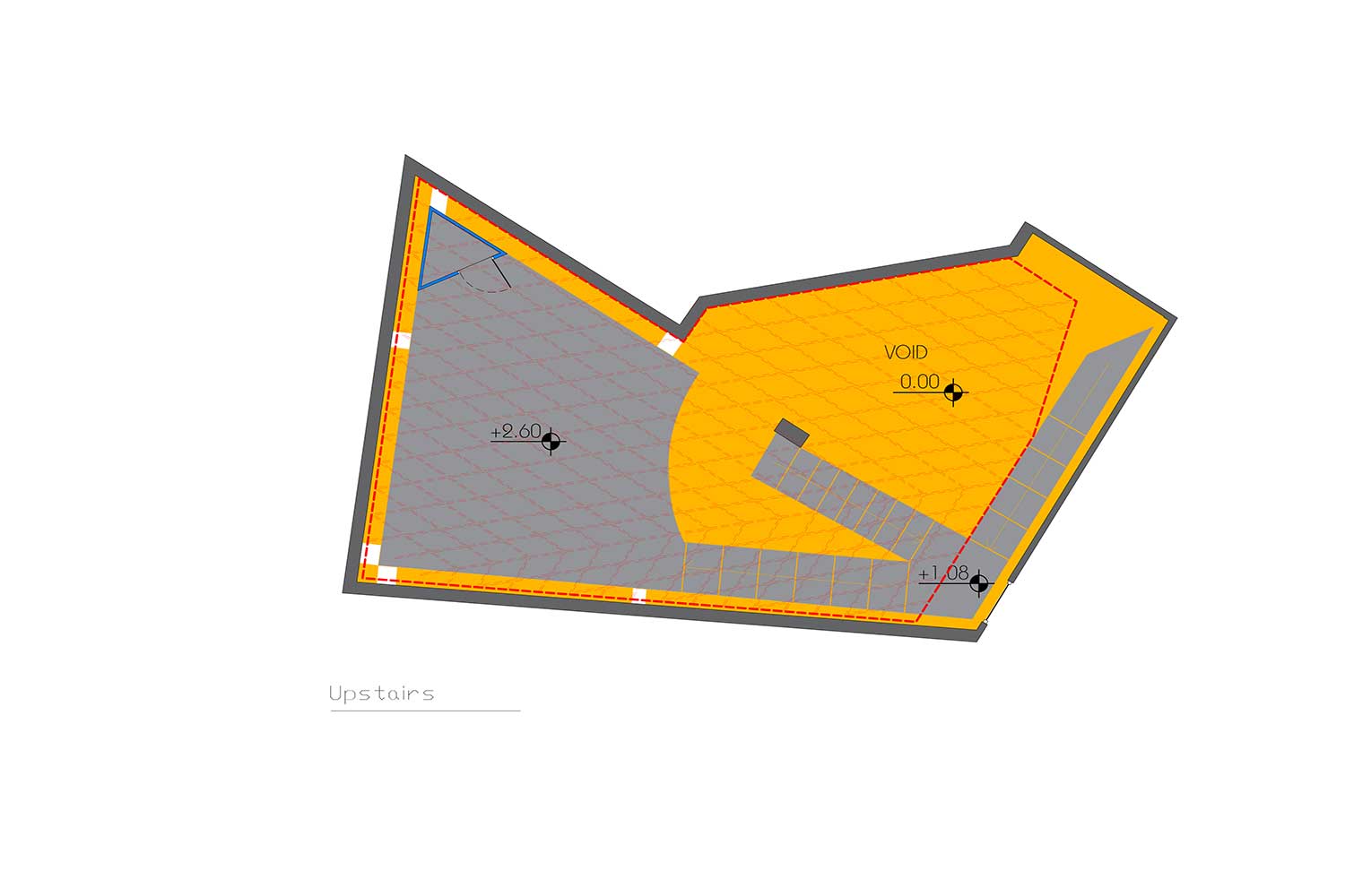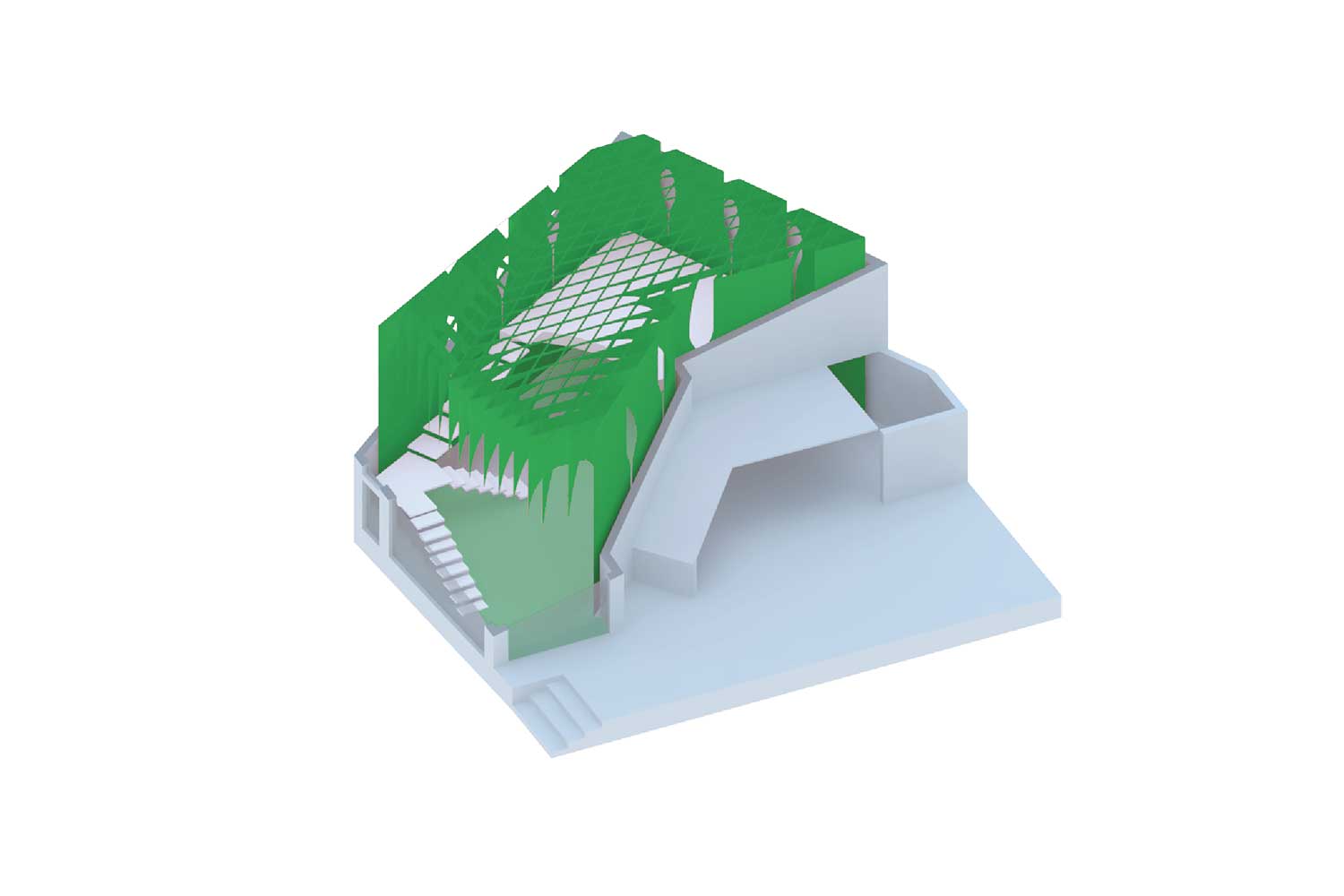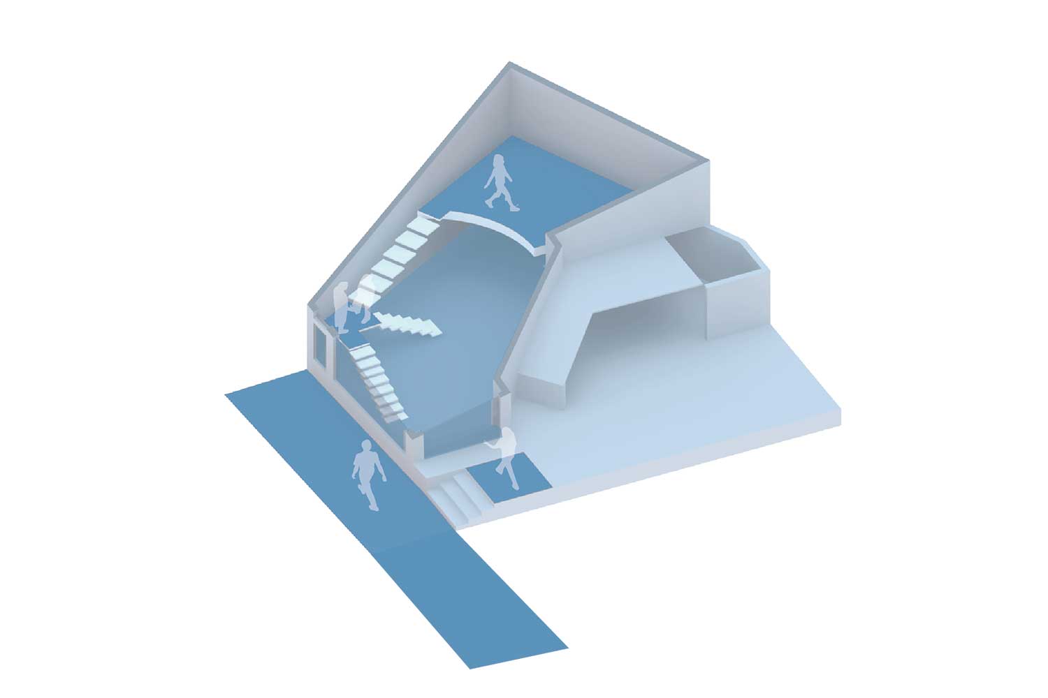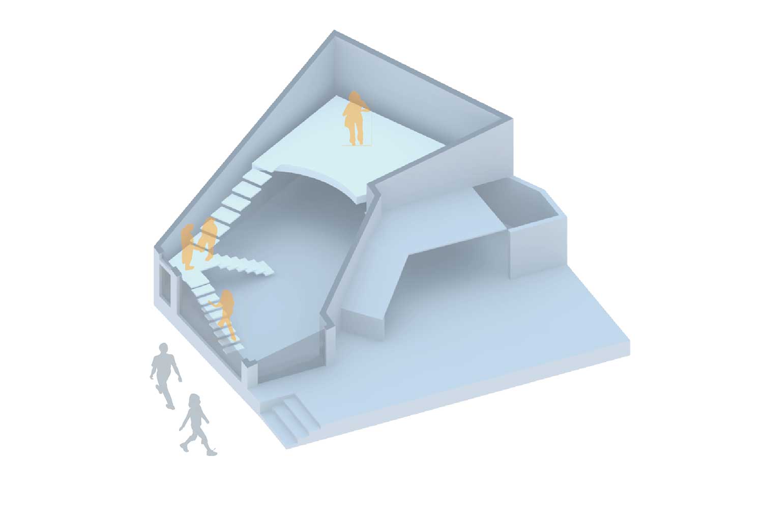 در این ساختمان و در سالیان قبل یک بالکن غیر استاندارد سازه ای در داخل فضا وجود داشت که در حین بازسازی به دلیل مشکلات سازهای، آن را تخریب کردیم. آنگاه به یک فضای یکپارچه با ارتفاع 5/5 متر تبدیل شد. در این فضای مرتفع و در امتداد شهر یک دستگاه پله که خود حجمی مستقل و ایستا ، قرار دادیم . بطوریکه این حجم مستقل و الحاقی به حجم ساختمان اصلی متصل نیست (که بار اضافی به بخشهای نا مطمئن سازه ای ساختمان وارد نمی کند ) و از جناح های مختلفش با دیوارهای بنای اصلی 50 سانتیمتر و در جناح دیگرش از شیشه نما 25 سانتی متر فاصله دارد.