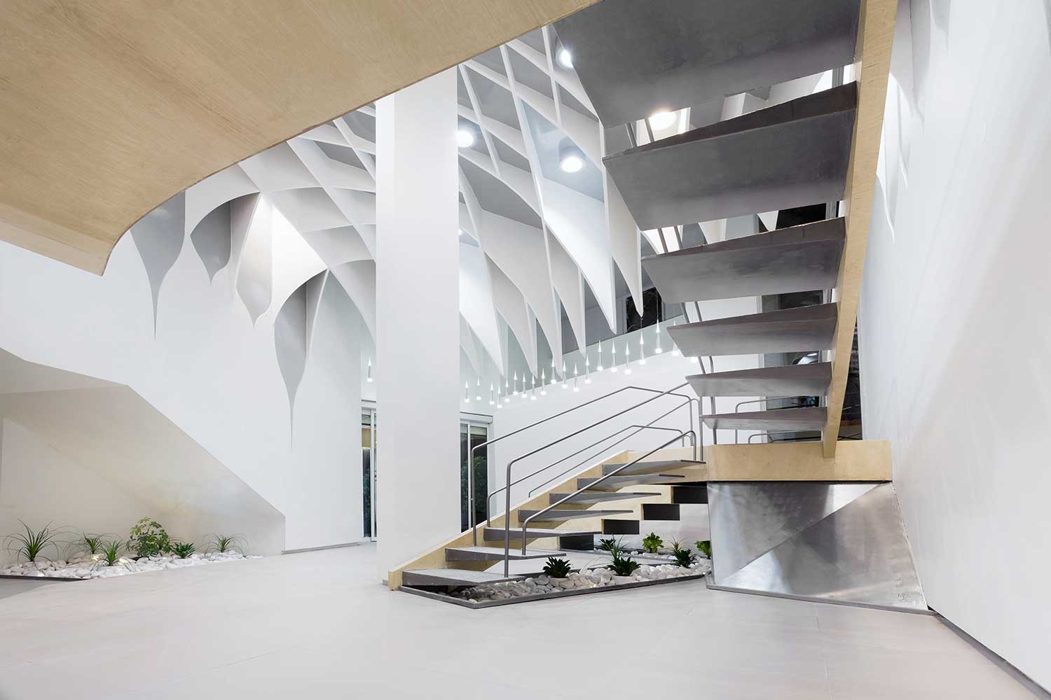 – Separation of spaces without using dividers (except services boxes)in which only structure and form of main elements create this separation and or the connection between the membrane and huge staircase and also the space between the membrane and the building’s main wall leads to separation of spaces.