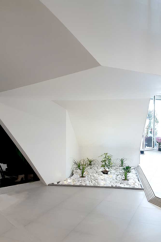 Fitting room is located at the top of the huge staircase, on a last landing as an attached box with a triangle base. Services and storage spaces are separately located on the store’s ground floor.
