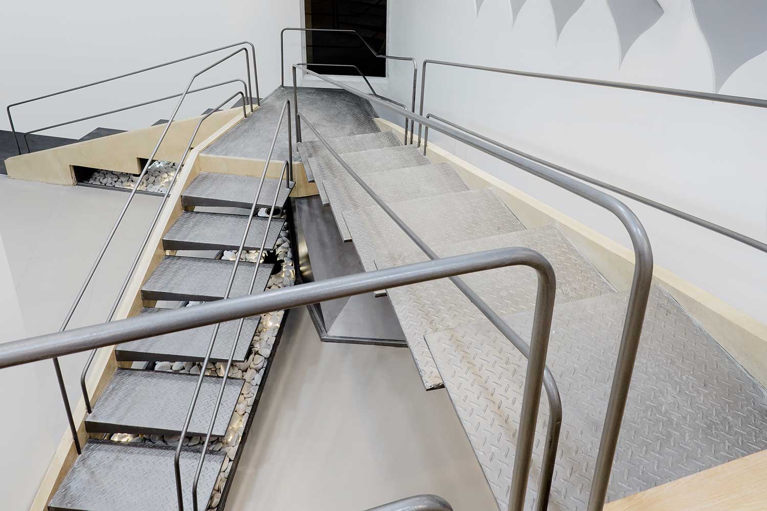 There was a balcony inside the building, which was demolished during the reconstruction, due to structural problems. This created a space with 5.5 meters height. We placed the staircase in this space as an independent object. This object (staircase) is independent, with 50 cm distance from the walls of the main building. The staircase has created diverse spaces with various applications within 5.5 meters height. People could walk through the stairs, which goes through store’s glass showcase, stop at landings of it and look around. They could also stop at the last landing, which is a kind of a balcony.