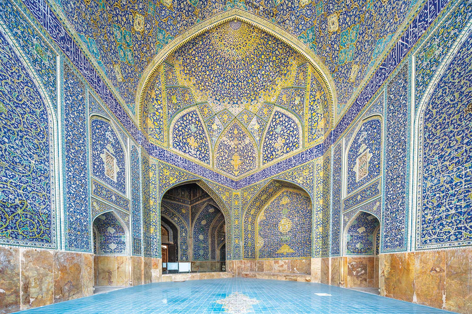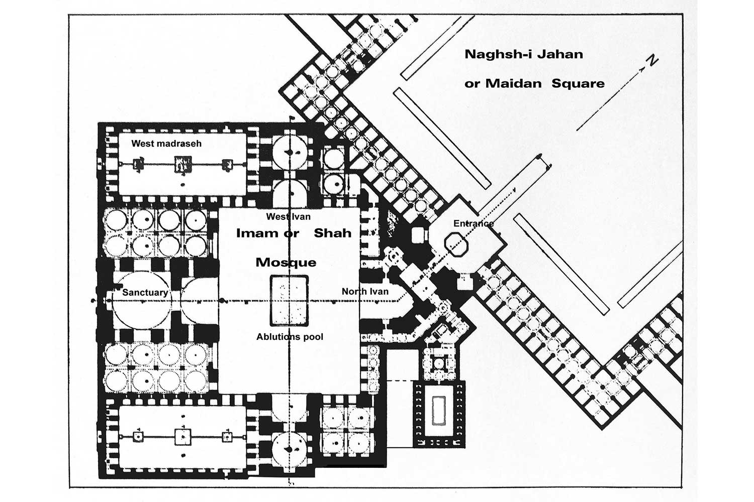 مسجد در ضلع جنوبی میدان نقش جهان قرار گرفته، اما برخلاف میدان که دارای نظمی شطرنجی و شهری است، جهتگیری مسجد با چرخشی حدود ۴۵ درجه نسبت به میدان، دقیقا در راستای قبله تنظیم شده است. این چرخش از شاهکارهای معمارانه عصر صفوی است که بدون برهمزدن نظم شهری، محور معنوی بنا را حفظ میکند. ورودی مسجد با ایوانی رفیع و دو مناره فیروزهای، مخاطب را دعوت به ورود به جهانی دیگر میکند؛ جهانی که در آن معنویت، هندسه و نور درهم تنیده شدهاند.