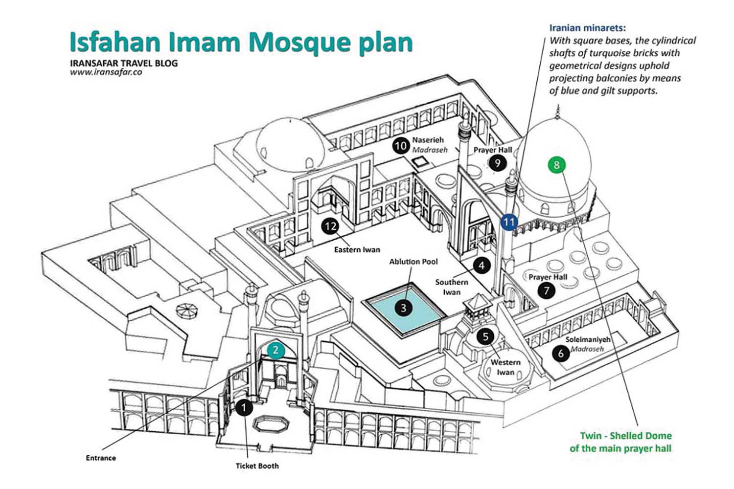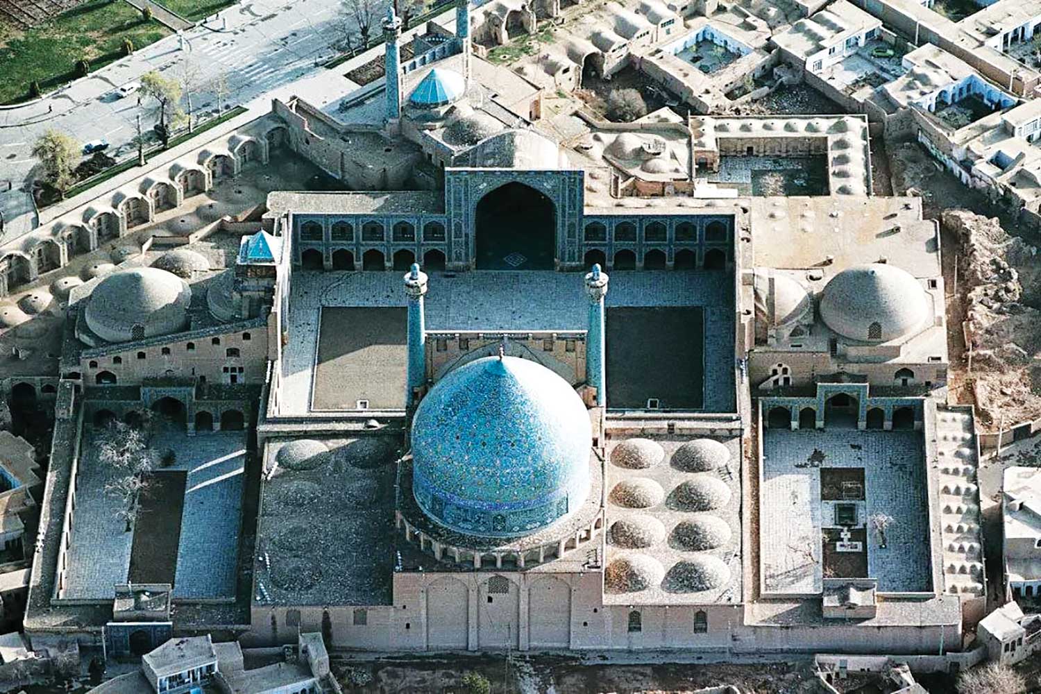 دو منارهی بلند در دو سوی ایوان ورودی با ارتفاع حدود ۴۸ متر از سطح زمین، نماد صلابت و عظمت مسجد هستند. در دو ضلع شرقی و غربی صحن، دو مدرسه دینی قرار گرفتهاند که با ایوانهای جداگانه خود به صحن باز میشوند. این مدارس، علاوه بر نقش آموزشی، به تقویت عملکرد مذهبی و اجتماعی مسجد کمک کردهاند.