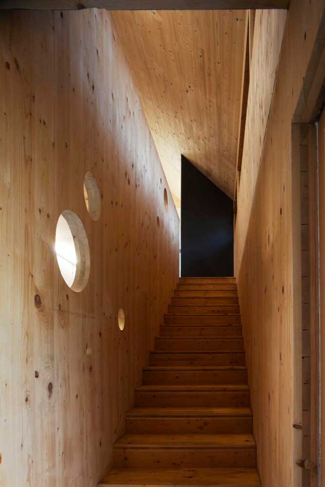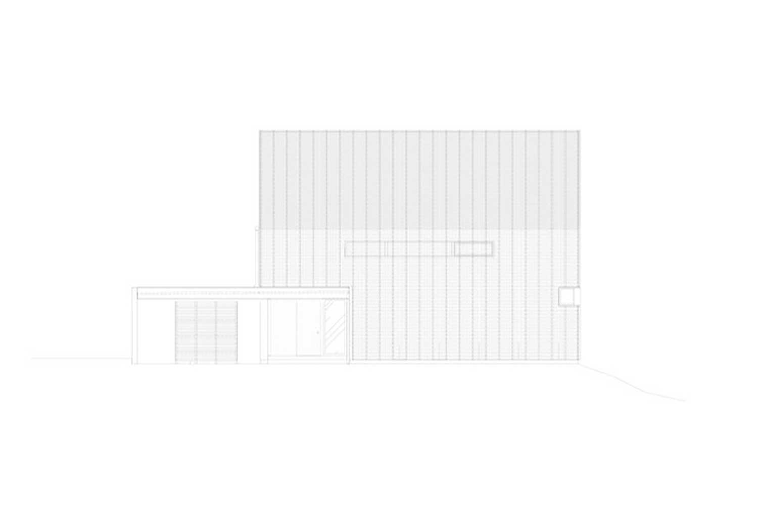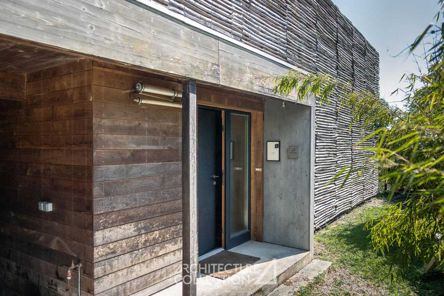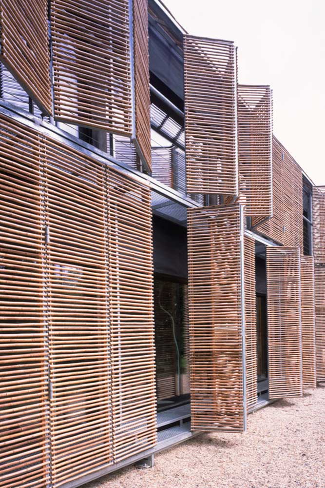 پوستهای از چوب بامبو که حالتی توریمانند دارد، این خانه را در برگرفته—رنگرفته با زمان—و الهامی از انبارهای روستایی منطقه. این پوشش بر پنجرههای شمالی کشیده و ادامهاش تا سقف، نقش سایهبانی اختیار میکند.