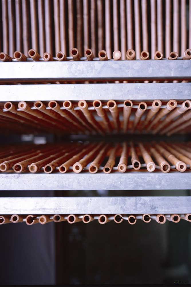 After contemplating dozens of types of wood cladding, Karanesheva and Witzmann chose bamboo for its airy quality and irregularity. “As the house was compact, it was important that the skin be very light, that you could look through it,” remarks Karanesheva. In Europe, there are few projects using bamboo, and cladding a home with the hollow stems gave it a more noble purpose. It was also less expensive than wood.