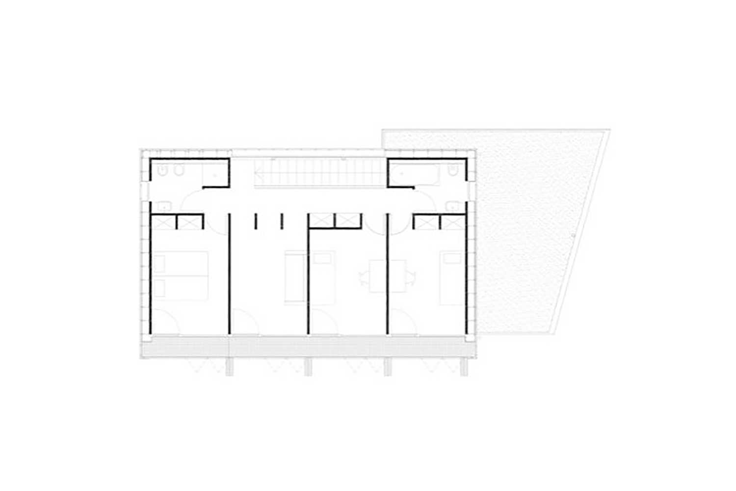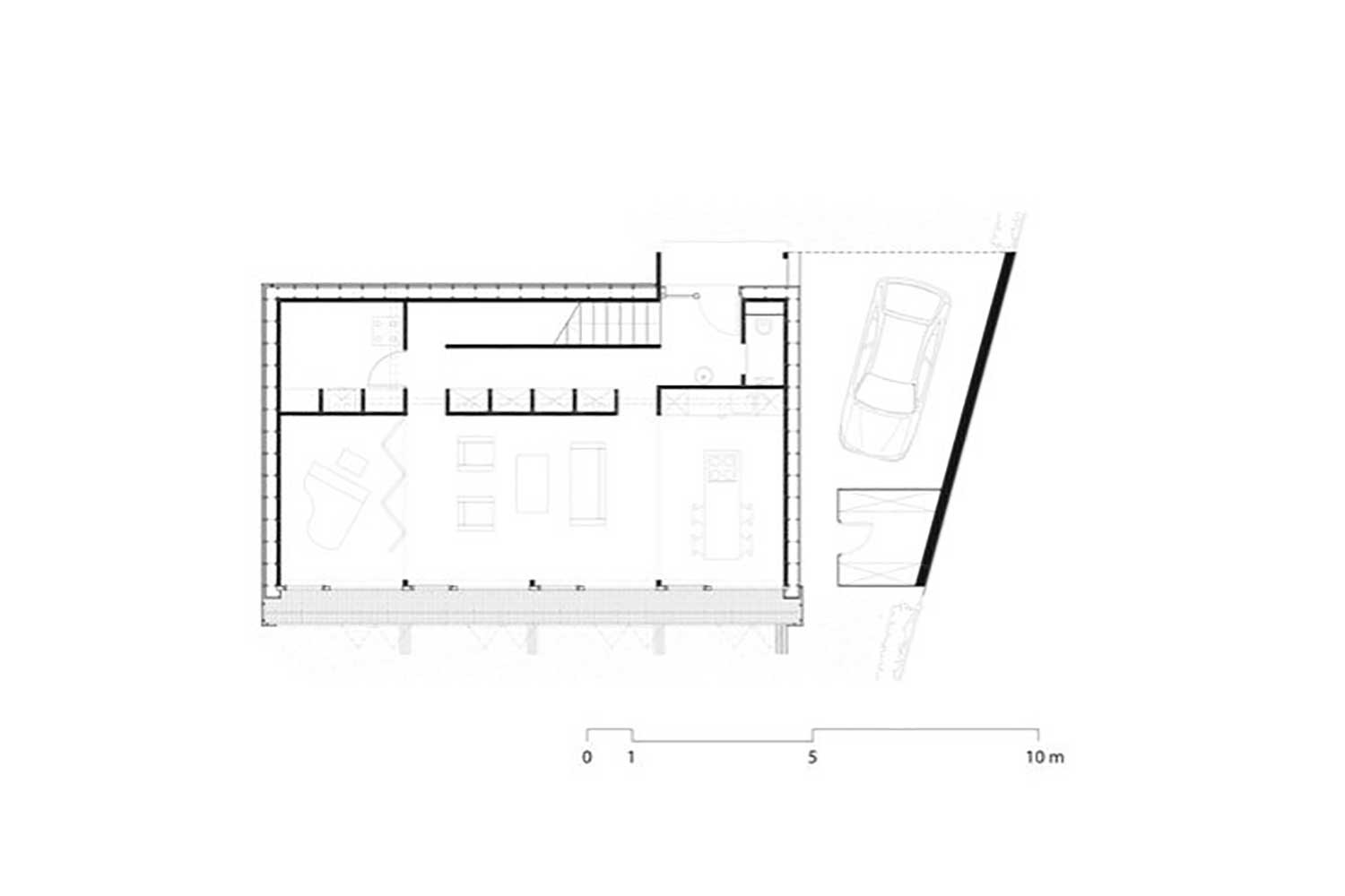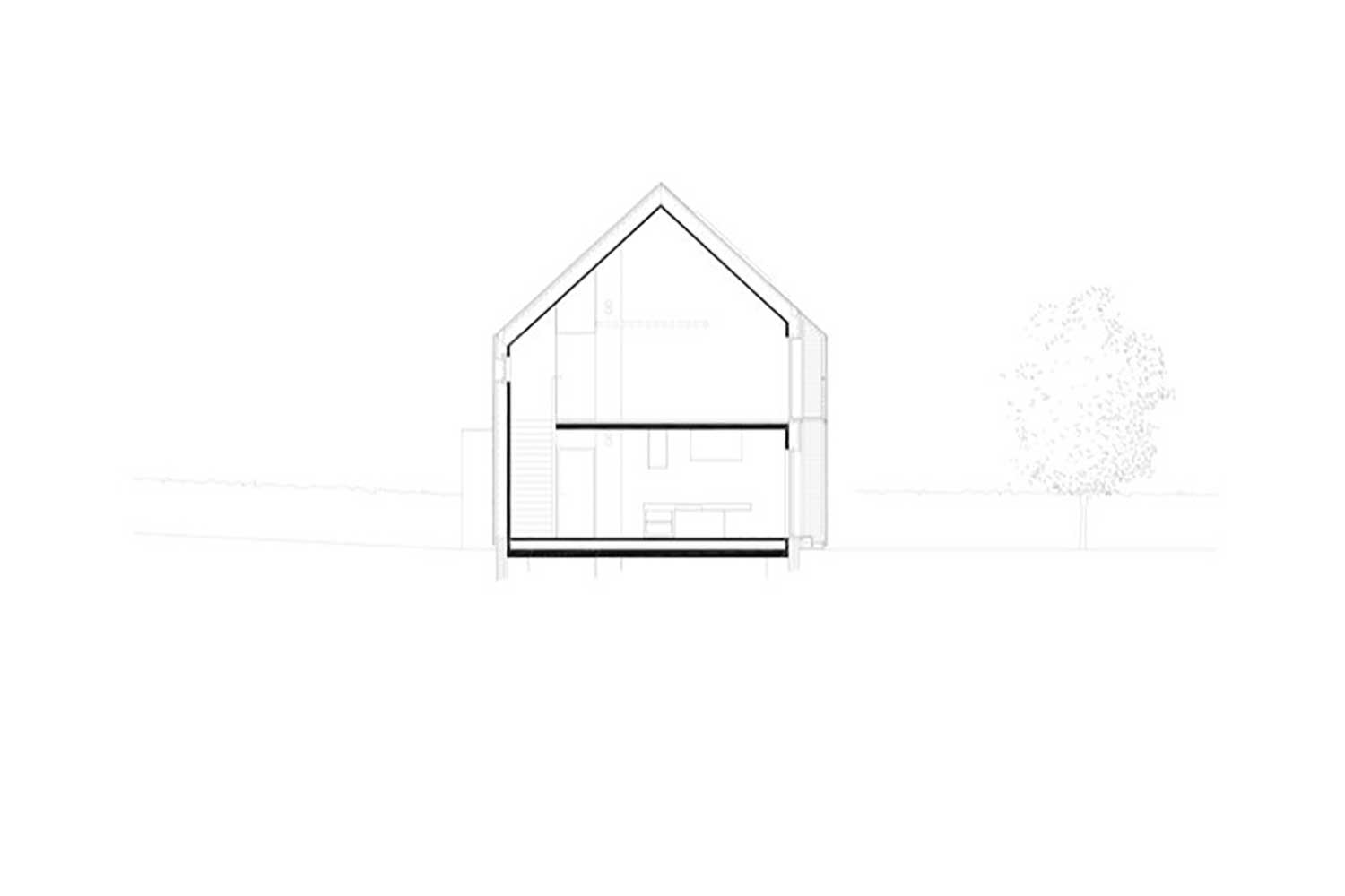 یک «ستون فقرات» به عرض حدود ۶۰ سانتیمتر، حجم مستطیلشکل خانه را به دو بخش تقسیم میکند. بخش جنوبی که بیشترین بازشوها را دارد، دو برابر بخش شمالی است. در طبقه همکف، آشپزخانه و نشیمن رو به جنوب هستند و در طبقه دوم سه اتاق خواب و یک فضای بازی رو به جنوب قرار دارند. حمامها و رختشویخانه رو به شمالاند. این ستون فقرات در دو نقطه باز میشود، نقش باربر دارد و تاسیسات مکانیکی را پنهان میکند. یک راهروی مشبک فلزی در نمای جنوبی طبقه دوم هم بهعنوان بالکن و هم برای نگهداشتن کرکرههای پنجره عمل میکند.