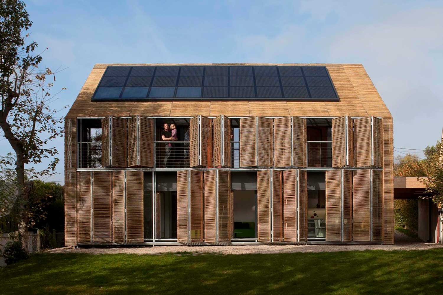 پنلهای خورشیدی بر سقف جایگرفتهاند و خانه را به سوی تولید انرژی فراتر از مصرف سوق میدهند—خانهٔ انرژی مثبت.