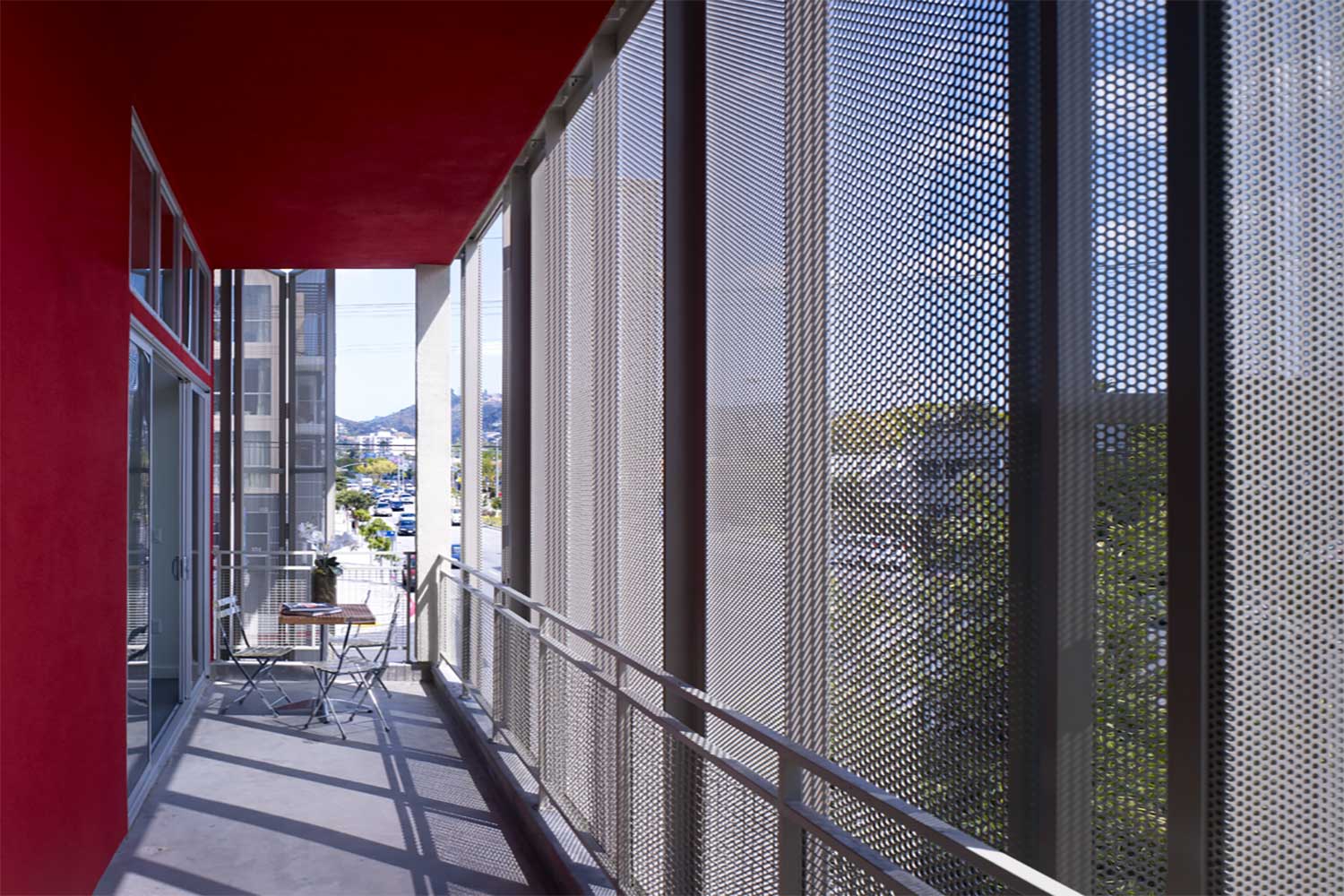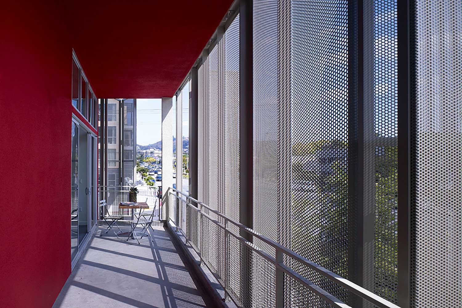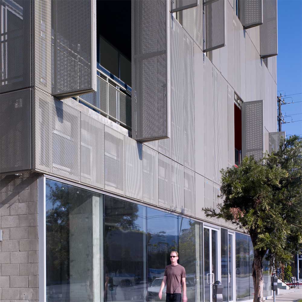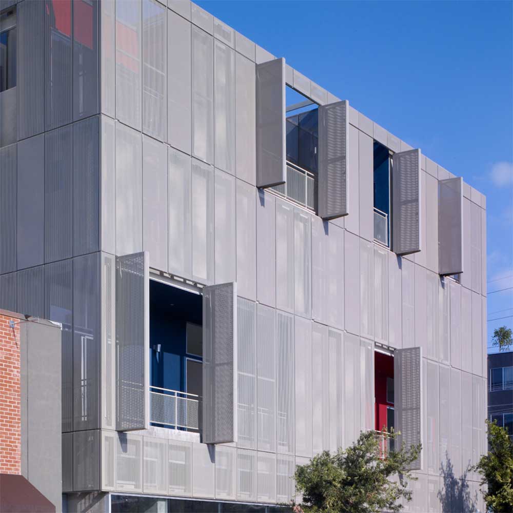 The process was collaborative, back and forth, with Cobalt Engineering modeling energy loads as architectural ideas evolved. The metal screen, initially proposed for the east facade, was wrapped around and fine-tuned to optimize the shell’s efficiency. Simple massing with a central court exploited prevalent (cross-ventilating) breezes and sun angles. Such passive strategies enabled Cherokee to exceed the nation’s most stringent energy code, California’s Title 24, by 40 percent.