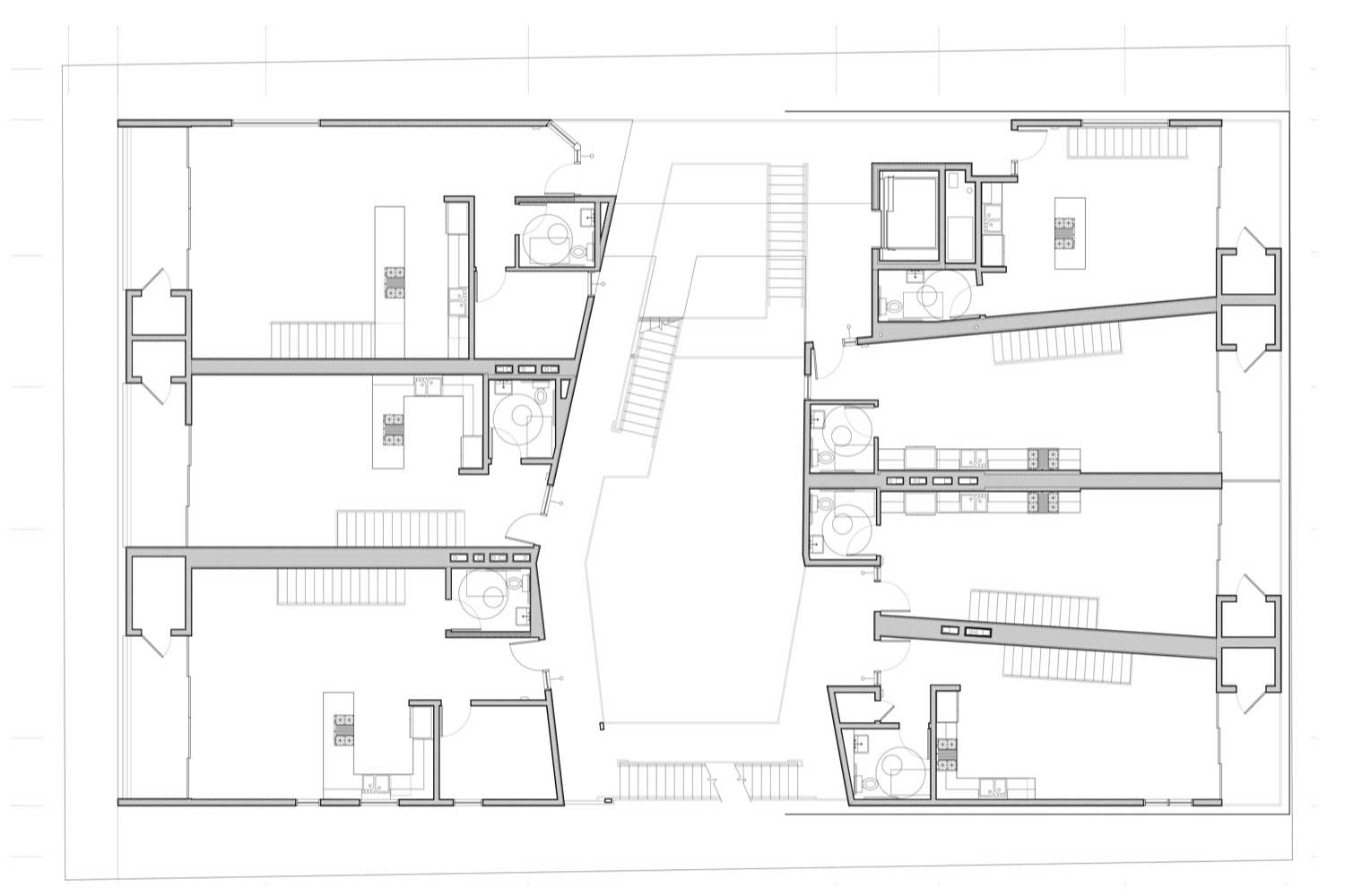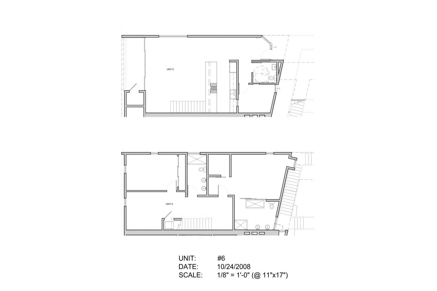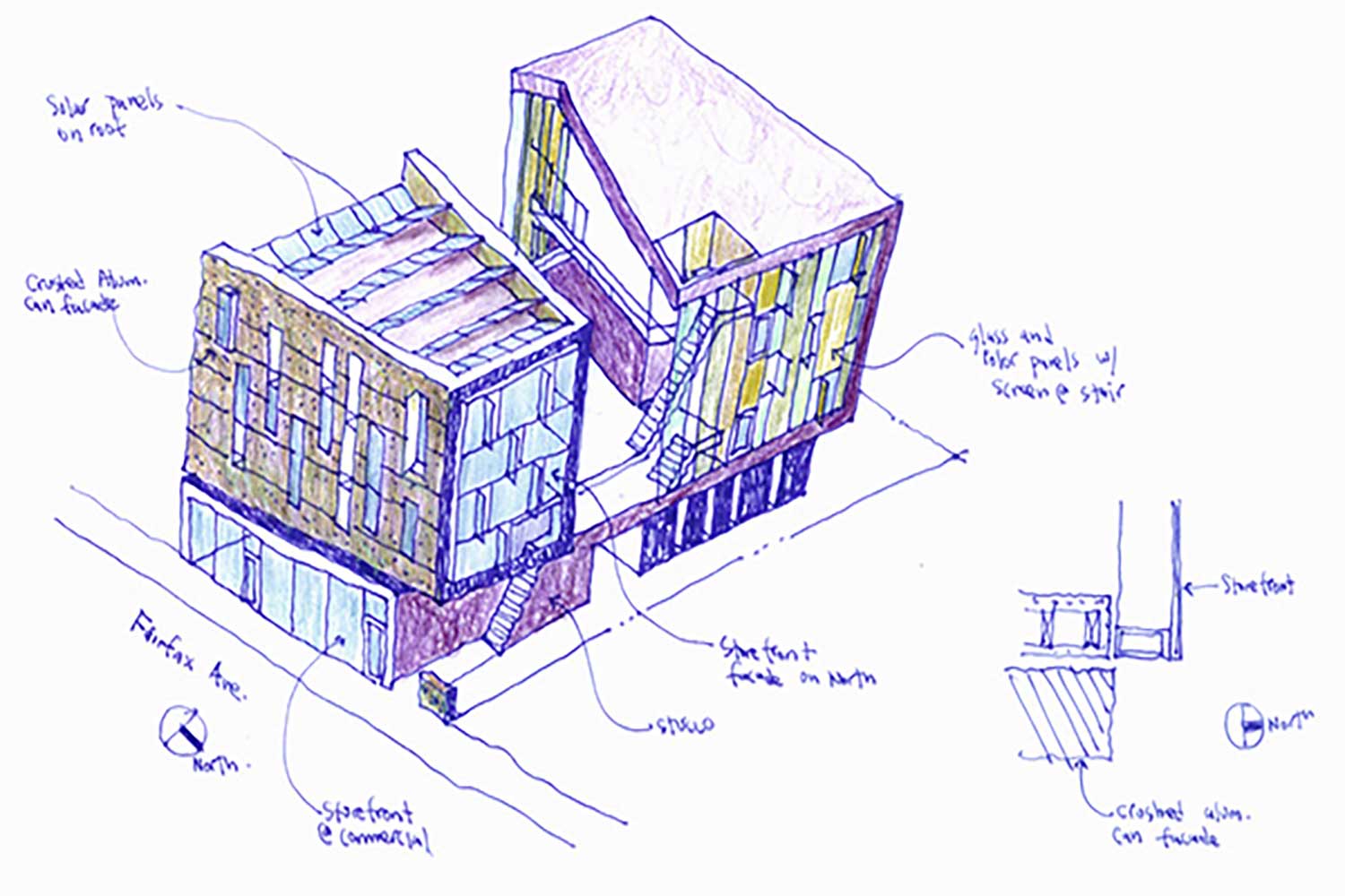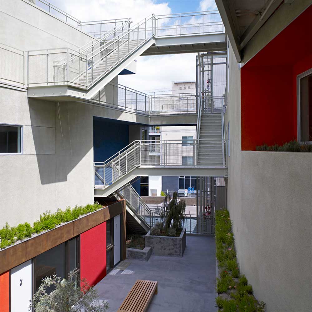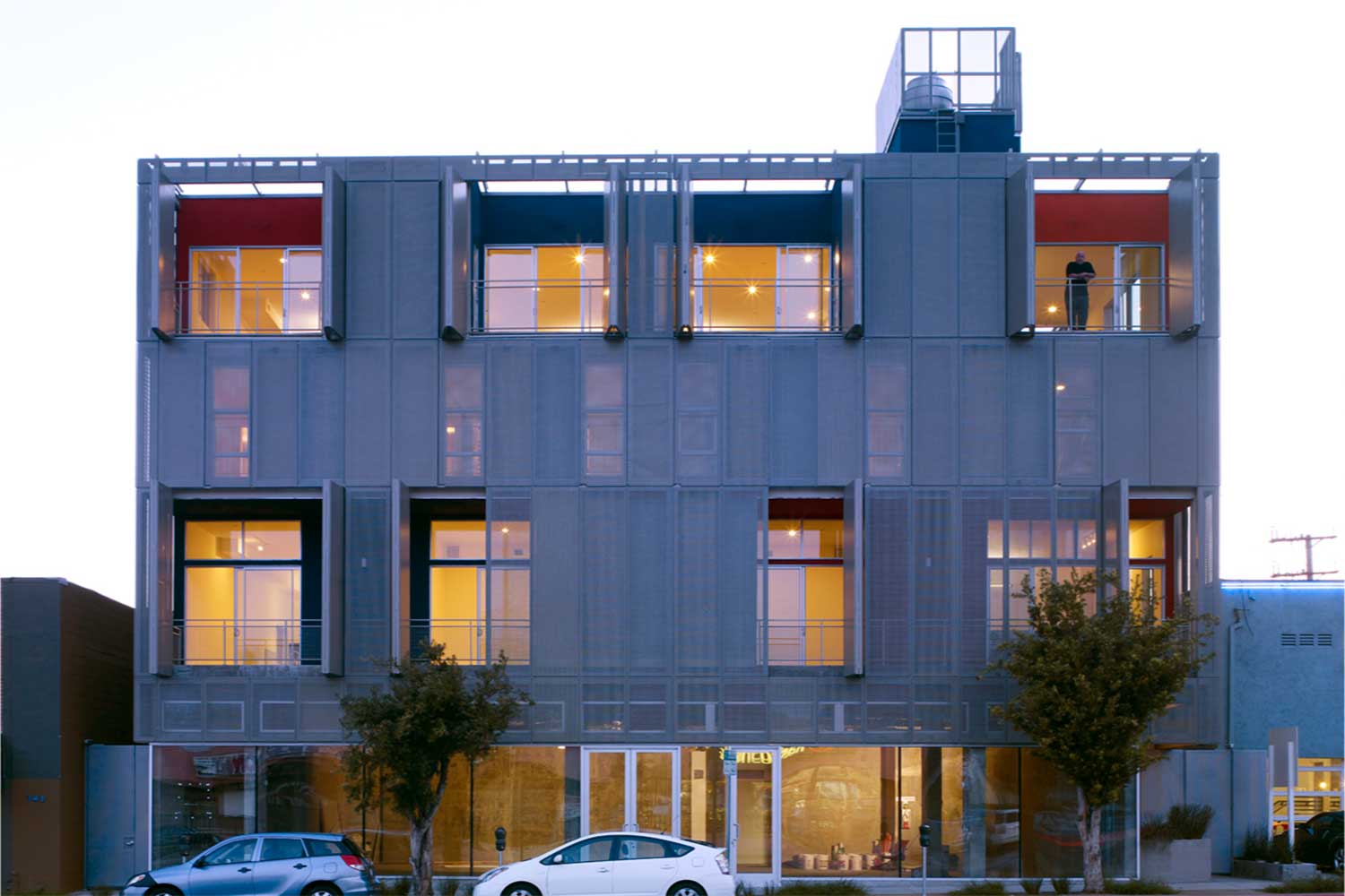 A central courtyard provides for cross-ventilation, daylight, and shade. The building is rigged for PV panels, a future investment. Artfully collaged swatches of recycled skateboards or metal scraps form the kitchen backsplashes. The lofts’ many sustainable features include efficient lighting and plumbing fixtures, and low- (or no-) VOC paint.