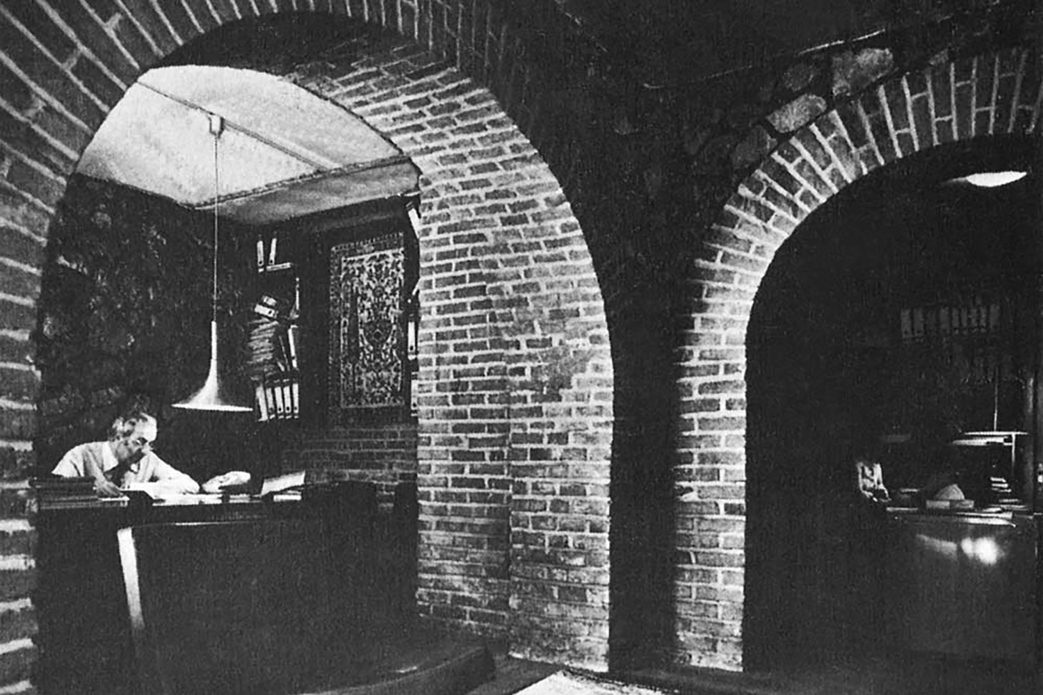 نمای داخلی استودیوی کار لو کربوزیه در واحد مسکونی او که طاقبندی واقع در استودیو و دیوار آجری قدیمی مجاور آن را نشان میدهد.