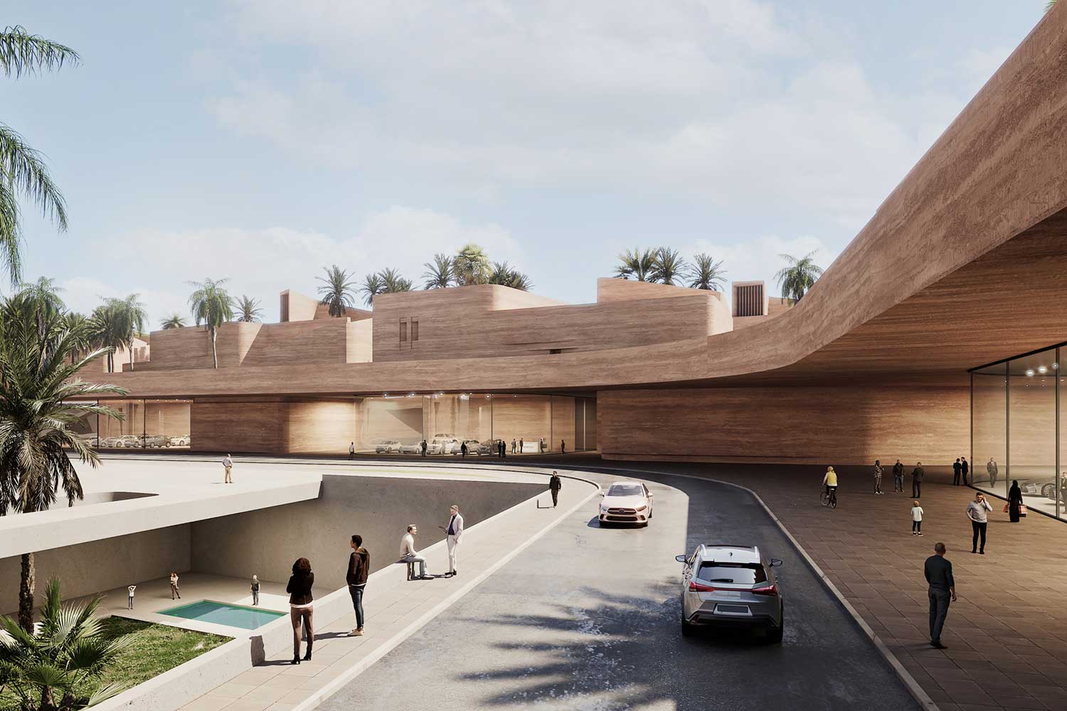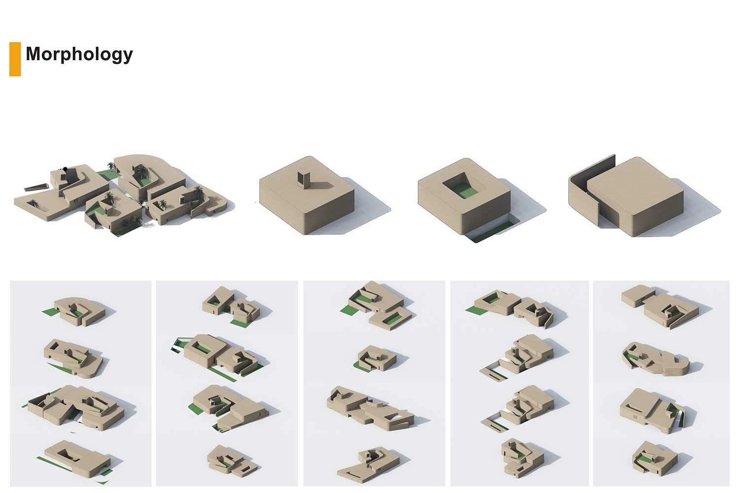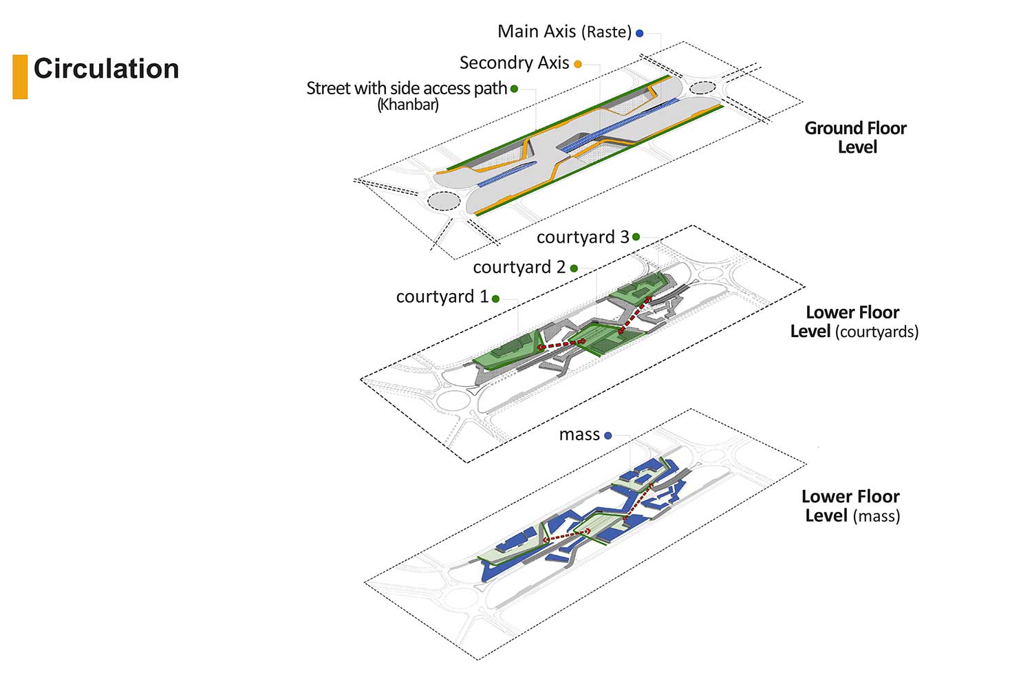 On December 26, 2003, a devastating earthquake struck the city of Bam, located in Kerman Province in southeastern Iran. This tragic event claimed the lives of approximately 60,000 residents. While the Arg-e Bam—the world’s largest adobe structure—suffered severe damage, parts of it remained standing, continuing to serve as a profound symbol of the city’s historical and cultural identity. In the aftermath of the disaster, an extensive national and international effort was launched to rebuild the city. Reconstruction initiatives involved governmental bodies, private sectors, and humanitarian organizations, and over the years, substantial portions of the urban fabric were restored. Although most of the city had been reduced to rubble, the enduring presence of the Arg became a source of inspiration and a catalyst for reviving Bam’s architectural and cultural spirit. The initial phases of redevelopment prioritized the restoration of vital infrastructure, public buildings, and residential units, ensuring that displaced residents could gradually return to normal life. Simultaneously, strategic attention was directed toward establishing automotive manufacturing facilities to stimulate local employment and economic resilience. Now, more than two decades later, Bam is entering a new phase of spatial growth and architectural regeneration. At the heart of this expansion is the proposal for a cultural–touristic–commercial axis, envisioned as the city’s new urban spine. Given Bam’s millennia-old heritage, the design honors the region’s architectural lineage and deep-rooted cultural identity, fostering an emotional and symbolic connection between the people and the built environment. The project site’s linear geometry naturally lends itself to reinterpretation through the lens of the traditional Iranian bazaar—a typology deeply embedded in the cultural memory of the region. The design draws direct inspiration from the historical Kerman Bazaar, one of the most exemplary manifestations of this urban model. Simultaneously, the spatial and formal language references elements of the Arg-e Bam, creating a harmonious sense of familiarity and continuity for users. The built fabric is intentionally fine-grained, following an equitable hierarchy that evokes the organic evolution of traditional bazaars. In response to Bam’s extreme hot and arid climate—often exceeding 45°C for much of the year—passive climatic design is prioritized. Architectural elements such as shaded arcades, wind towers, dense urban grain, and strategic massing provides natural thermal comfort throughout the day. Continuing Bam’s legacy as a “garden-city,” the project integrates drought-resistant palm trees, ensuring continuity of green infrastructure while contributing to microclimatic cooling and urban ambience. Portions of the buildings are partially embedded into the ground to generate extended shade and minimize energy consumption. Water features strategically placed near shaded areas enhance spatial comfort and evoke a sensory experience of vitality and renewal. This new axis comprises a dynamic mix of cultural, commercial, hospitality, and public functions. It is conceived as a living, breathing urban system—a catalyst for restoring civic life and reinterpreting Bam’s ancient narrative. A city defined for millennia by three enduring elements: garden, water, and shade.”