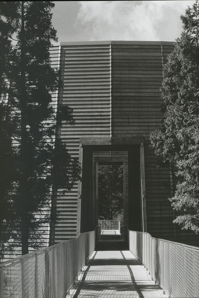 در سمت چپ، این چشمانداز از رمپِ ورودیِ موزه، طراحی «فضای مراقبه» در پاریس را به یاد میآورد؛ با این تفاوت که در مقیاسی بزرگتر و با مصالح چوبی اجرا شده است. با این حال، برخلاف نمونهٔ پاریسی که فضایی بسته دارد، هستهٔ موزهٔ چوب بهسوی آسمان گشوده است. این موزهٔ شاخص به مناسبت برگزاری چهلوپنجمین جشنوارهٔ ملی چوب در استان هیوگو ساخته شد؛ رویدادی که همزمان با «روز درختکاری» برگزار میشود و آیینی است که در دههٔ ۱۹۵۰، پس از ویرانی گستردهٔ جنگلها در دوران جنگ، به ابتکار امپراتور ژاپن بنیان نهاده شد. این سایتِ دورافتاده و جنگلی، که در نزدیکی یک پیست اسکی و در فاصلهٔ حدود سه ساعت رانندگی از اوساکا قرار دارد، مساحتی برابر با ۱۶۸٬۳۱۰ مترمربع را در بر میگیرد. موزه با ترکیبی از چوب، سازهٔ فلزی و بتن مسلح ساخته شده و شامل سالنی نمایشگاهی بهشکل حلقه است؛ با قطر خارجی ۴۶ متر و فضای خالی مرکزی به قطر ۲۲ متر. پل دسترسی، مستقیماً از دلِ سازه عبور میکند، از فراز فوارهای مرکزی میگذرد و بازدیدکنندگان را در امتداد مسیری به طول ۲۰۰ متر به سکوی تماشا و اقامتگاه میرساند. در فضای داخلی موزه، کفِ شیبدار بازدیدکنندگان را در امتداد مسیری مارپیچ هدایت میکند؛ مسیری که آنها را دو بار به درون فضای خالی مرکزی وارد میسازد. برای ستونها و تیرها از چوب سدرِ محلیِ استان هیوگو استفاده شده است. ستونهای عظیمِ چوبِ لمینیتشده، که تا ارتفاع ۱۶ متر اوج میگیرند، بهگونهای چیده شدهاند که تداعیگر فضای جنگل باشند. با اینحال، کیفیت آثار نمایشی –شامل ماکتهای خانههای چوبی و تصاویر نورپردازیشده– همسنگ کیفیت استثنایی معماری بنا نیست. اگرچه این سازه بهطور مستقیم یادآور هیچ معبد خاصی نیست، اما دستکم حسی از همزیستی و پیوند با طبیعت را القا میکند و یادآور این واقعیت است که جنگلهای غنی ژاپن، سرچشمهٔ علاقهٔ دیرینهٔ این کشور به معماری چوبی بودهاند. همانند شماری از دیگر موزههای آندو (برای نمونه، موزهٔ تاریخی چیکاتسو–آسوکا)، موزهٔ چوب نیز ادای احترامی است از سوی معمار به سرچشمههای فرهنگ و تاریخ ژاپن. در فضای داخلی موزه، مسیر پیادهروی مارپیچی از بازدیدکننده استقبال میکند. ستونهای چوبی لمینیتشده –که بسیار شبیه به نمونههای بهکاررفته در پاویون ژاپن در سویا هستند– بهصورت نمادین هم به جنگل مجاور اشاره دارند و هم به هدف بنیادین این موزه. نقشهها، نحوهٔ توزیع فضاهای داخلی و نقش اساسی هستهٔ خالیِ سازه را نشان میدهند. در سمت راست: نمایی رو به بالا از تراز فواره، در حیاط داخلیِ مدور بنا.