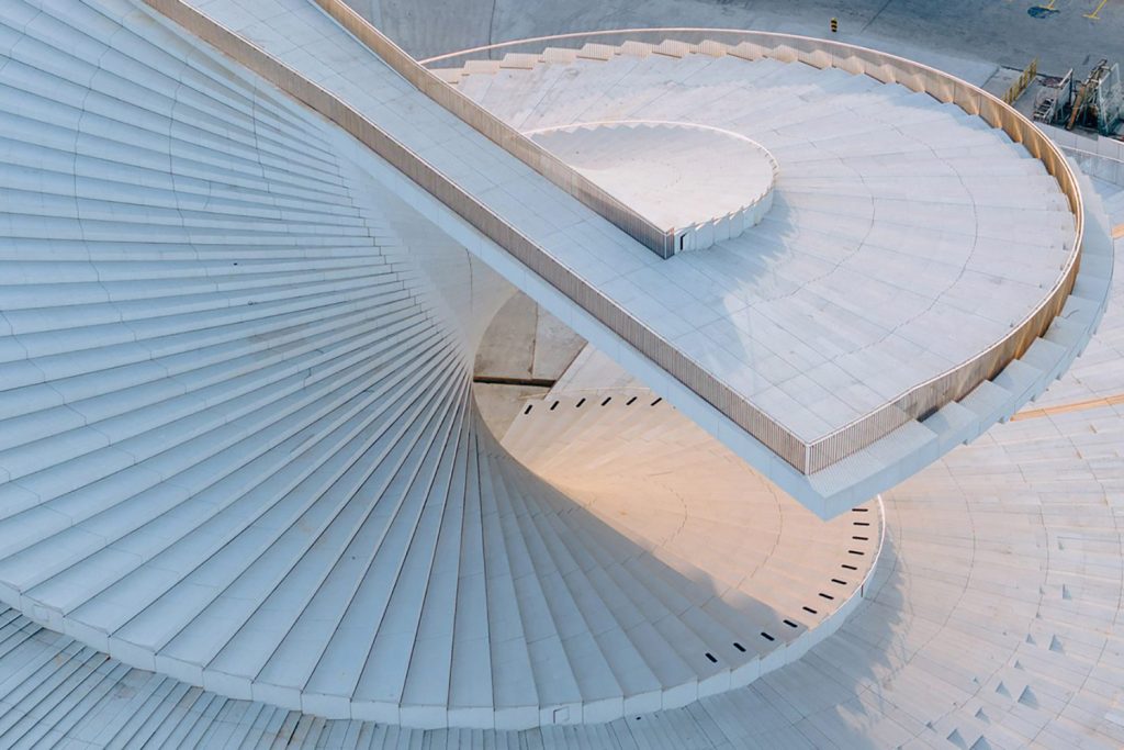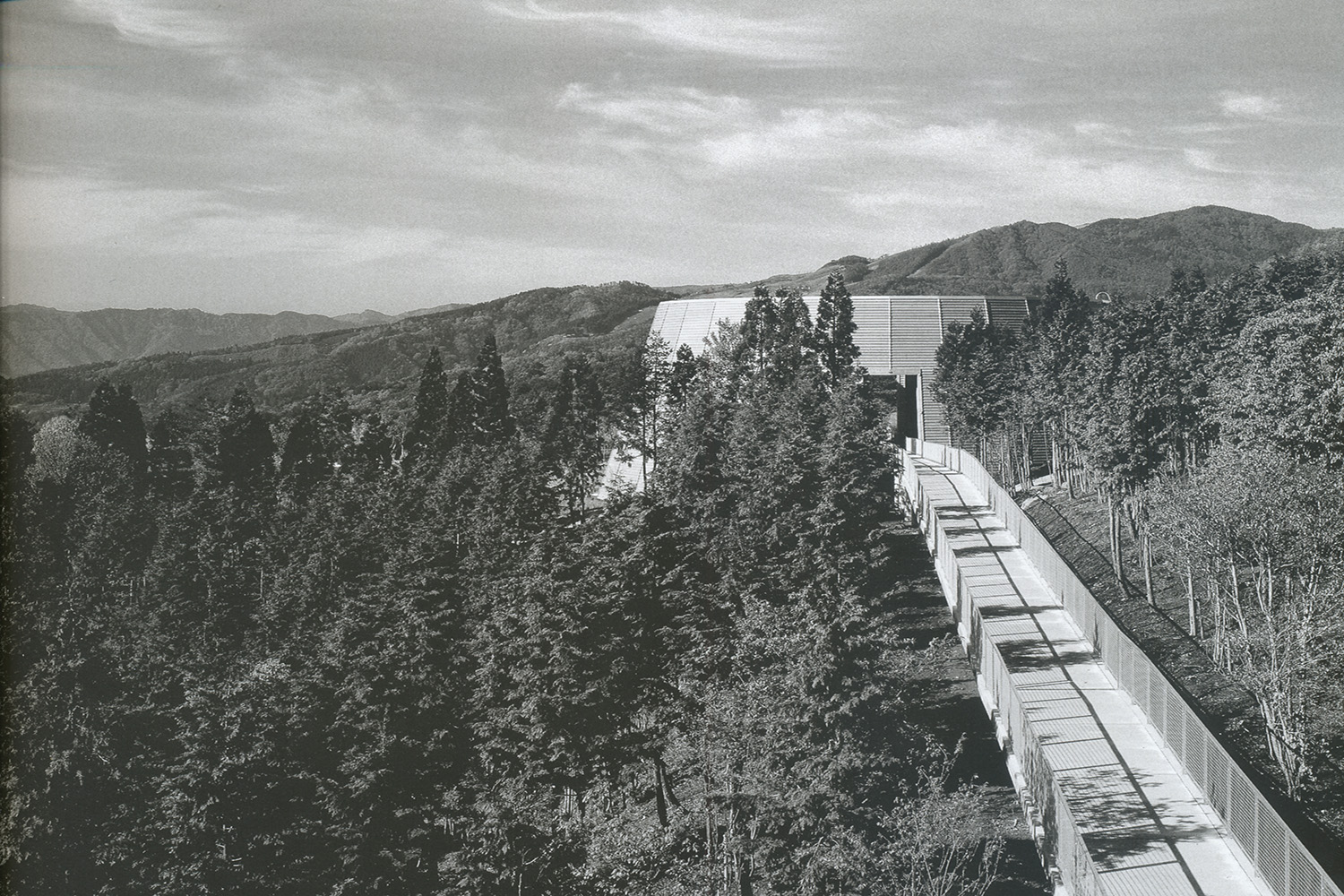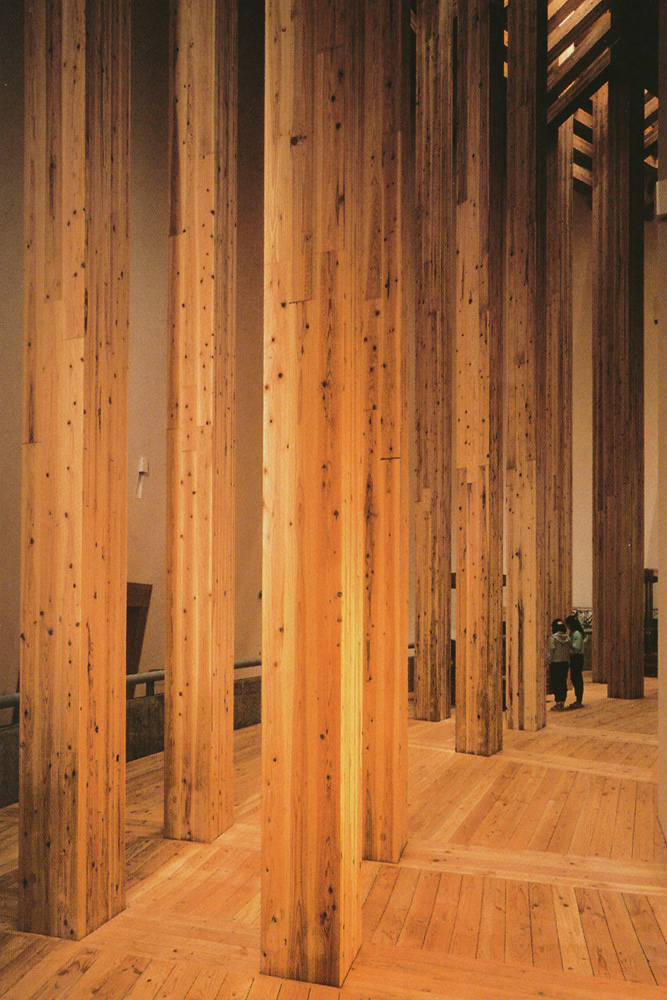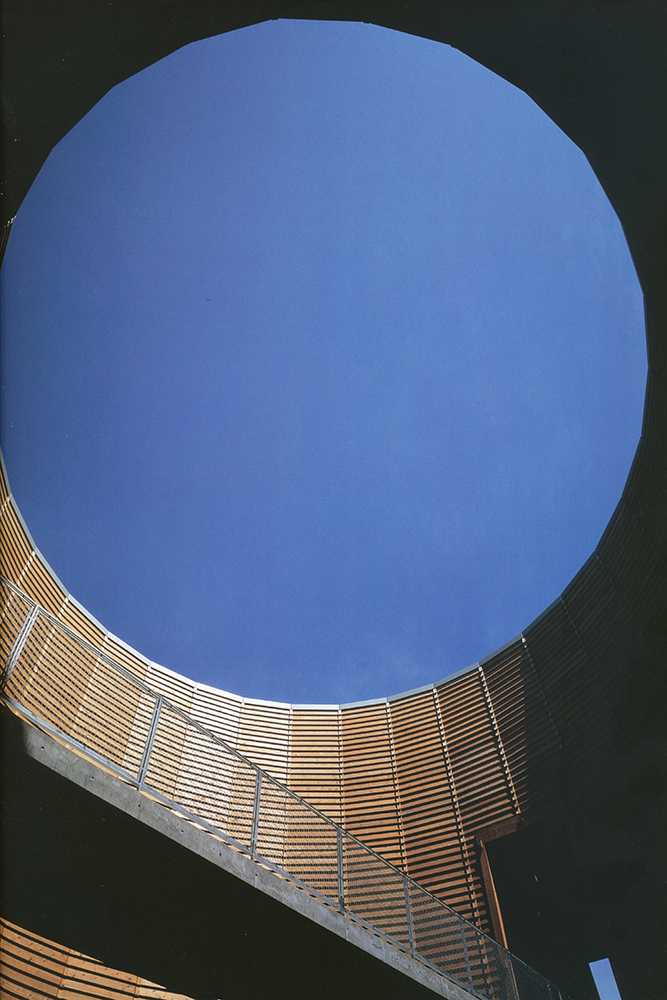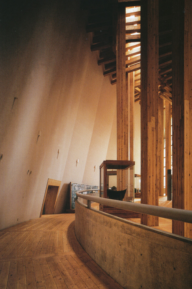 To the left, this view from the approach ramp of the Museum recalls the design of the Meditation Space in Paris, albeit on a larger scale and in wood. However, rather than being closed, as in Paris, the core of the Museum of Wood is open to the sky. This remarkable museum was built to commemorate the 45th National Wood Festival held in Hyogo Prefecture, which occurs on Arbor Day, a ceremony founded by the Emperor of Japan in the 1950s following the wartime destruction of the forests. Located three hours by car from Osaka near a ski resort, the remote, wooded site covers an area of 168 310 m². Built of wood with a steel frame and reinforced concrete, the museum features a ring-shaped exhibit hall with a 46-metre outer diameter and a 22-metre void within. The access bridge cuts directly through the structure, bridging over a central fountain, and leading visitors 200 metres further on to an observation deck and guest house. Inside the museum, a sloping floor guides visitors down along a spiral path, which takes them twice into the central void. Locally milled Hyogo cedar was used for the posts and beams. The enormous laminated wood columns, rising to a height of 16 metres, are arranged in a manner that recalls the forest. Unfortunately, the quality of the exhibits, with models of wooden houses and light-box images, is not equivalent to the extraordinary quality of the architecture. Although not reminiscent of any particular temple, this structure does give at the very least an impression of communion with nature, and recalls that Japan’s rich forests are the source of its traditional interest in wooden architecture. Like a number of his other museums (Chikatsu-Asuka Historical Museum, for example), the Museum of Wood is a homage by the architect to the sources of Japan’s culture and history. Inside the Museum, a spiralling inner walkway greets the visitor. Laminated wooden columns, much like those used in Seville, symbolically recall both the neighbouring forest and the very purpose of the museum. Plans show the distribution of interior space and the essential role played by the empty core of the structure. Right: A view looking up from the level of the fountain in the round interior courtyard.
