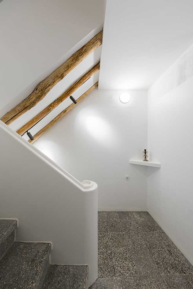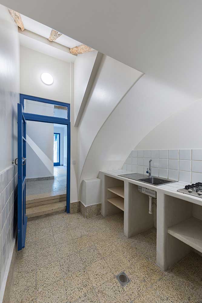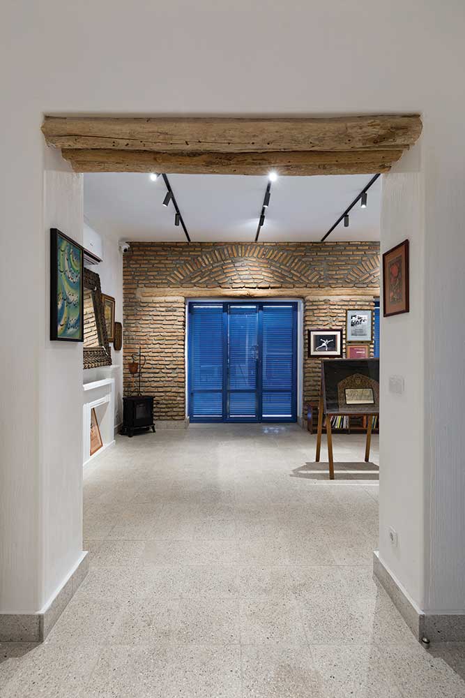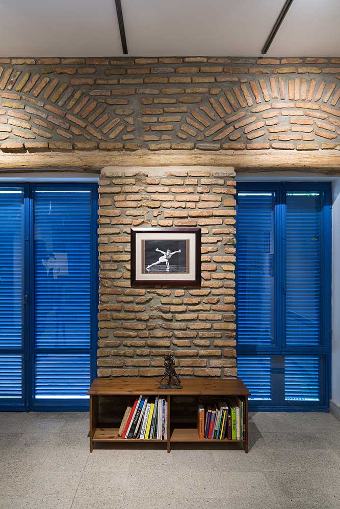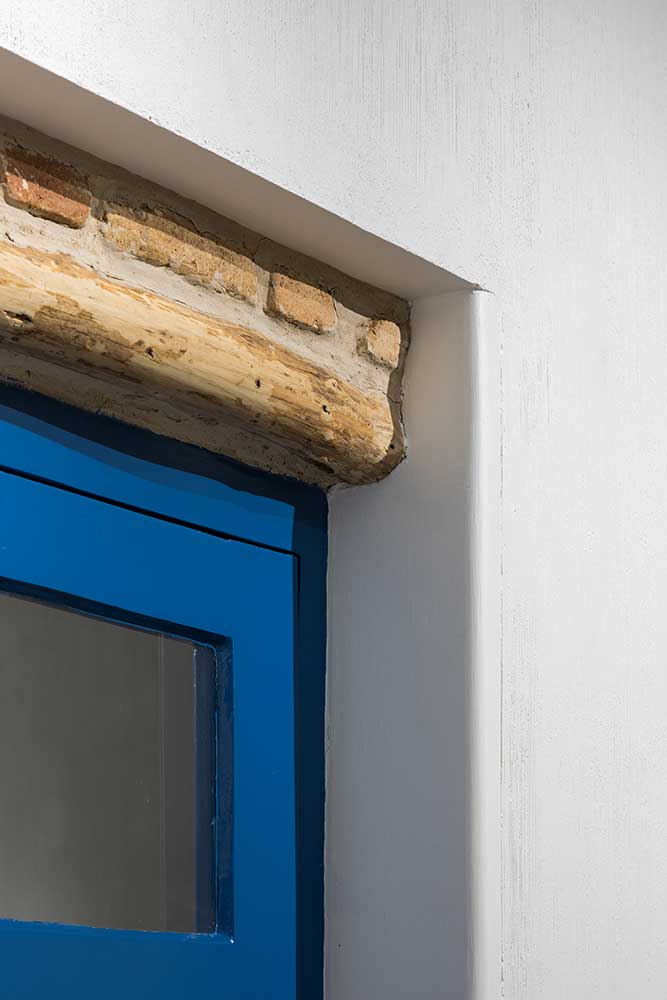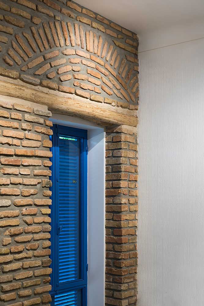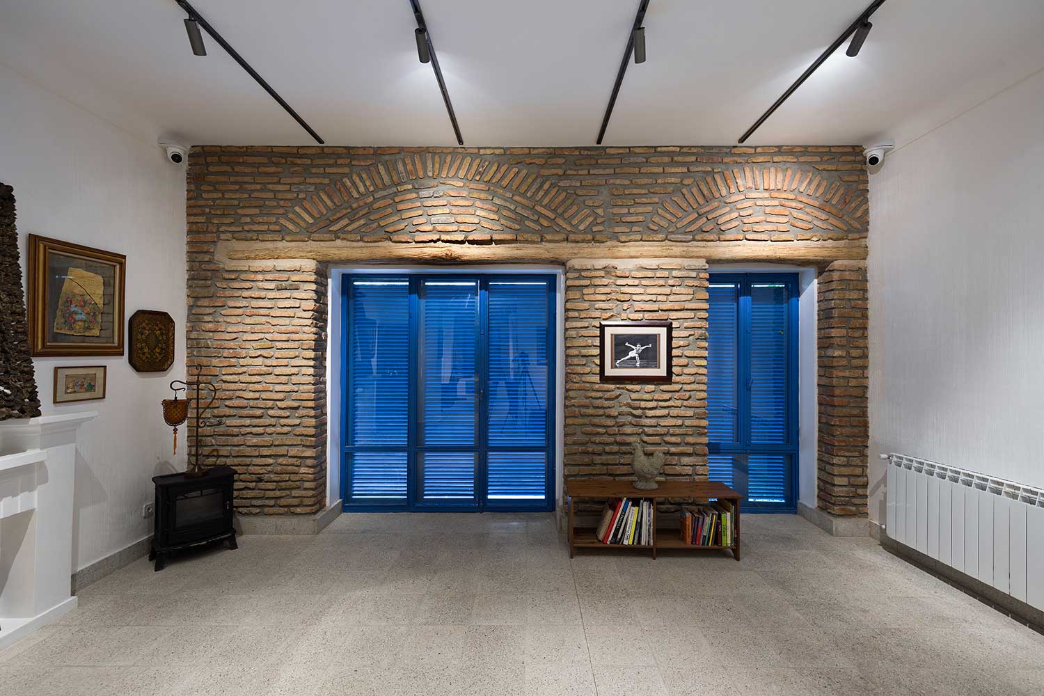 During the restoration of the building’s plasterwork, our attention was drawn to the brickwork and the old wooden lintels above the doors and windows. In some parts of the building, this valuable brickwork was cleaned of plaster, repointed, and left exposed, becoming one of the project’s signature elements. Other valuable features, such as the plaster handrail on the staircase, the terrazzo stairs, the wooden lintels above the doors, the wooden doors, and the main façade of the building, which was finished with washed cement, were repaired, restored, and in some cases, rebuilt to match the original designs.