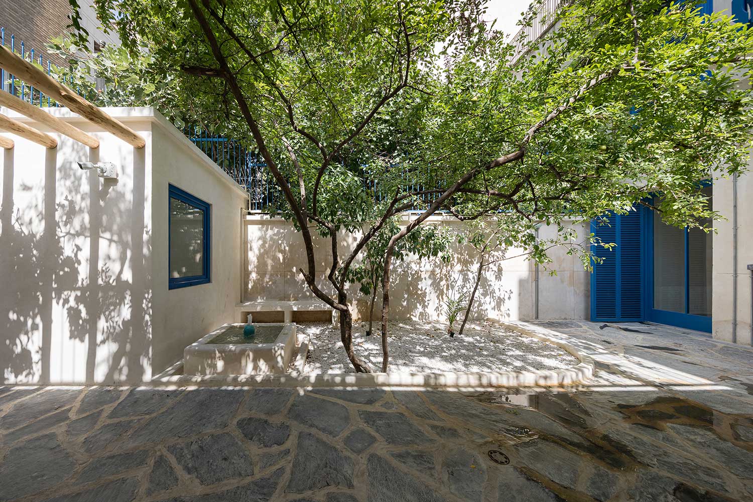 At the entrance of the staircase, a mirror and ballet barre were symbolically designed and installed to immediately convey the artistic background of the homeowner to visitors. All the southern windows of the building were extended to full height, and on the ground floor, the window openings were designed to seamlessly connect the courtyard with the performance space. Wooden shutters were designed for all the windows to provide appropriate shading and secure the house when locked. The entrance pergola was restored using slender tree trunks to support the old grapevine branches, creating a pleasant shaded area at the courtyard entrance. Additionally, a fountain was installed in the corner of the garden to evoke the ambiance of a traditional Iranian courtyard with the soothing sound of water.