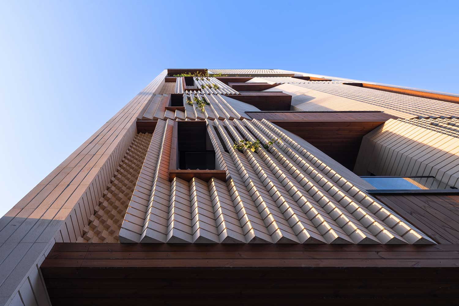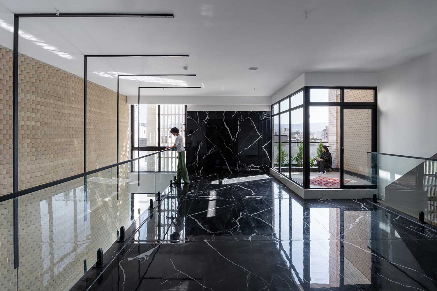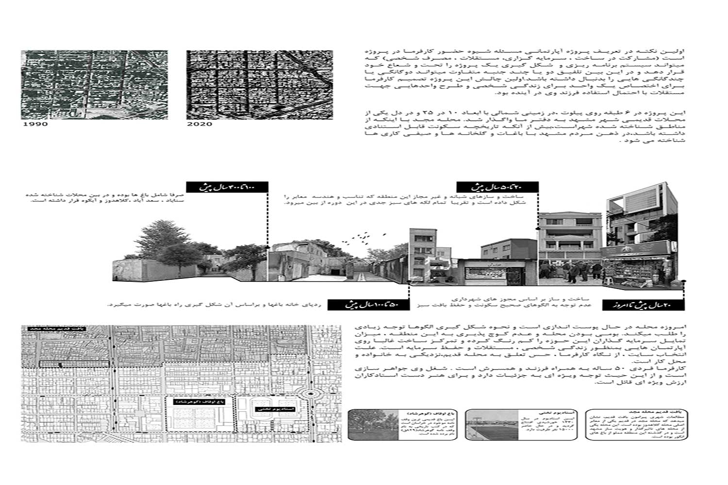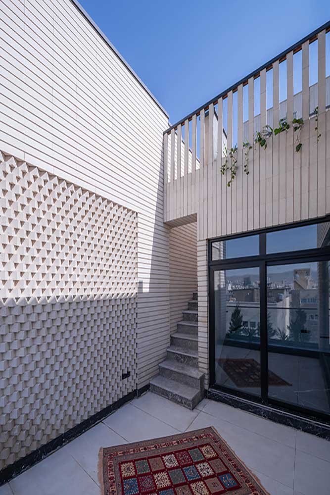 The primary challenge of the project was to establish a connection between the client’s preferences for their living area and the neighborhood’s historical, cultural, and economic features. As architects, we saw our task as developing a model that could both blend in with the neighborhood’s historical context and serve as a viable substitute for the varied and haphazard structures that have been the long-term homes of the local population. The first strategy to accomplish this is to deal with the creation of memories, which is a junction between the history of the fabric, old dwellings, and the sensation of being in the space, rather than going back to the previous architectural form and image and instead following merely a cursory impression. It caters to the project’s customers and clients.The employer’s definition of the project (construction, investment, independence, personal consumption) is the first point in the definition of an apartment project. This presence can limit the project’s planning and formation system, and in the interim, the combination of two or more distinct aspects may result in duality or multiplicities. The employer’s decision to set aside a unit for his personal use and schedule units for rent with the potential for future usage by his child posed the biggest obstacle to this project.This project was turned over to our office on a six-story program on a 250-meter plot of northern land in the middle of one of Mashhad’s historic neighborhoods. The Majd district is one of the most well-known parts of the city, yet Mashhadis are more familiar with its gardens, greenhouses, and summer homes than with its long history of habitation. The neighborhood is evolving these days, and it takes careful consideration to develop patterns. Due to the neighborhood’s local character and the dearth of new residents, investors are less interested in investing here, and the primary goals of apartment buildings are renting, individual living, and capital preservation. From the employer’s perspective, the location was chosen because of the employee’s feeling of familiarity with the area and proximity to their place of employment and family. The client, who is fifty years old, lives with his spouse and child. Making jewelry is his profession, thus he cherishes the skill of expert artisans and pays close attention to detail in this regard. The employer creates a paradox by pursuing opulent design and summarizing in an opulent manner while simultaneously emphasizing the delightful and unforgettable experience of living in homes with courtyards. Our objective was to rethink employer expectations and pursue luxury in the form of excellence, usefulness, and tangible, personal, and unforgettable experiences.