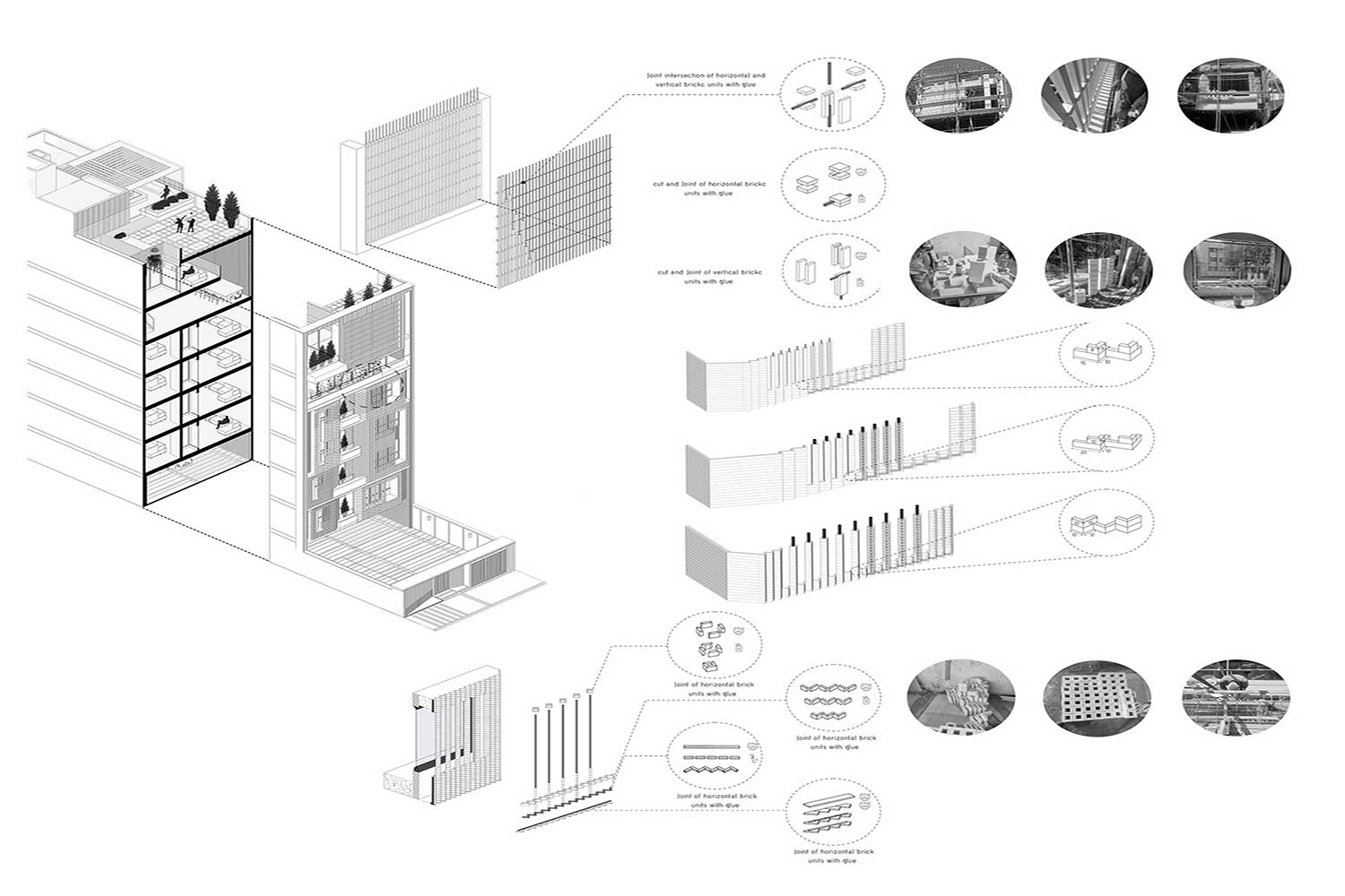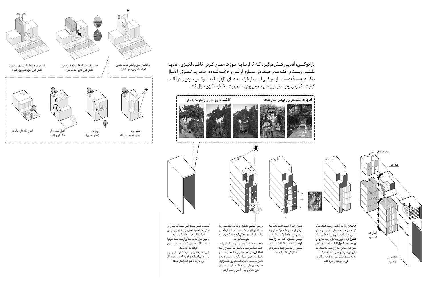 میم انگور: درمطالعات سایت ، گفتگو با ساکنین محله و کارفرما متوجه فصل مشترکی در خاطره جمعی افراد – خانه های حیاط دار و باغ های گذشته محله شدیم. المانی که با توجه به ساختار سازه ای توان حضور در یک بنا به عنوان استراکچر را داراست و در ترجمه به الگوهای معماری و جزئیات ، در بازی نور و سایه ، ایجاد محرمیت ، امکان تهویه ،قابل ادراک است و از طرفی بیانگر سابقه تاریخی و عملکردی محله میباشد .المانی که خاطرات حیات در دل حیاط ها ،از گذشته تا امروز را برای ما مجسم میکند.