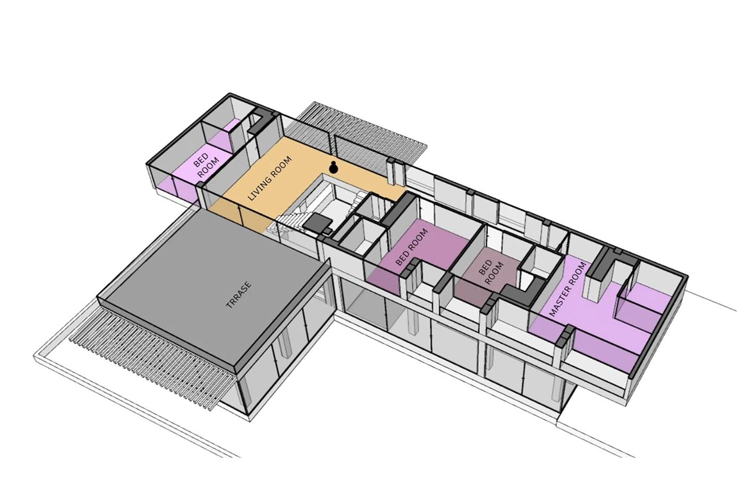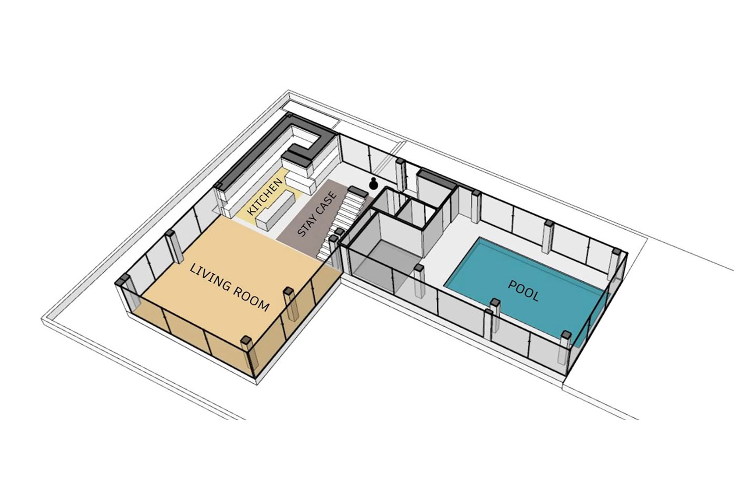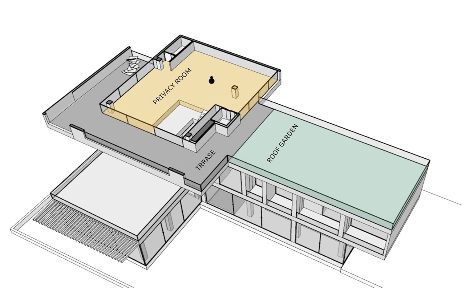دو مکعب شفاف و نیمهباز در دو جهت مخالف روی هم قرار گرفت، بهنحوی که نسبت ارتباط درون و بیرون با نماهای شفاف و قابهای توخالی تعریف شود. تمایل به سادگی و پرهیز از پیچیدگی در فرم این مکعبها بارز است. ساماندهی فضاهای داخلی حول یک فضای تهی مرکزی است و با توجه به ماهیت وجودی ویلا، مفهوم برونگرایی متناسب با اقلیم جغرافیایی و نیز ایجاد فضاهای عمومی متنوع در برنامهی طراحی لحاظ شده است.