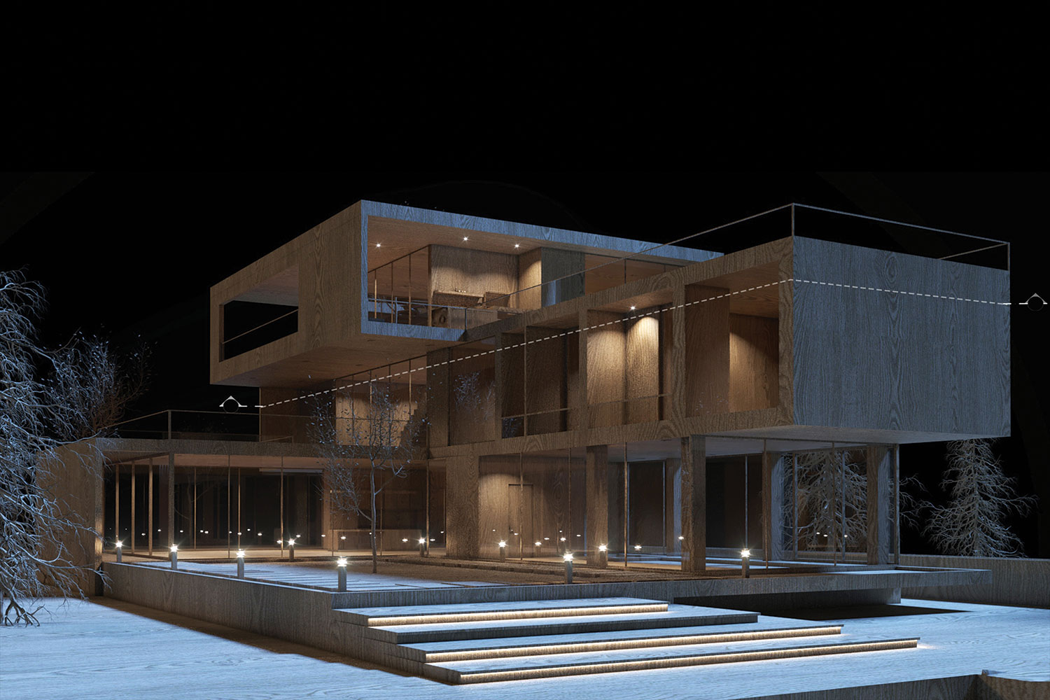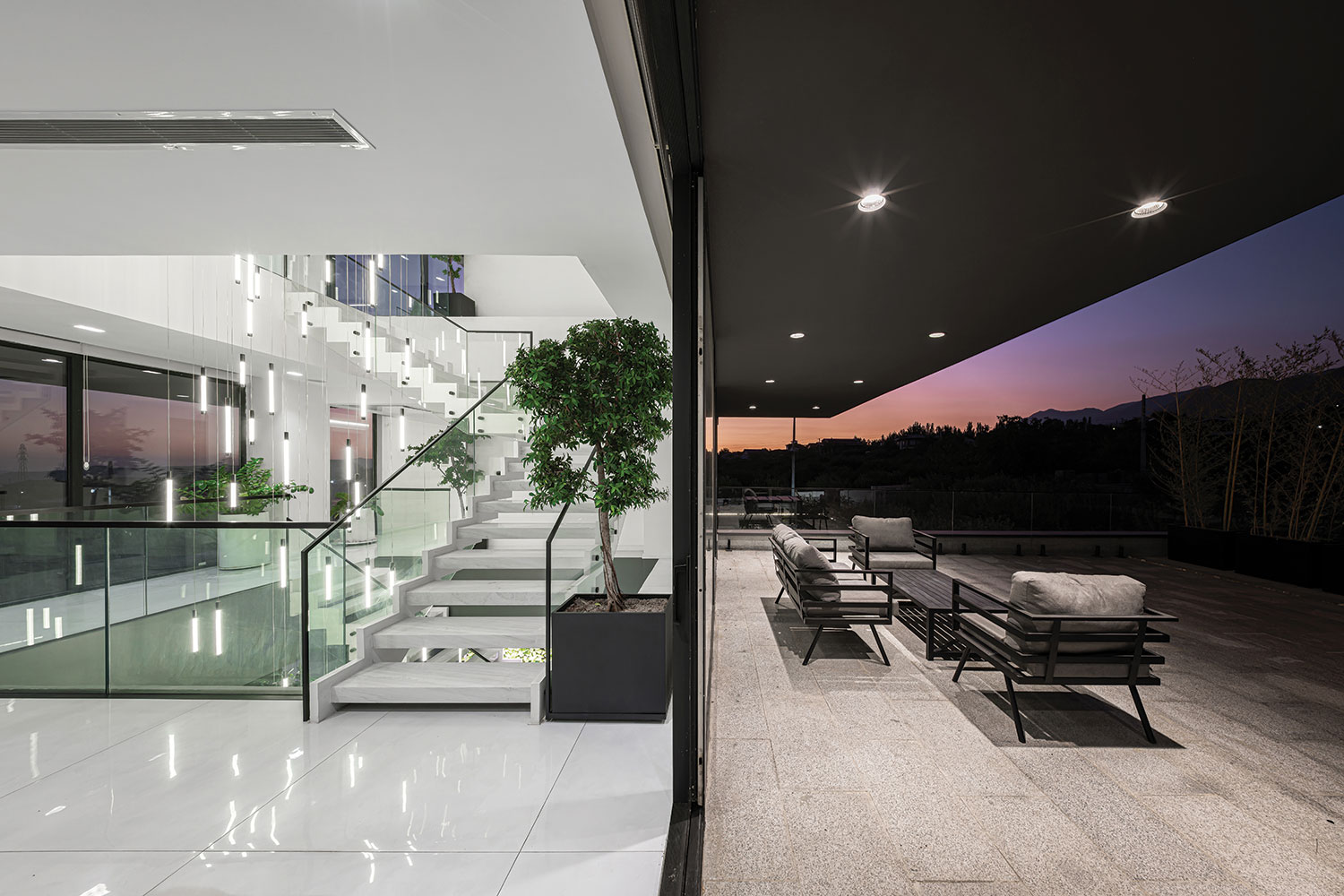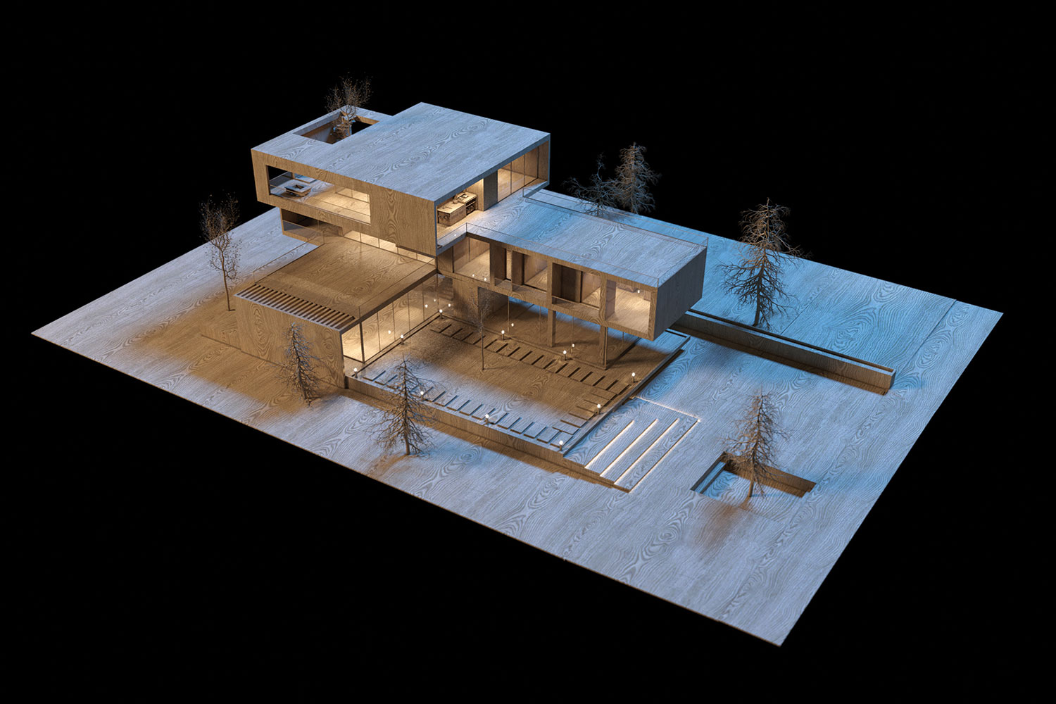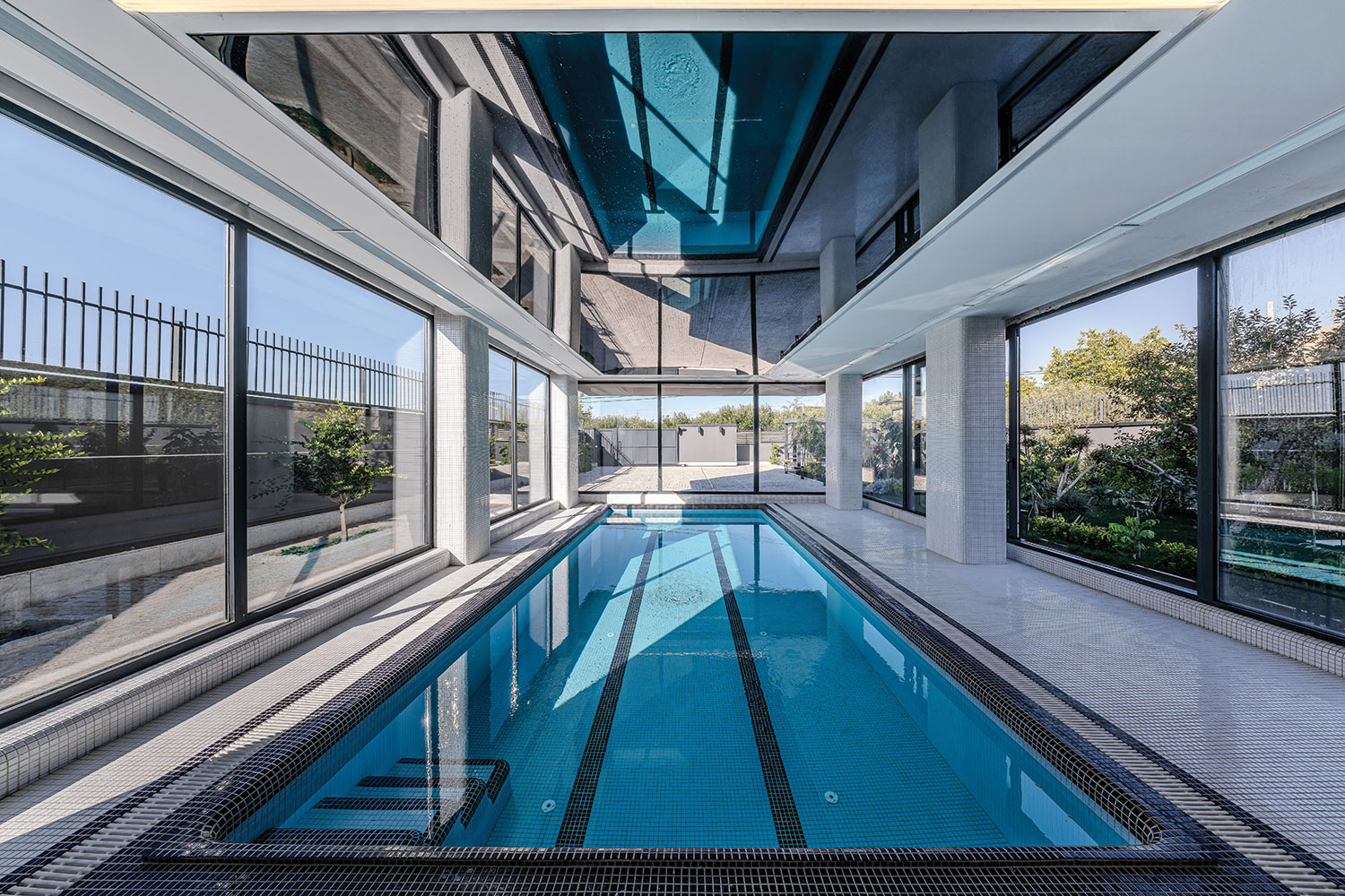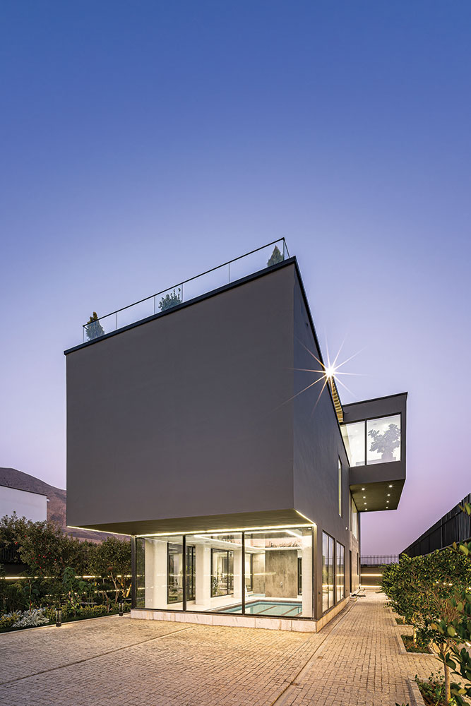 Two transparent and semi-open cubes were stacked in opposite directions, so that the relationship between interior and exterior is defined through transparent facades and hollow frames. The design favors simplicity and avoids complexity in the form of these cubes. The interior spaces are organized around a central void, aligning with the essential nature of a villa, emphasizing extroversion appropriate to the regional climate and incorporating a range of public spaces into the program.
