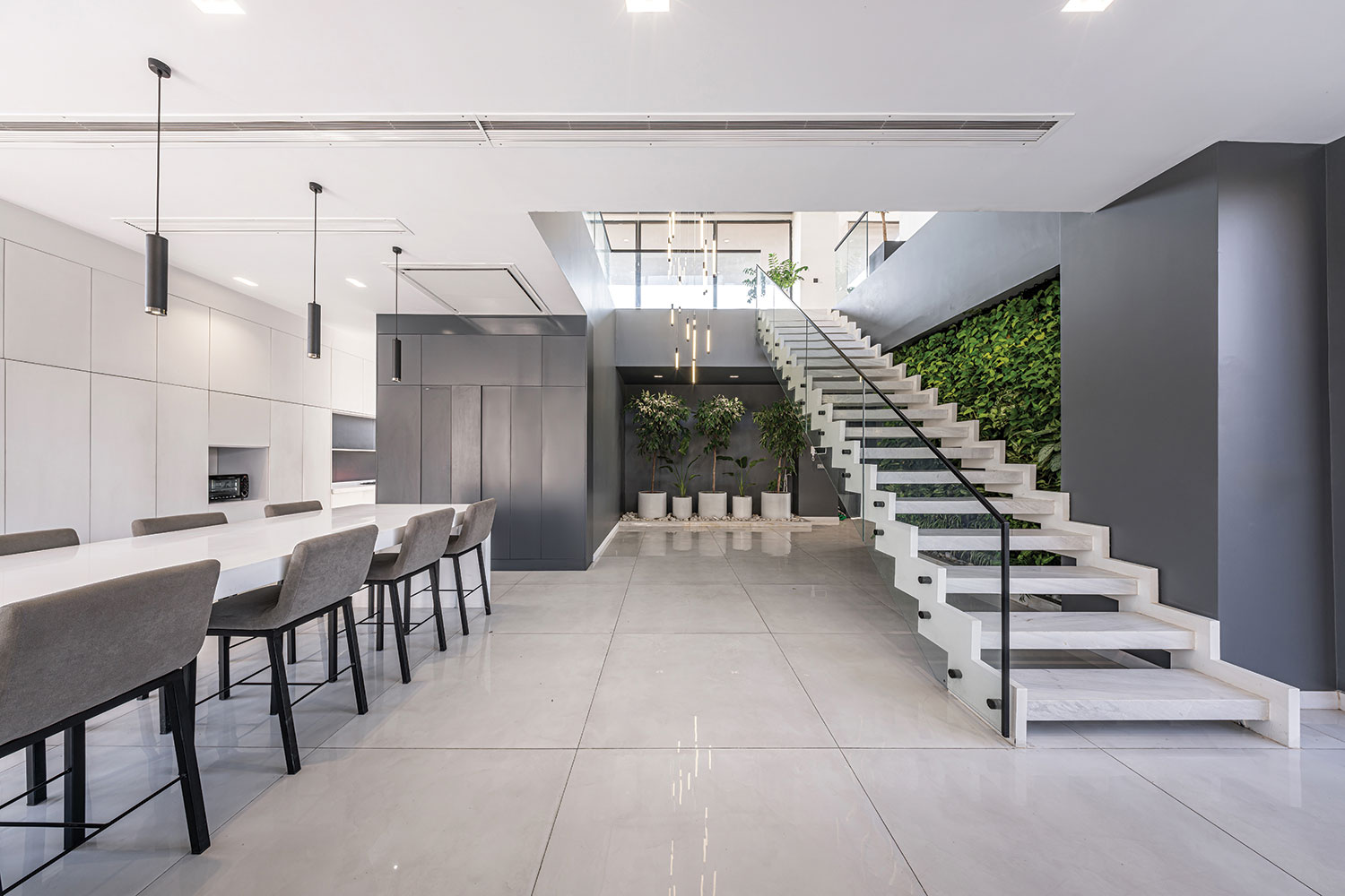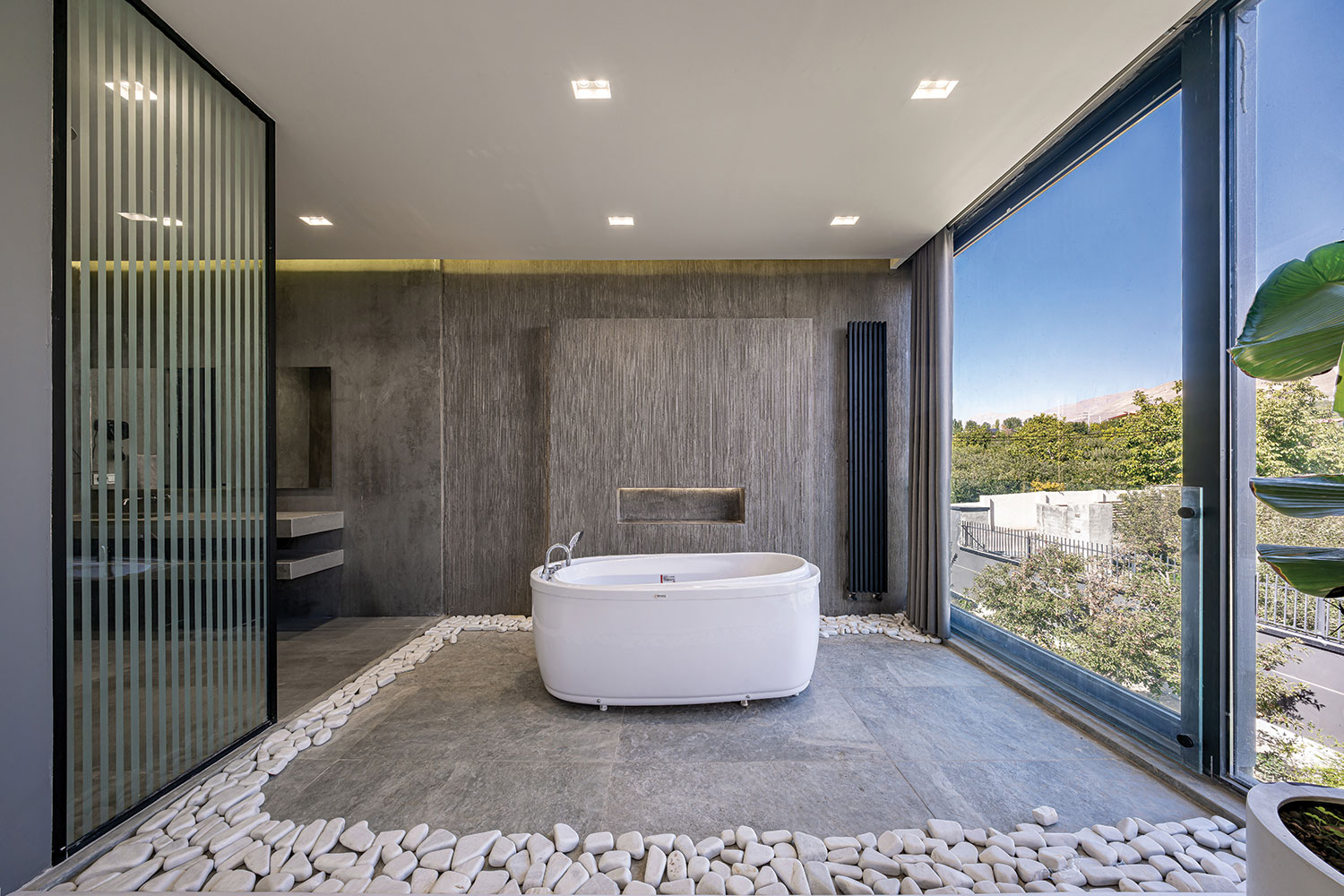 In Villa Sab-Dar, greenery flows from the exterior into the interior through the open hollow frames facing the garden, creating a continuous experience.