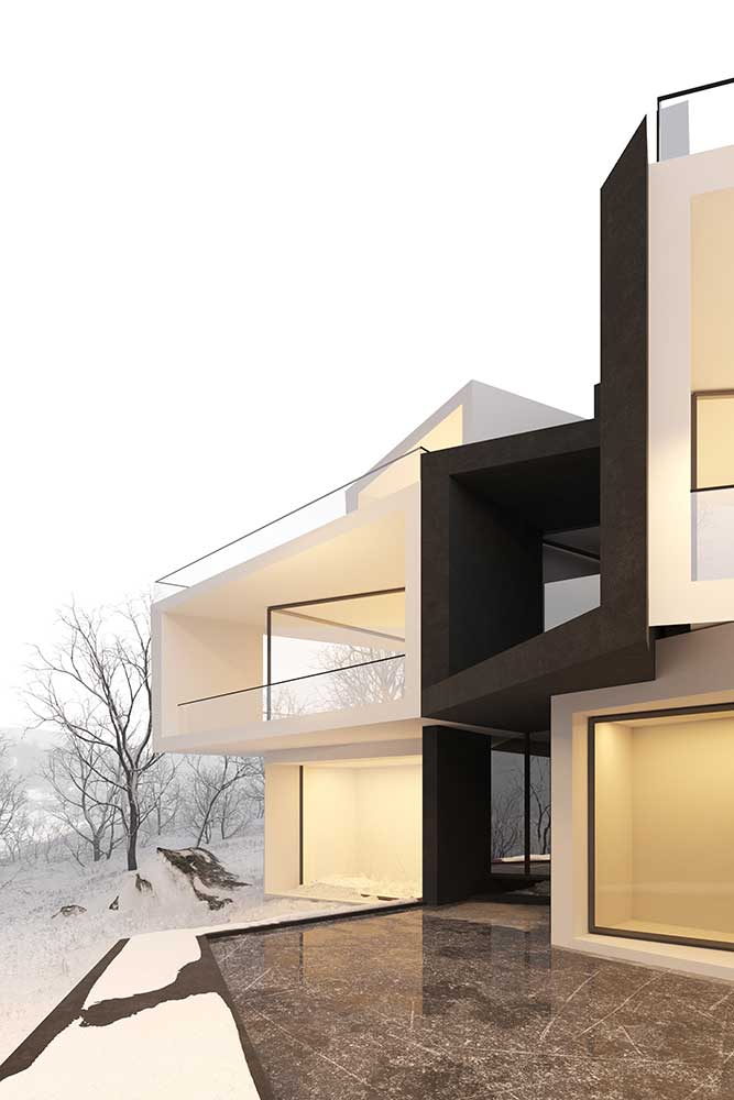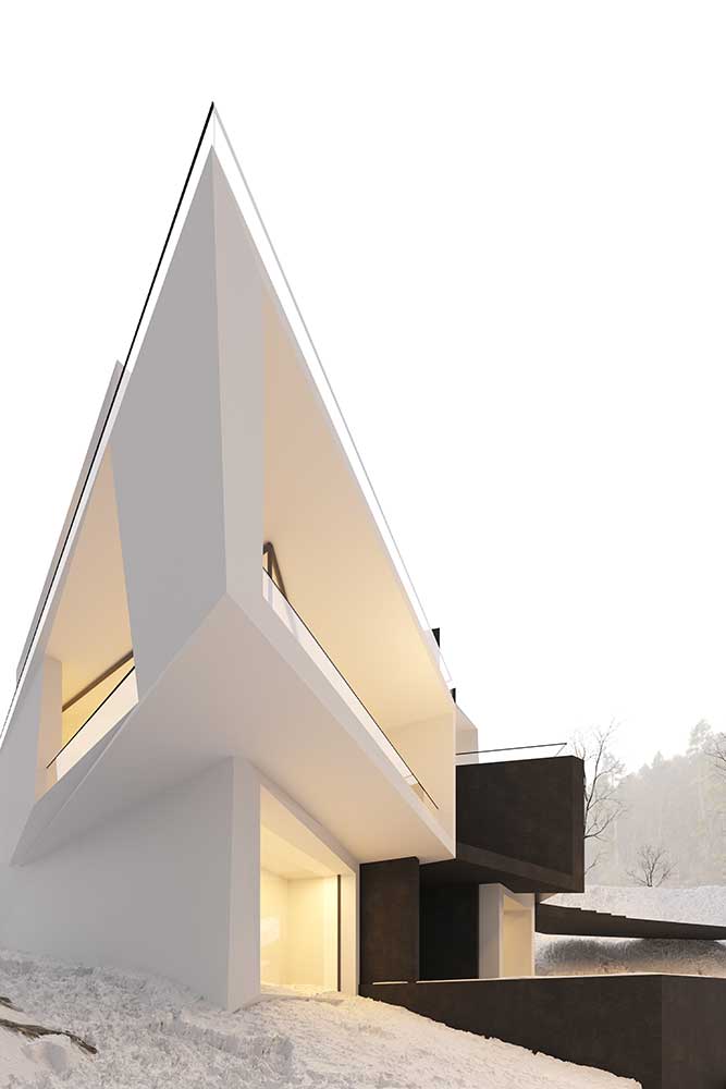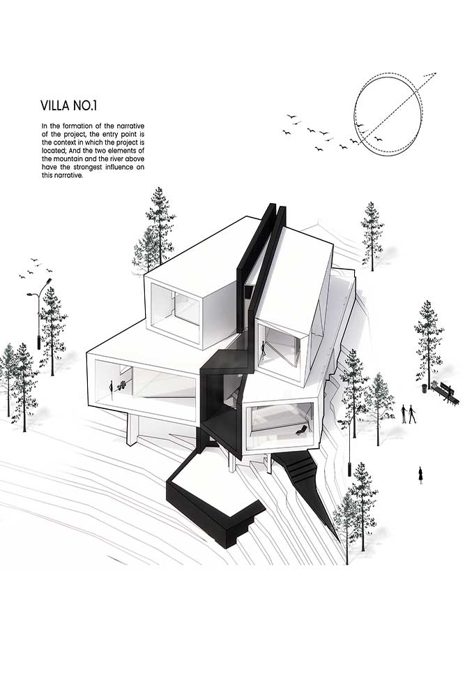 The design narrative of Villa Number One begins with the context of its location, shaped by two key natural elements: the surrounding mountains and the upstream river, both of which heavily influence the design.
