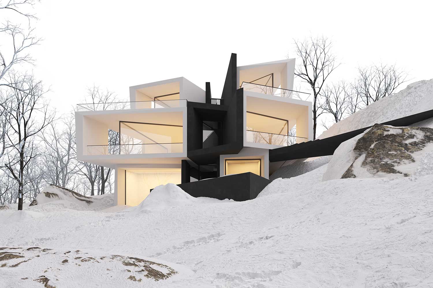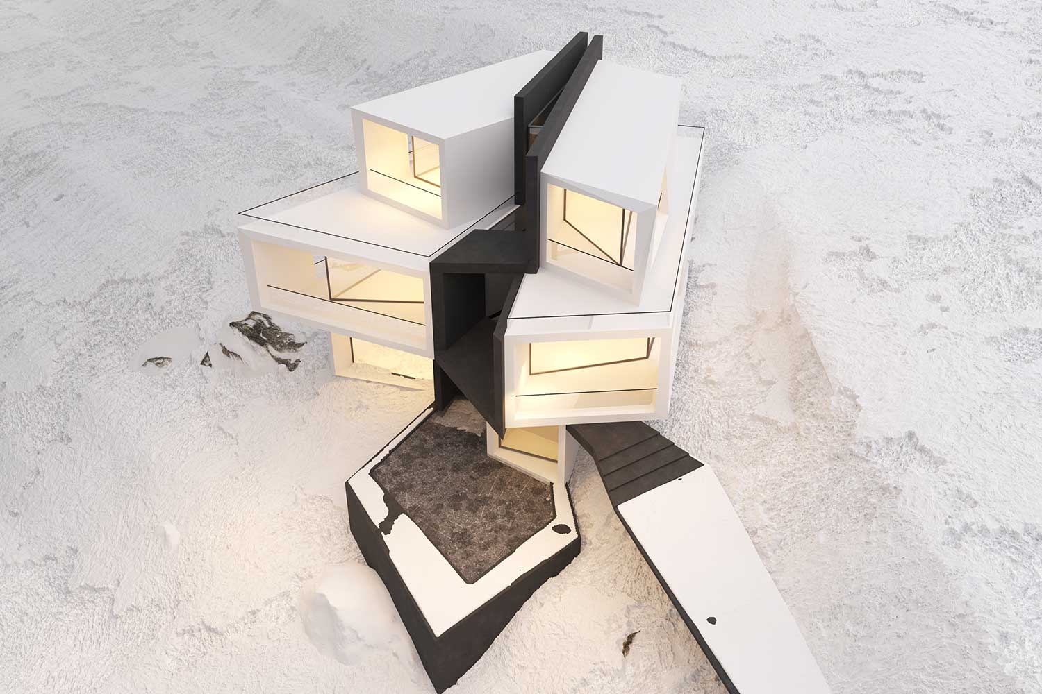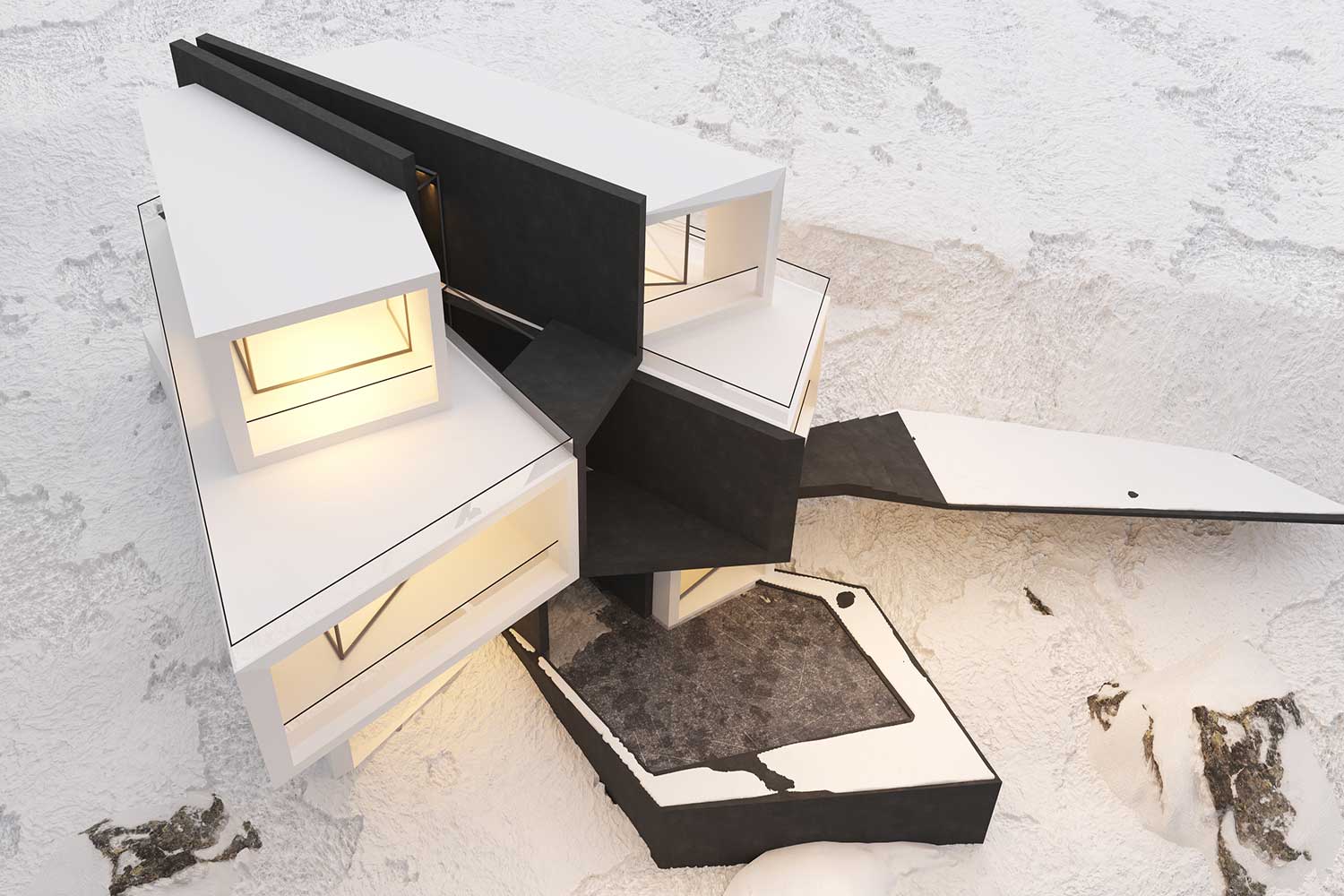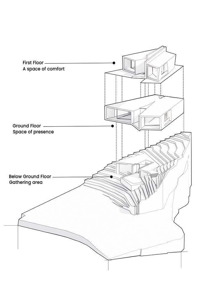 The structure is composed of masses that abstract the forms of the nearby mountains and rocks, coming together to create the overall design. These masses shift and rotate in response to function, either turning toward or away from each other, ultimately interacting to form the final structure.