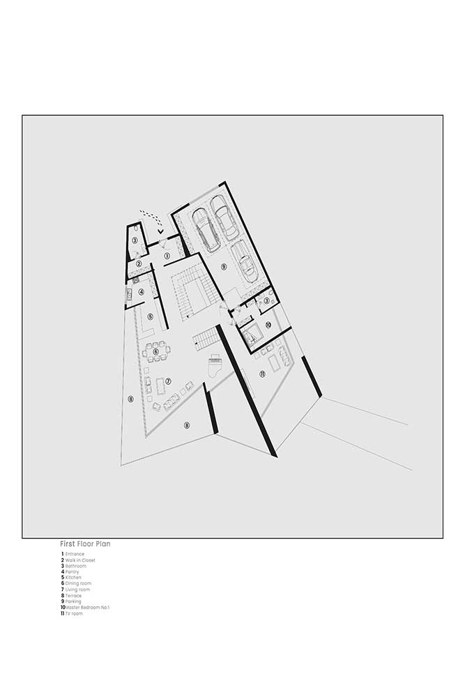 The villa’s layout is spread over three main levels: the comfort zone, the presence zone, and the joy zone. Each level interacts with the others, creating a dynamic relationship between the spaces. The presence zone, which houses the public areas, sits in the middle, acting as both a connector and divider between the comfort zone (upper level) and the joy zone (lower level). On the presence floor, which is aligned with the northern elevation, public spaces like parking, entrances, the kitchen, reception area, living room, and a guest suite are located.