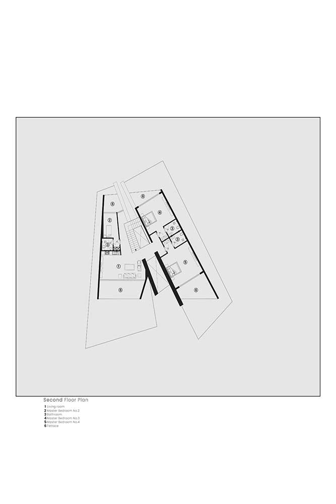 The second key element, the fluid movement of water, flows through the project site, entering the building’s mass, splitting it, and moving through the central void. This flow affects the building and is shaped by it, finally coming to rest in a pool on the lower level. The gap created by this flow, inspired by the nearby river, is lined with hard, fractured natural stone on both sides, creating a visual connection between the exterior and interior of the villa. This gap also allows a narrow beam of light to enter, playing with light and shadow throughout the day to create varied spatial experiences.