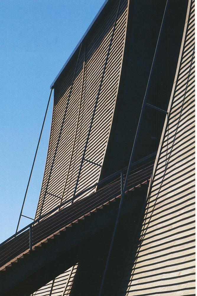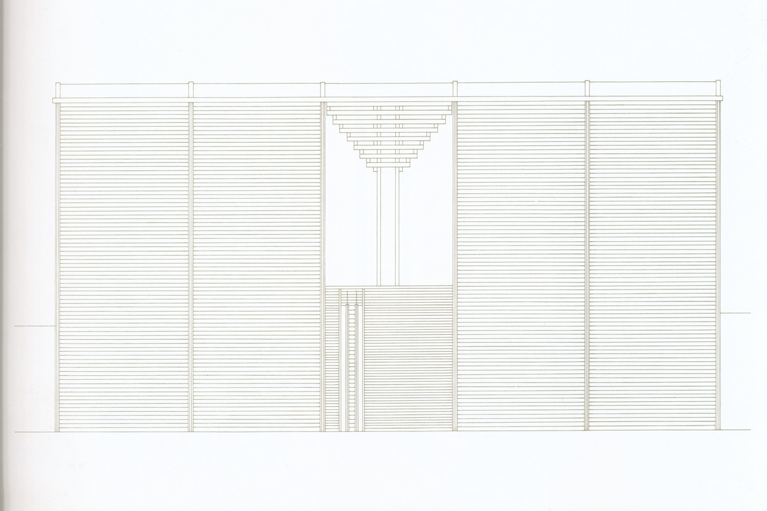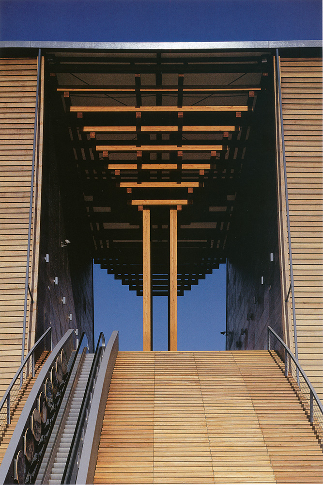 در نخستین تجربهٔ تادائو آندو در عرصهٔ معماری چوبی در مقیاس بزرگ، او از مهارت صنعتگران ژاپنی و همچنین تاریخ طراحی معابد در سرزمین خود بهره گرفت. تصویر بالا: این اسکیس توسط معمار، حجمهای اصلی را تنها با چند خط ساده مشخص میکند. این سازهٔ فوقالعاده، که یکی از بزرگترین ساختمانهای چوبی جهان به شمار میرفت، ۶۰ متر عرض، ۴۰ متر عمق و در بلندترین نقطهٔ خود ۲۵ متر ارتفاع داشت. با ترکیب چوبِ پرداختنشده –یکی از مصالح رایج ساختوساز در ژاپن–، پلی ورودی به شکل طبل ژاپنی (تایکو–باشی)، و عناصری مدرن مانند سقف نیمهشفاف کنترلکنندهٔ نور، پاویون ژاپن برای اکسپو ۹۲ آمیزهای موفق از بهترینهای شرق و غرب بود. با سکوِ ورودی مرتفعی که چشمانداز رودخانهٔ «گوادالکیویر» را ارائه میکرد –همان مسیری که کریستف کلمبوس در سفر اکتشافی خود در آن حرکت کرده بود– پاویون آندو شاید فاصلهای از استفادهٔ رایج او از بتن ایجاد کرد، اما همچنان حس فضا و معماری ویژهٔ او را حفظ نمود؛ حسی که یادآور معابد ژاپنی است. طراحی این پاویون پیوند مستقیمی با «موزهٔ چوب» و همچنین آثار متأخر آندو دارد، مانند معبد «کومیو-جی» در سائیجو یا موزهٔ چوب در «نااووشیما». پاویون ژاپن، همچون دیگر بناهای چوبی مدرن، نتیجهٔ گفتوگویی میان سنت معماری چوبی ژاپن و فناوریهای نوین است. چوبهای لمینیتشدهای که در اینجا و در پروژههایی مانند کومیو-جی استفاده شدند، به معمار اجازه میدهند در مقیاسی بزرگ و با بنیانی مدرن کار کند، بیآنکه پیوند خود با گذشته را قربانی کند. گذشته از این ملاحظات، چوب لمینیتشده در این پروژه ثابت کرده که مادهای اقتصادی، بادوام و قابلبازیافت است. با ترکیب نماهای منحنی و صعودی و پلی قوسیشکل، پاویون حالوهوایی از «کشتی نوح» دارد. اما در عین حال، یادآور برخی طرحهای معابد بستهٔ ژاپنی نیز هست؛ همان فضاهایی که سنتاً برای محافظت از اشیای ارزشمند استفاده میشدند. پایین: تصویری از پاویون پس از افتتاح برای عموم. حضور یادمانی و سترگ این سازه، با ازدحام مردم در برابر آن و هنگام بالا رفتن از پل، آشکارتر میشود. بالا: دیدگاههایی از نمای منحنی و پل. پایین: نمای روبهرو. هنگامی که انحناهای مؤثر بر نمای پاویون و پل ورودی حذف میشوند، نمای روبهرو نظم هندسی بنیادی طراحی را آشکار میسازد. نگاه به سازهٔ چوبی از پایین: بخشی از مسیر حرکتی درون پاویون بازدیدکننده را در نزدیکی عناصر چوبی لمینیتشده قرار میدهد؛ عناصری که تداوم و تکامل فنون سنتی درودگری ژاپنی را به شکلی مدرن ارائه میکنند. در سمت راست: نقشههای طبقات، هندسهٔ فشرده و منظم درونی را آشکار میسازد؛ هندسهای که در پسِ شکل سیال و پوستهٔ بیرونی پاویون پنهان است.