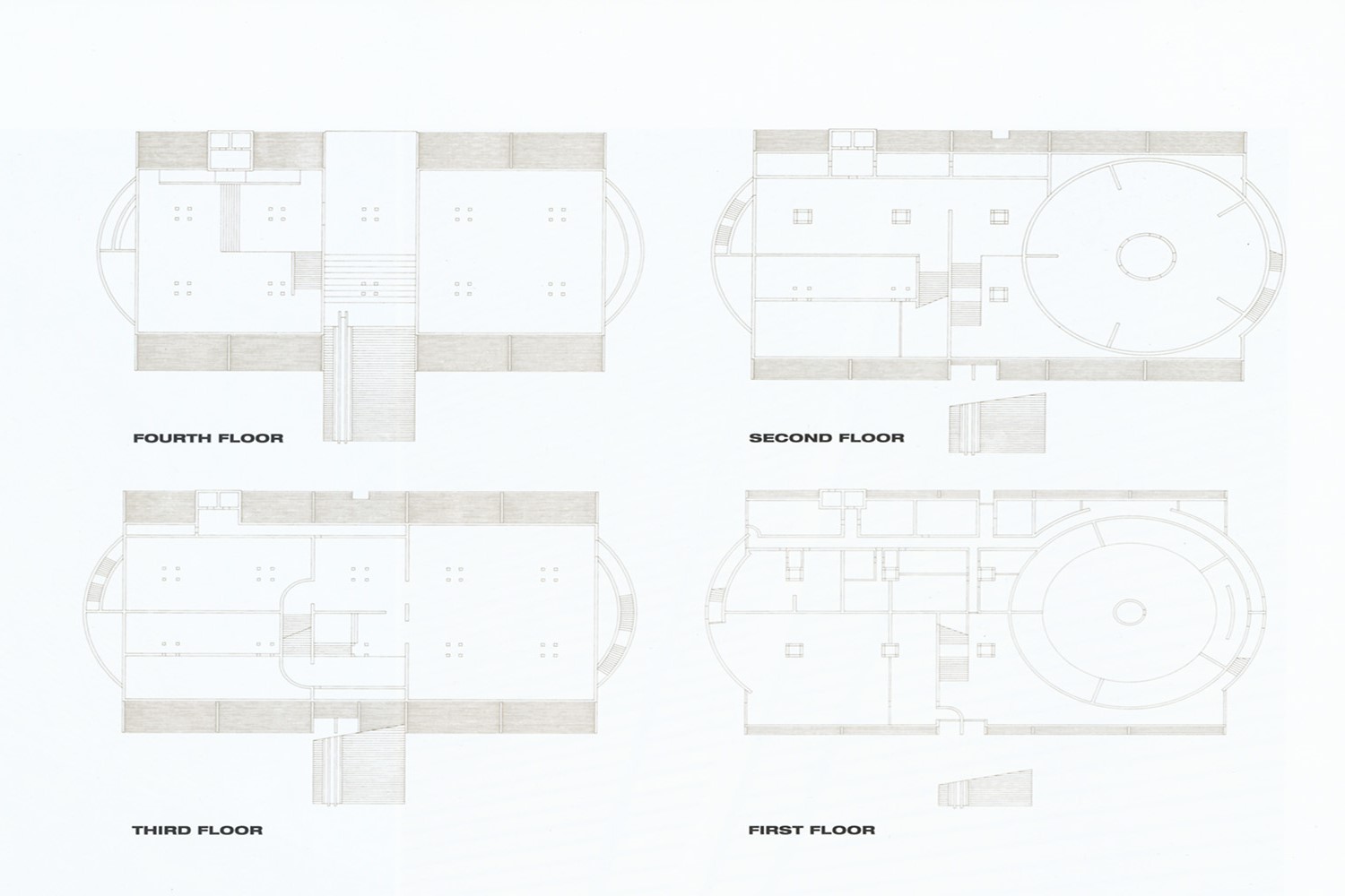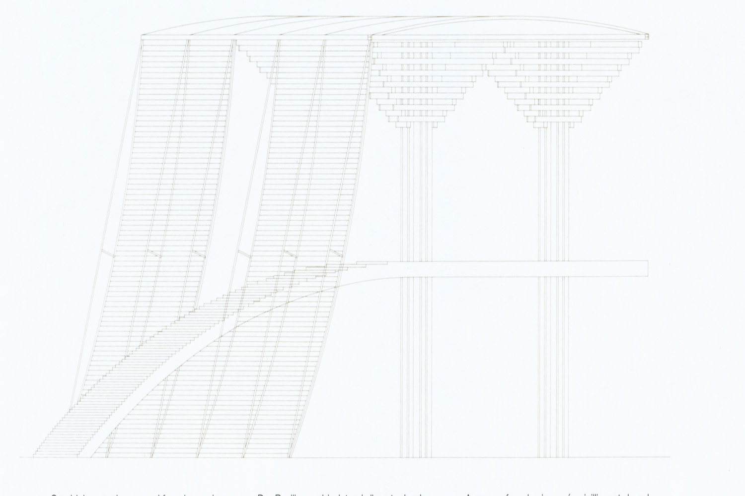 For his first effort in large-scale wooden architecture, Tadao Ando called on the expertise of Japanese craftsmen, as well as on the history of temple design in his country. Above: This sketch by the architect defines the basic volumes with just a few strokes of the pencil. This exceptional structure, one of the largest wooden buildings in the world, was 60 metres wide, 40 metres deep and 25 metres high at its tallest point. By combining unpainted wood, one of the typical construction materials in Japan, a drum-shaped entrance bridge (taiko-bashi) and such modern elements as a translucent deflection screen roof, the Japanese Pavilion for Expo ’92 was a successful blend of the best of East and West. With its elevated entrance platform overlooking the Guadalquivir river where Christopher Columbus sailed on his voyage of discovery, Ando’s pavilion may have represented something of a departure from his more frequent use of concrete, but it does very much conserve his sense of space and architecture, something akin to Japanese temples. The design of this pavilion has a direct connection to that of the Museum of Wood, and to more recent works such as the Komyo-ji Temple in Saijo or the Museum of Wood on Naoshima. The Japan Pavilion, like the modern wooden buildings, is also the result of a dialogue between the Japanese tradition of wooden architecture and modern technology. The laminated timber used here and in Komyo-ji, for example, permits the architect to engage in work that have a large scale and a modernist basis without sacrificing design ties to the past. Beyond these considerations, laminated timber has been shown here to be an economically viable and recyclable material. Combining soaring curved facades and an arched bridge, the pavilion has something of Noah’s Ark about it. But it also recalls some of the closed temple designs seen in Japan, which are traditionally used for safeguarding precious objects. Below: A picture of the Pavilion after its opening to the public. The monumental presence of the structure becomes even more apparent with the crowds in front and going up the bridge. Above: Views of the curved facades and bridge. Below: A front elevation. Stripped of the curves that actually make up the façade and approach bridge, the elevation reveals the fundamental geometric regularity of the design. Looking up at the framing: Part of the journey through the interior brings the visitor close to the laminated timber components, a modern refinement of traditional Japanese joinery. On the right: Floor plans show the tight, orderly geometry behind the flowing outer form of the pavilion.