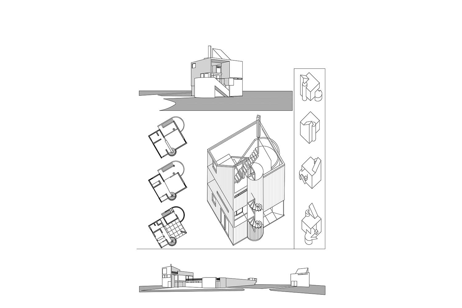 گوئاتمی تصمیم گرفت تا پروژه را به سان مجسمهای بر بستر زمین بنا کند و برای این منظور، دست به برش و کار با اشکال هندسی اصلی زد. برشها به دنبال نیاز کاربری، سایت، جهت تابش نور طبیعی و ضروریات سازه زده شدند. نشیمن، غذاخوری، آشپزخانه و اتاق خواب اصلی از فضاهای اساسی خانه و استودیو، دو اتاق مهمان و یک کارگاه از نیازهای اصلی ساختمان استودیو بودند. به طور کلی، طراحی به صورت خطوط عمودی و سازماندهی فضاها انجام شد. میتوان این خانه را به سه تراز مختلف تقسیم نمود: کف (شامل کارگاه، تراس مسقف و دو اتاق مهمان)، مسکونی (نشیمن، غذاخوری و آشپزخانه) و طبقهی سوم (بخش خصوصی شامل اتاق خواب اصلی و استودیو در پشت بالکنی که به نشیمنِ دابلهایت اشراف دارد). حال که عمومیترین بخش خانه در فضای میانی آن قرار گرفته، ارتباط تازهای میان این فضا و تراز همکف برقرار گشته است که در زمان خود موقعیتی بدیع در مقایسه با سایر بناهای مسکونی محسوب میشود.