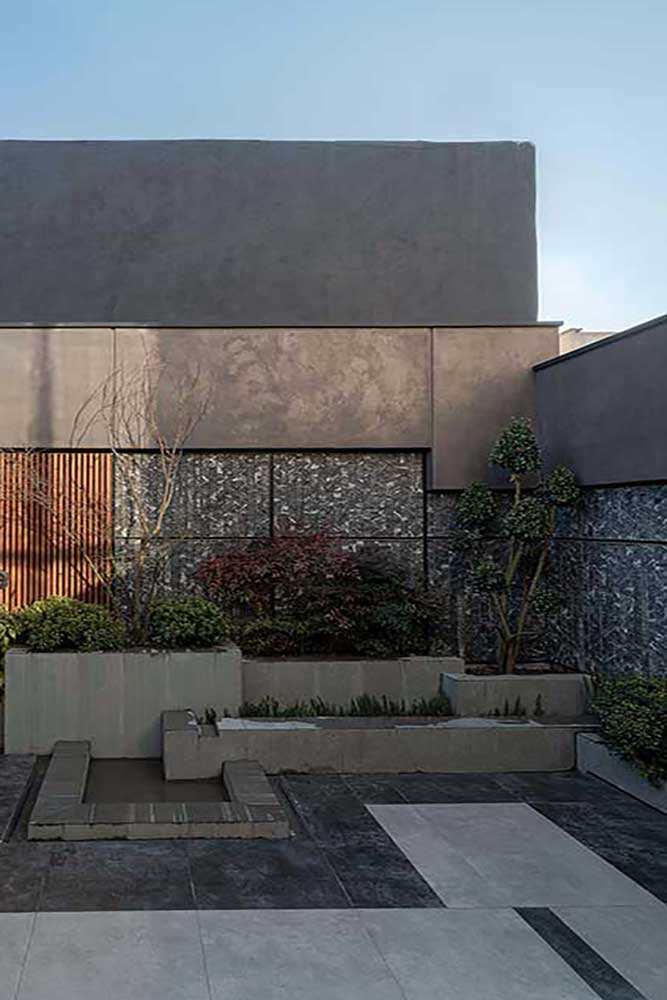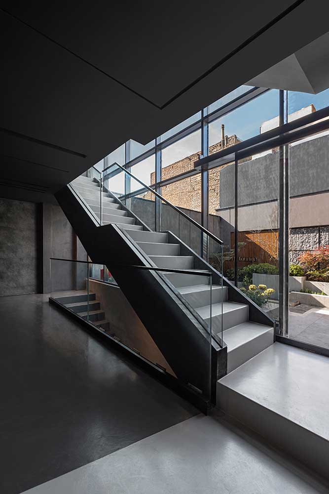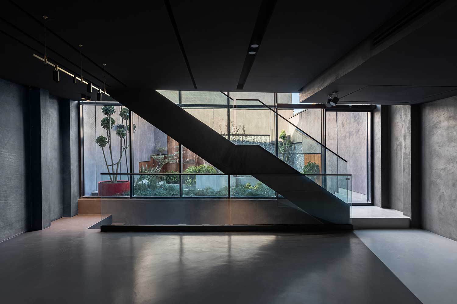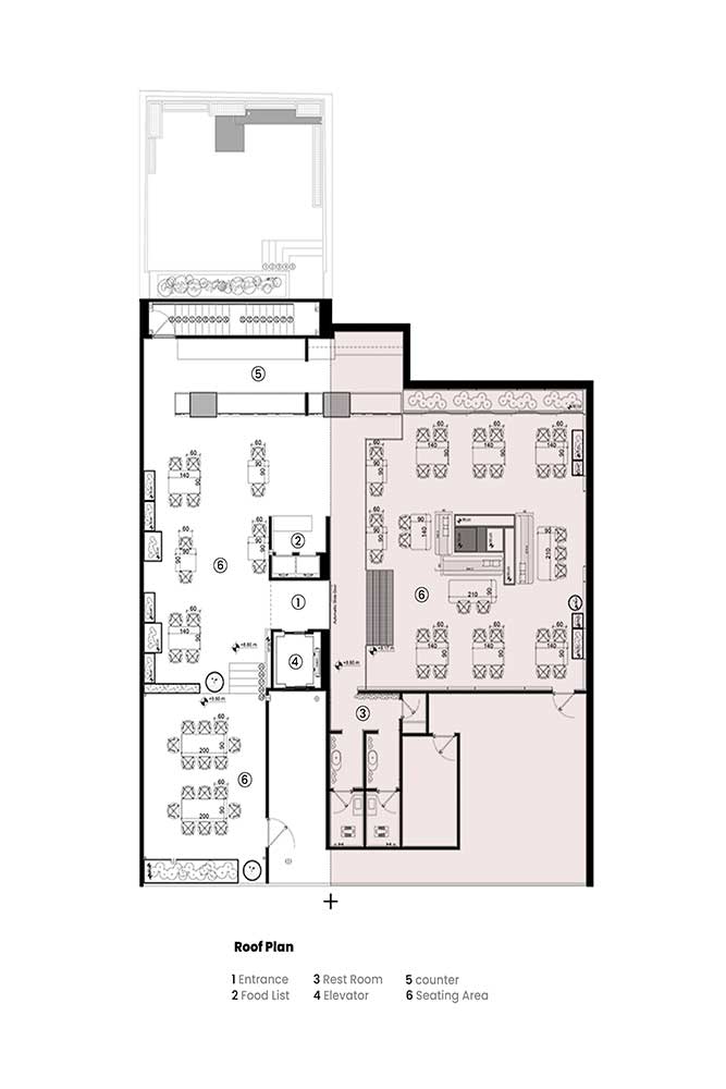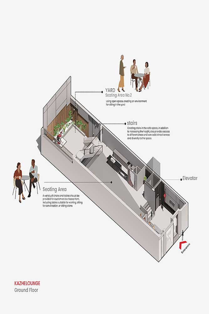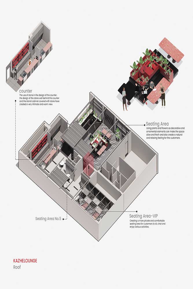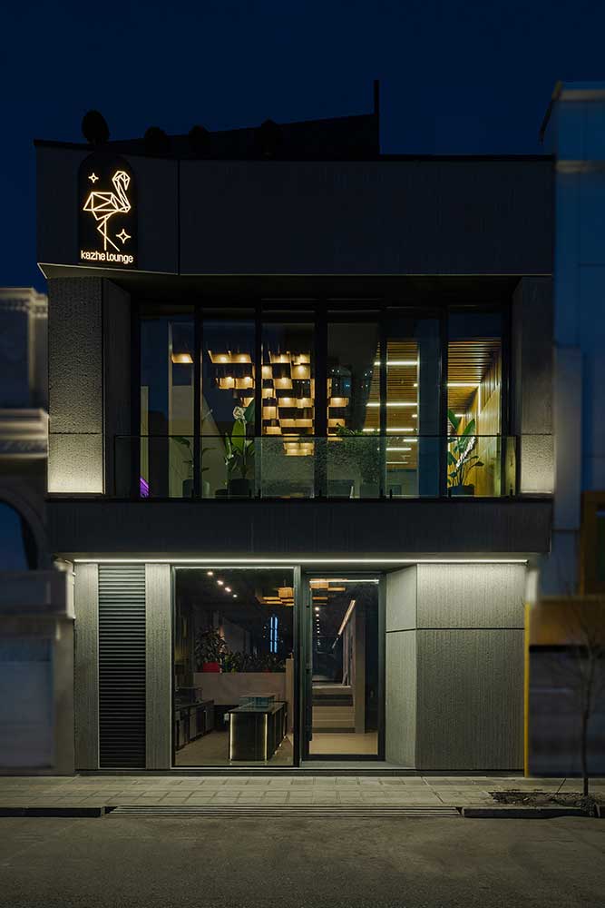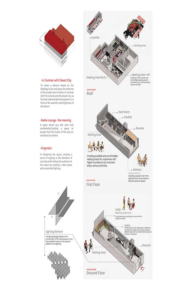 Kazhe Lounge is a restaurant-café set on three floors for relaxation. Relaxation in a contrasting atmosphere. Contrasted with the hot, bright and desert of Qom – a dark, cool and green atmosphere. Contrast became the first key word and the basis of our design. A contrast in the atmosphere of the cafe that is complete in the cohabitation of the city.The project was designed in two general phases. In the first phase, by changing the use of a residential property to commercial, flat and uniform spaces were created on the floors. An attractive staircase was designed to access the floors. This approach provided a flexible and practical space for various activities. In the second phase, the employer chose the use of the restaurant cafe for the project. A restaurant that is more than the existing restaurants in Qom. kazhe Lounge became more than a simple restaurant cafe, it became a multi-purpose space. The main goal was to create a platform that, while responding to the various needs of citizens, does not encourage them to travel outside the city. Contrasting design with a desert city: The interior elements of kazhe Lounge were designed in complete contrast to the desert environment of Qom city. This contrast was created in the cold and dark colors chosen for the spaces, in the broken and right-angled form in contrast with the soft forms of the desert, and in the comfort and coolness of the vegetations. This contrast appeared in the color of the floor as a broken line and separated the sitting and moving spaces in two different colors. After that, the intertwined pieces of iron sheet created a unique chandelier, which as an inviting element, it encouraged the audience to discover the atmosphere of the lounge. This chandelier, with its half bright and half dark appearance, created a sense of mystery and curiosity upon entering the space. This chandelier spreads over two floors and connects the floors. For different spatial experiences, different range of spaces were considered, spaces were designed in categories of closed, semi-open and open spaces. The quality that attracts the audience in the restaurant space and makes them come many times to experience different corners. Sculptural element, flamingo: the design scenario of the lounge cage needed an attractive character to nest in this space and surprise the audience with its presence. Therefore, they used details and elements inspired by flamingos in different spaces of kazhe Lounge. This beautiful and special bird was a symbol of freedom and travel and it doubled the charm of the space. The color of this element moved in different spaces and sewed the spaces together like an invisible string. Finally, kazhe Lounge was an attempt to create different and yet interconnected spaces. The different floors of this collection, by maintaining continuity and coherence, acquired a unique and distinct quality. By offering a different and relaxing atmosphere, Kazhe Lounge became a refuge for Qom citizens and invited them to a pure sensual experience in the heart of the desert.