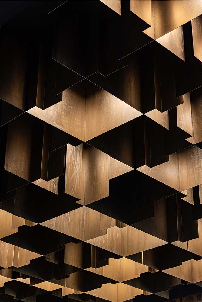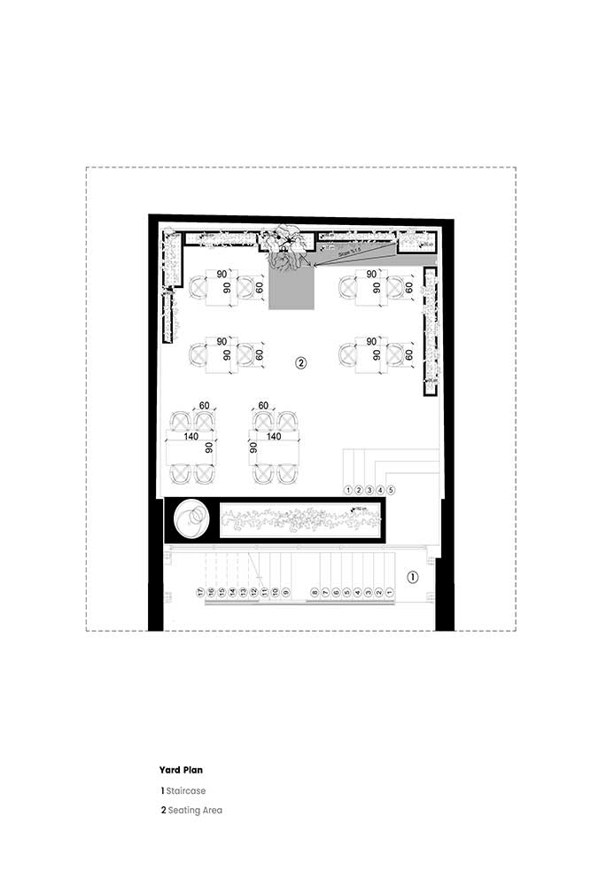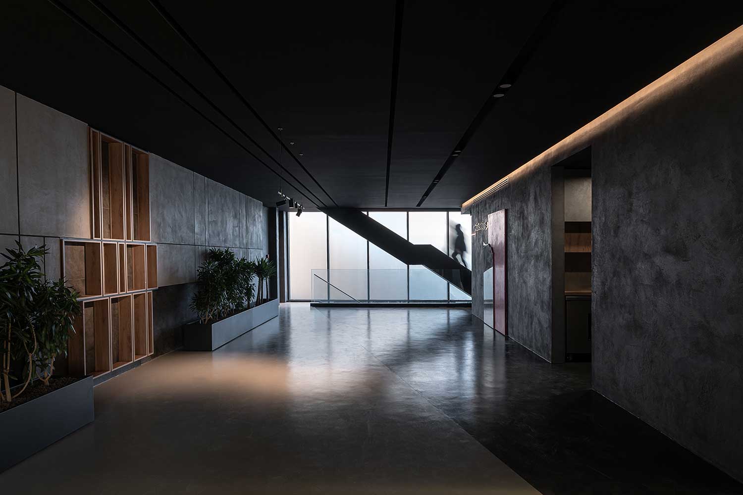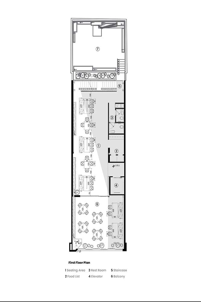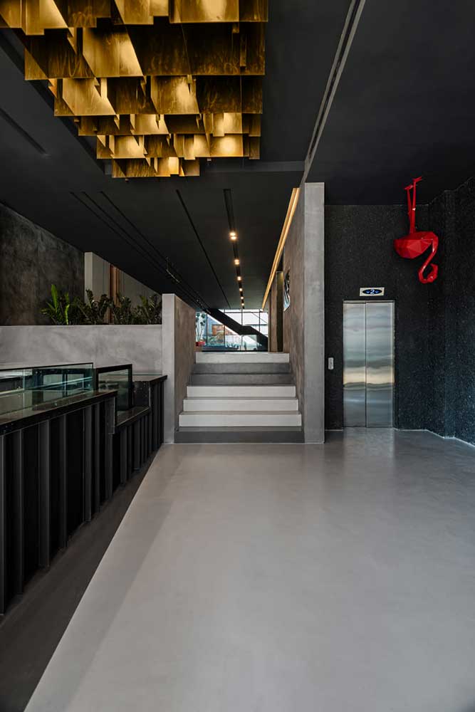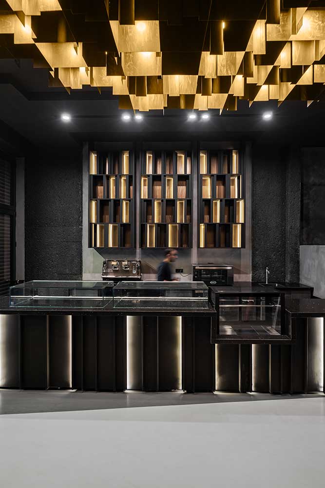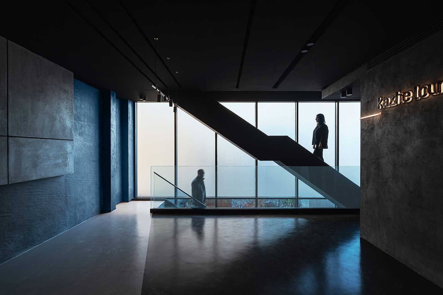 Kazhe Lounge is a restaurant-café set on three floors for relaxation. Relaxation in a contrasting atmosphere. Contrasted with the hot, bright and desert of Qom – a dark, cool and green atmosphere. Contrast became the first key word and the basis of our design. A contrast in the atmosphere of the cafe that is complete in the cohabitation of the city.The project was designed in two general phases. In the first phase, by changing the use of a residential property to commercial, flat and uniform spaces were created on the floors. An attractive staircase was designed to access the floors. This approach provided a flexible and practical space for various activities. In the second phase, the employer chose the use of the restaurant cafe for the project. A restaurant that is more than the existing restaurants in Qom. kazhe Lounge became more than a simple restaurant cafe, it became a multi-purpose space. The main goal was to create a platform that, while responding to the various needs of citizens, does not encourage them to travel outside the city. Contrasting design with a desert city: The interior elements of kazhe Lounge were designed in complete contrast to the desert environment of Qom city. This contrast was created in the cold and dark colors chosen for the spaces, in the broken and right-angled form in contrast with the soft forms of the desert, and in the comfort and coolness of the vegetations. This contrast appeared in the color of the floor as a broken line and separated the sitting and moving spaces in two different colors. After that, the intertwined pieces of iron sheet created a unique chandelier, which as an inviting element, it encouraged the audience to discover the atmosphere of the lounge. This chandelier, with its half bright and half dark appearance, created a sense of mystery and curiosity upon entering the space. This chandelier spreads over two floors and connects the floors. For different spatial experiences, different range of spaces were considered, spaces were designed in categories of closed, semi-open and open spaces. The quality that attracts the audience in the restaurant space and makes them come many times to experience different corners. Sculptural element, flamingo: the design scenario of the lounge cage needed an attractive character to nest in this space and surprise the audience with its presence. Therefore, they used details and elements inspired by flamingos in different spaces of kazhe Lounge. This beautiful and special bird was a symbol of freedom and travel and it doubled the charm of the space. The color of this element moved in different spaces and sewed the spaces together like an invisible string. Finally, kazhe Lounge was an attempt to create different and yet interconnected spaces. The different floors of this collection, by maintaining continuity and coherence, acquired a unique and distinct quality. By offering a different and relaxing atmosphere, Kazhe Lounge became a refuge for Qom citizens and invited them to a pure sensual experience in the heart of the desert.