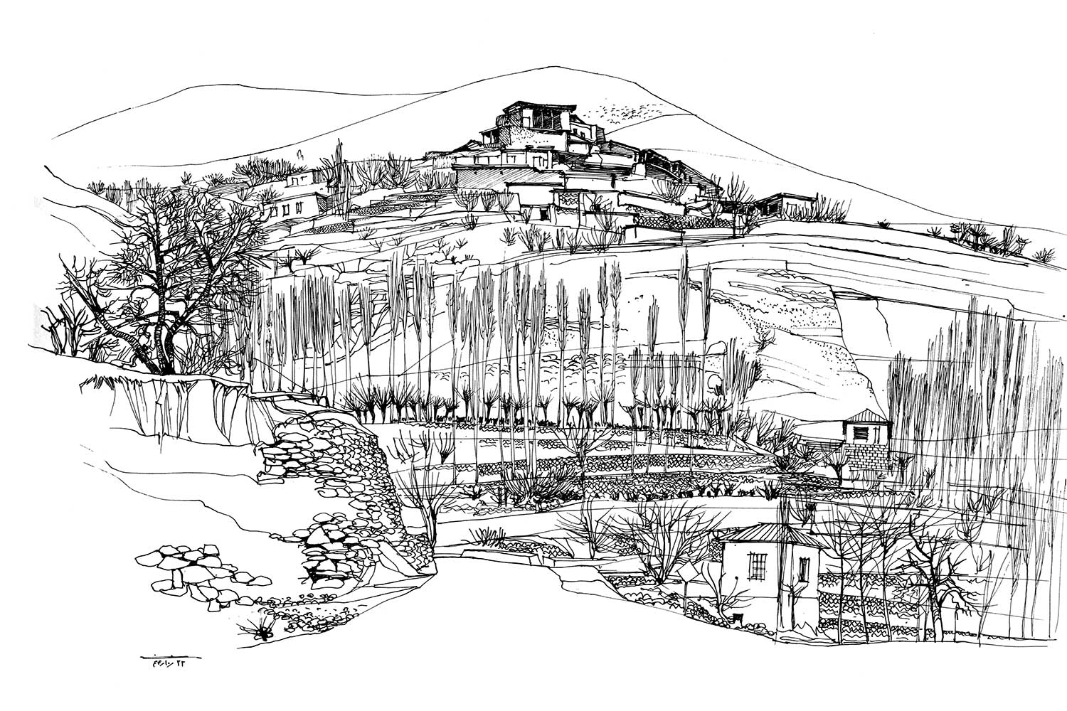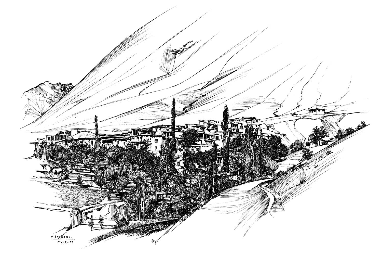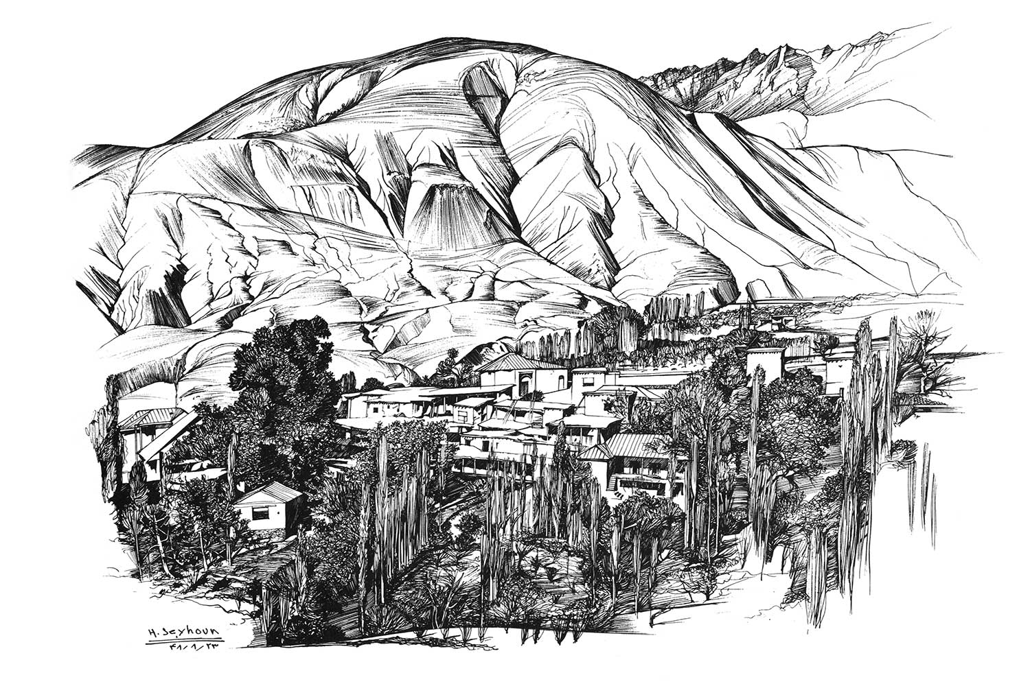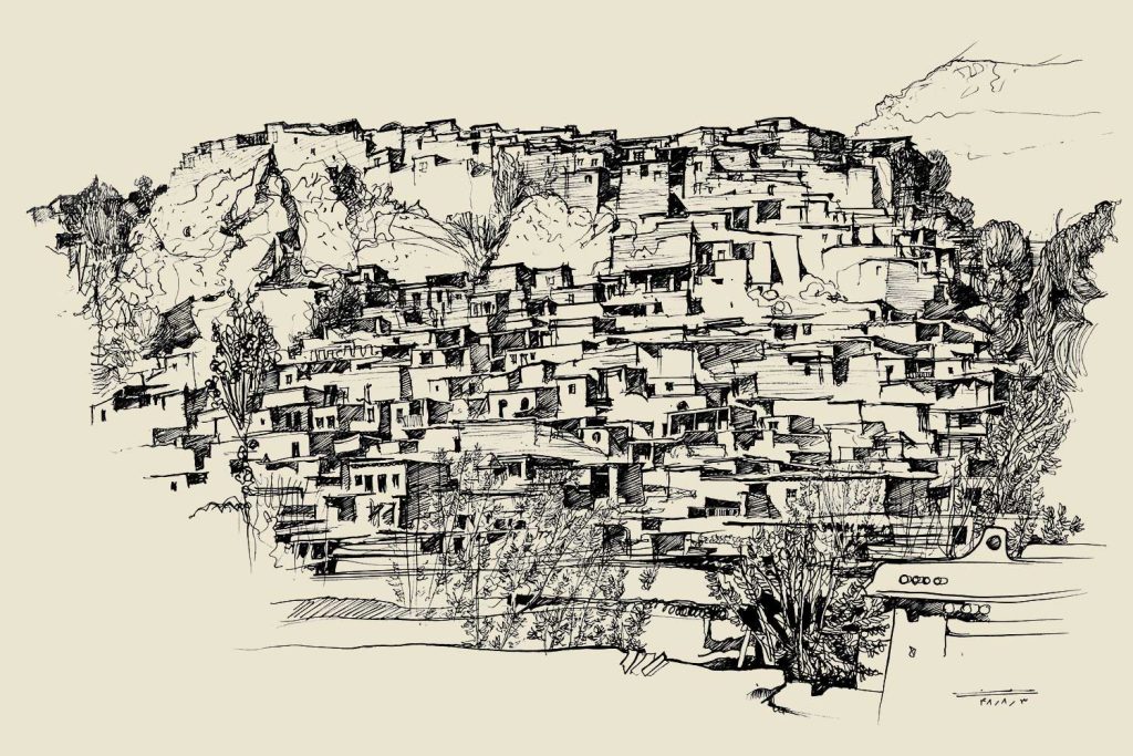 منظرهای از غروب یک دهکده، با خانههایی که با فرمهای کاملا هندسی ساخته شدهاند، حسنَکدَر