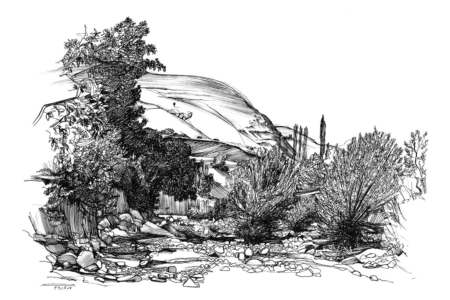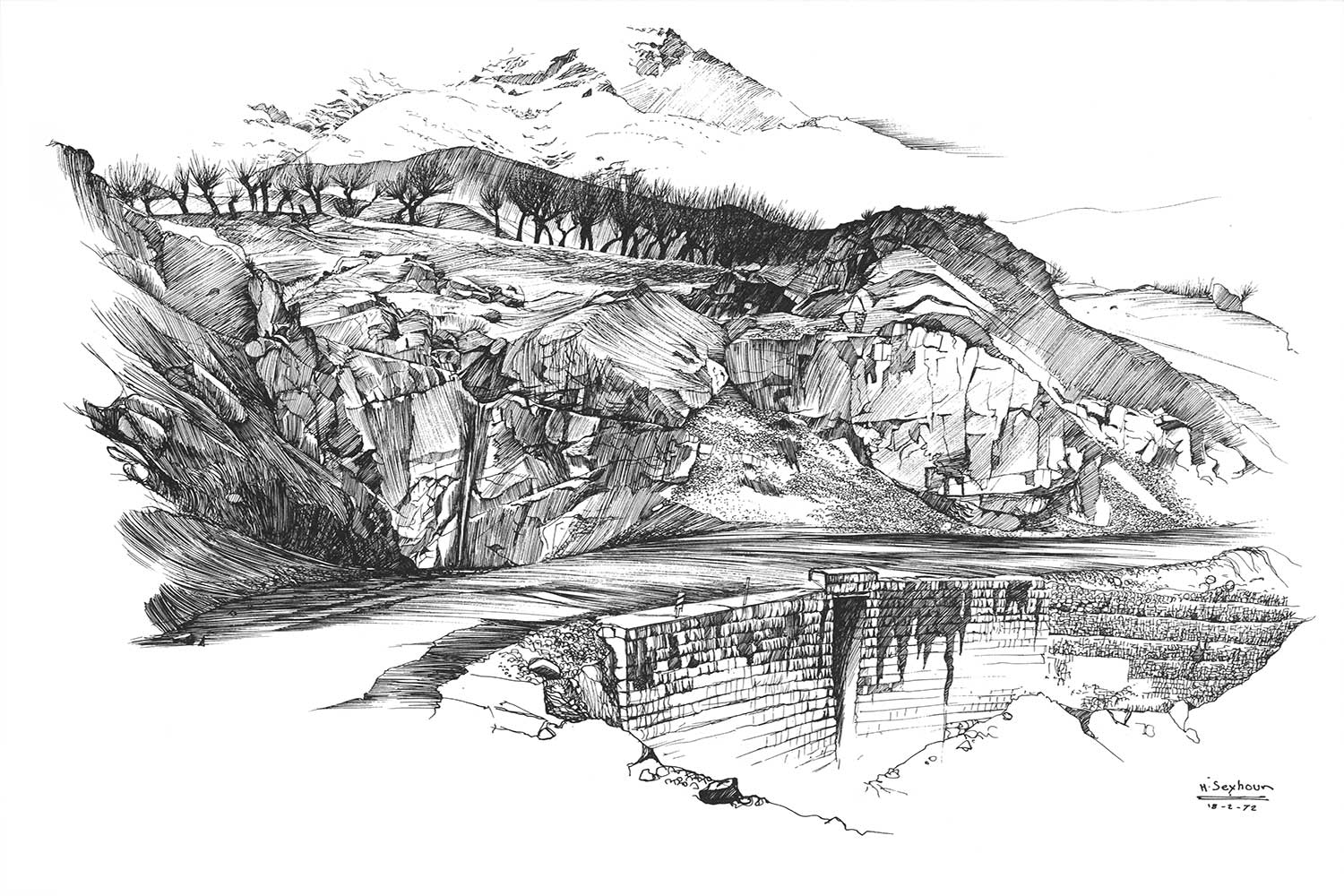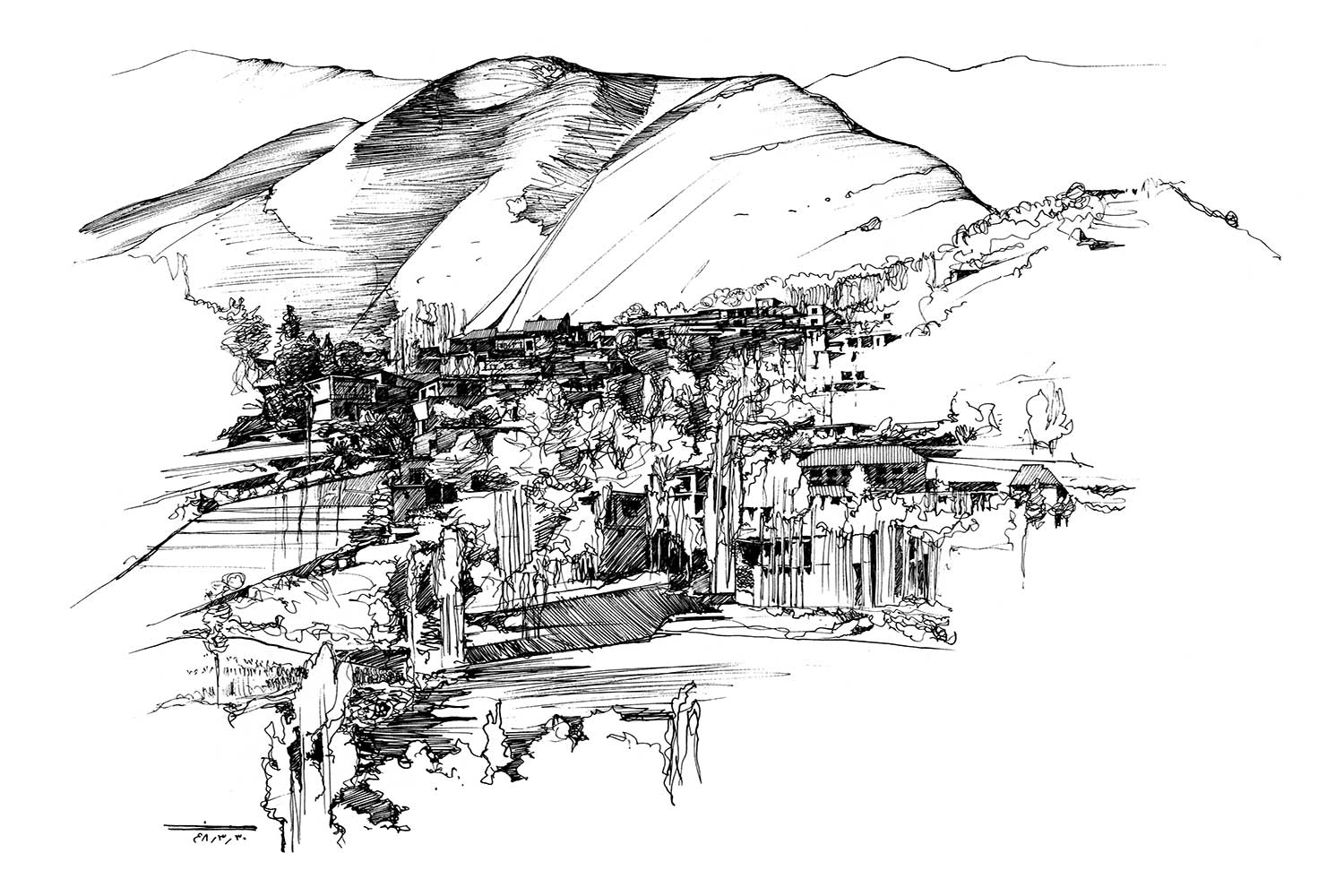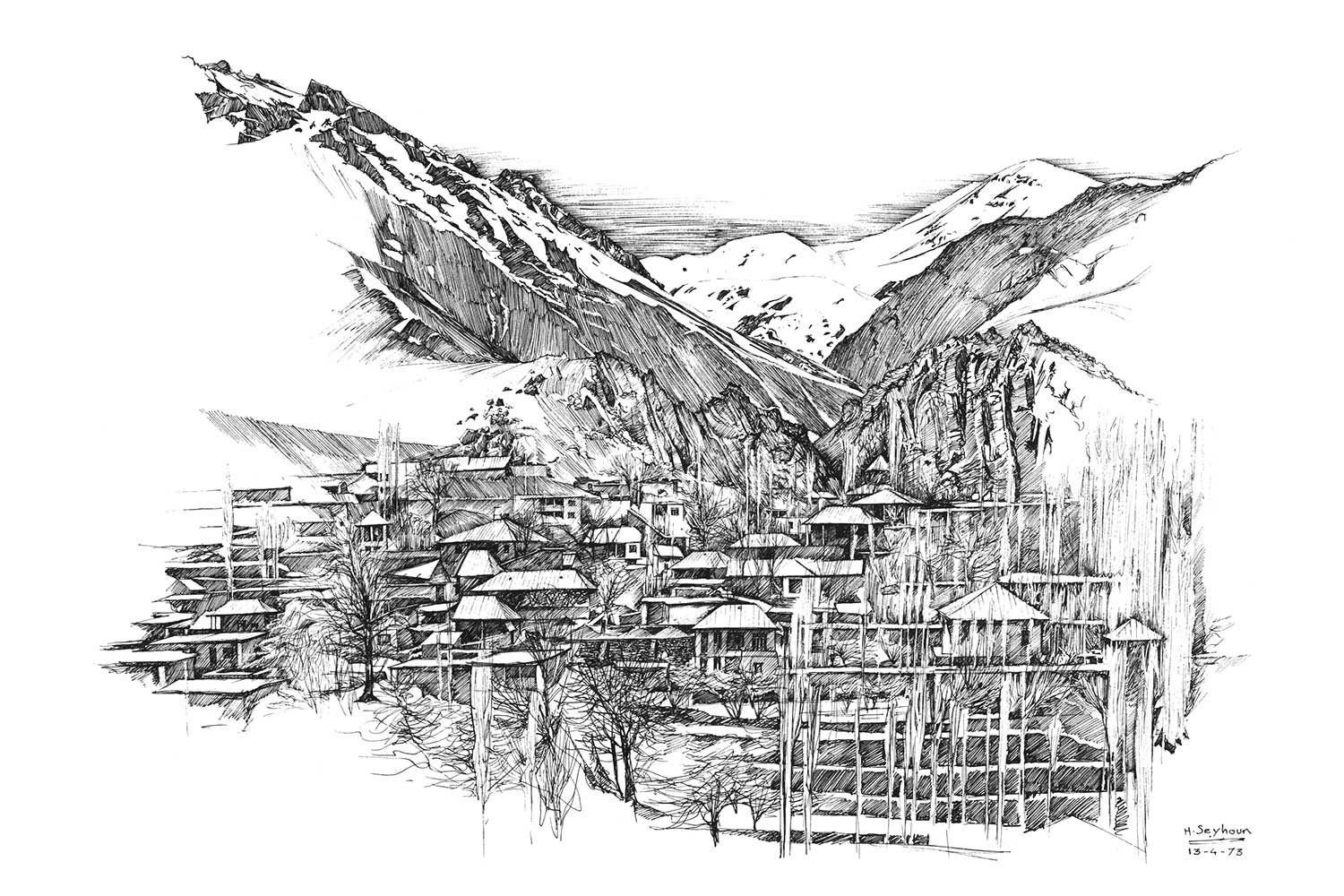 منظرهای از غروب یک دهکده، با خانههایی که با فرمهای کاملا هندسی ساخته شدهاند، حسنَکدَر