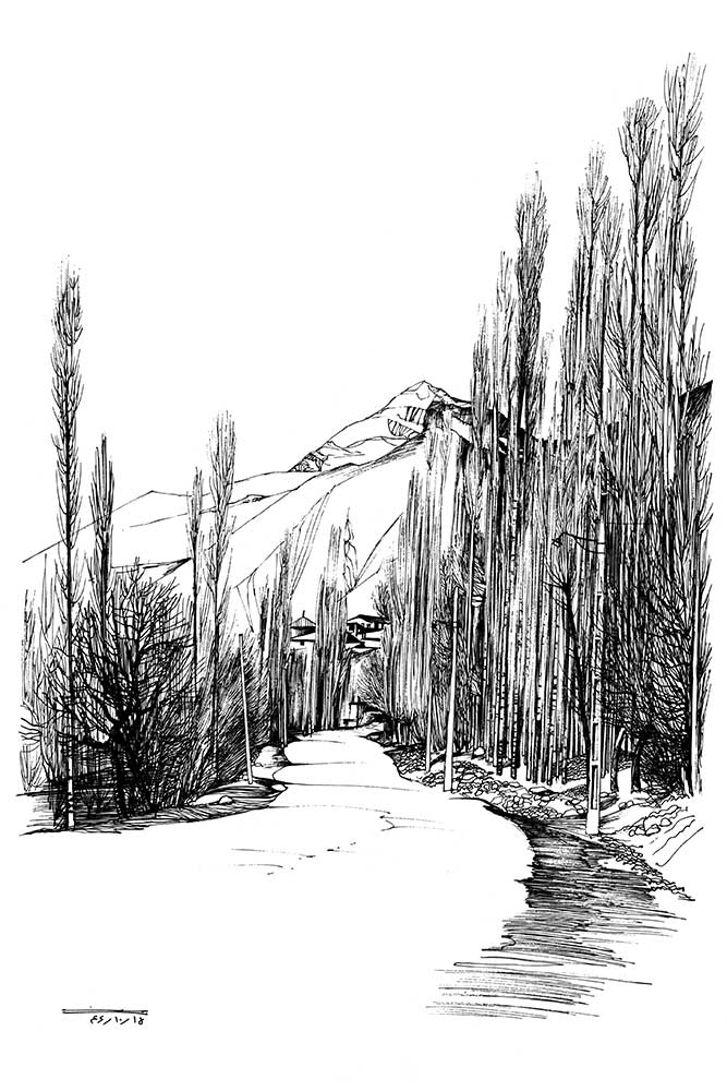 یک جاده با ردیفی از درختان سپیدار در حاشیهی جاده، نزدیک تهران و به سمت فشم