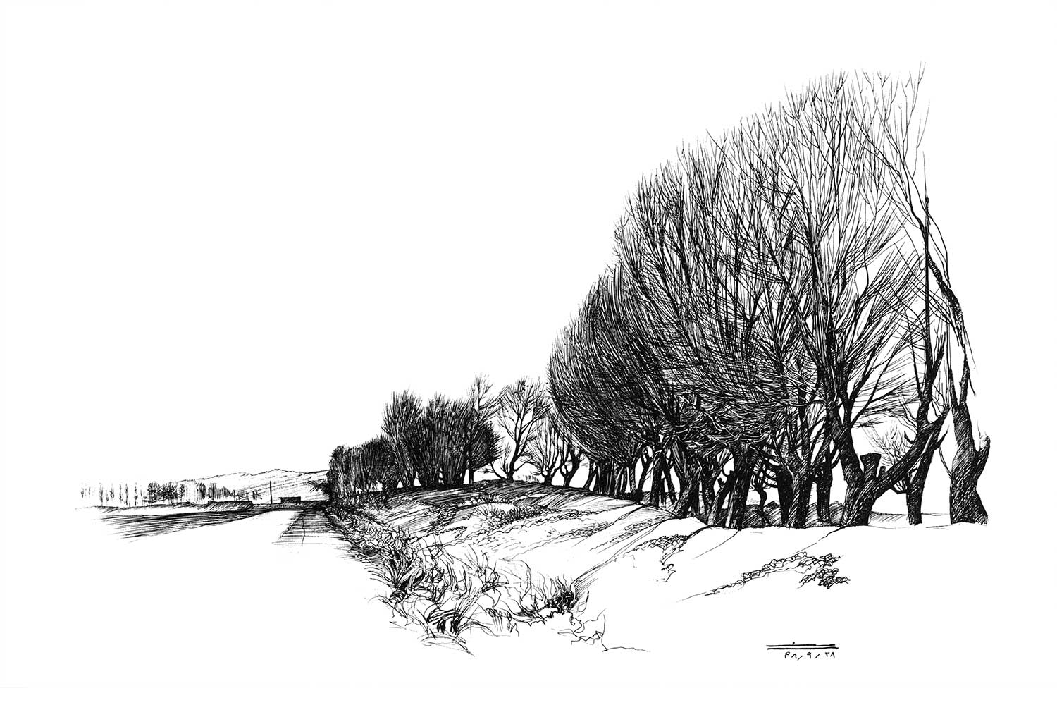 منظرهای از درختان برهنه در زمستان، جادهای به سمت فشم