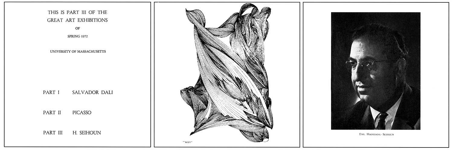 بروشور نمایشگاه آثار هوشنگ سیحون در کنار آثار پیکاسو و سالوادور دالی در دانشگاه ماساچوست آمریکا، 1972