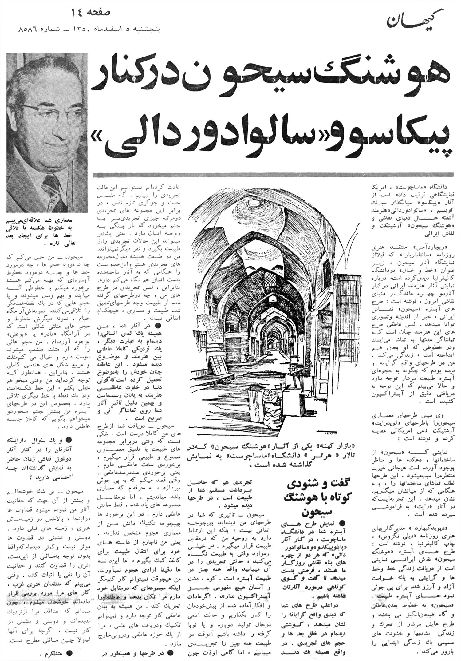 Following exhibitions at the University of California, Santa Barbara, and the University of Massachusetts, Ettela’at and Kayhan newspapers published detailed reviews. Ettela’at wrote: “Recently, an exhibition titled Line and Imagination was held in Santa Barbara (Los Angeles, California). These works, which evoked Iran’s vernacular architecture, were presented alongside Frank Lloyd Wright’s architectural sketches. One critic noted: ‘Seyhoun’s architectural drawings impress the viewer far more than Wright’s. While Wright’s sketches are tied to calculation and construction, they cannot capture the spatial spirit that Seyhoun’s works convey. Through Seyhoun’s drawings, we gain the experience of inhabiting architecture itself.’”