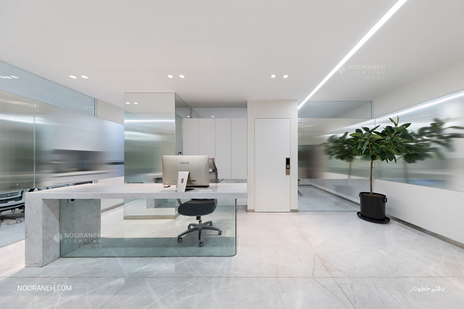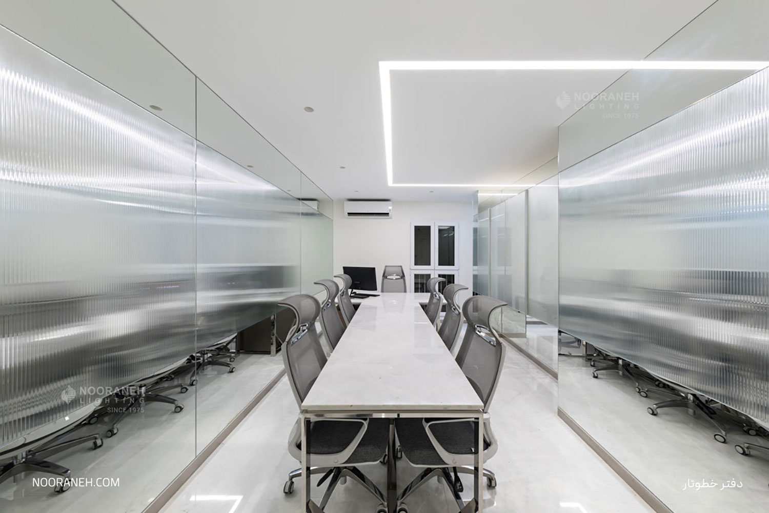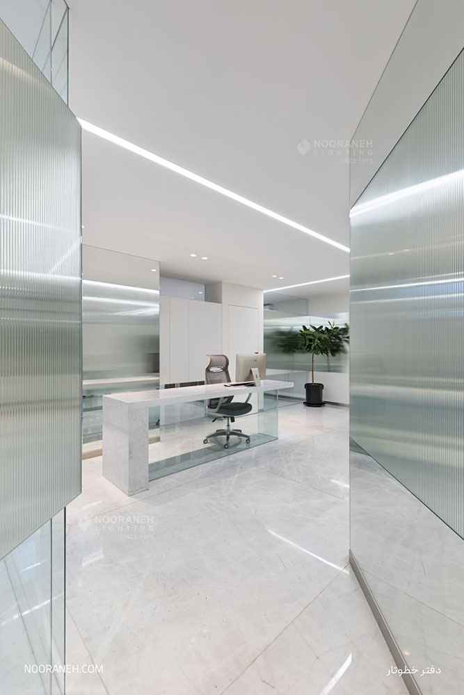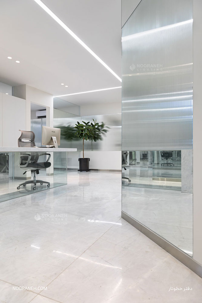 در دفتر اداری شرکت خطوتار از چراغ های خطی نورانه جهت تامین روشنایی عمومی فضا استفاده شده است. چراغ های خطی با بدنه آلومینیومی در رنگ های متنوع با پوشش آبکاری نقره ای و با ماژول های ال ای دی و درایور اروپایی تولید و عرضه می گردند. همچنین جهت نور تکمیلی فضا از چراغ های دارک لایت تریمو استفاده شده است.